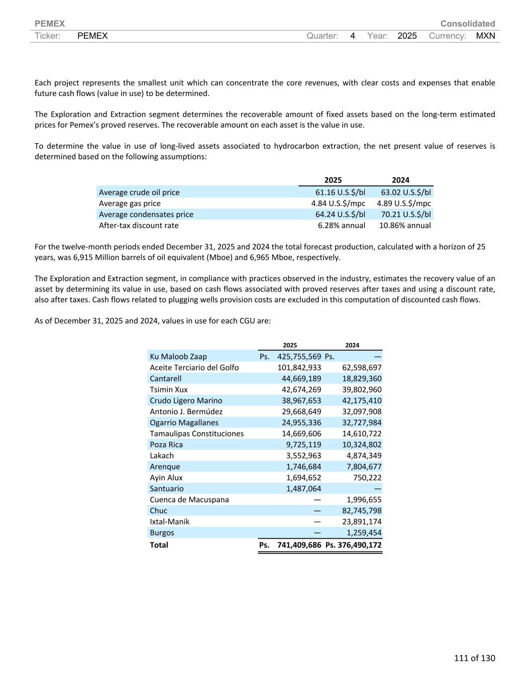 PEMEX Consolidated Ticker: PEMEX Quarter: 4 Year: 2025 Currency: MXN 111 of 130 Each project represents the smallest unit which can concentrate the core revenues, with clear costs and expenses that enable future cash flows (value in use) to be determined. The Exploration and Extraction segment determines the recoverable amount of fixed assets based on the long-term estimated prices for Pemex’s proved reserves. The recoverable amount on each asset is the value in use. To determine the value in use of long-lived assets associated to hydrocarbon extraction, the net present value of reserves is determined based on the following assumptions: 2025 2024 Average crude oil price 61.16 U.S.$/bl 63.02 U.S.$/bl Average gas price 4.84 U.S.$/mpc 4.89 U.S.$/mpc Average condensates price 64.24 U.S.$/bl 70.21 U.S.$/bl After-tax discount rate 6.28% annual 10.86% annual For the twelve-month periods ended December 31, 2025 and 2024 the total forecast production, calculated with a horizon of 25 years, was 6,915 Million barrels of oil equivalent (Mboe) and 6,965 Mboe, respectively. The Exploration and Extraction segment, in compliance with practices observed in the industry, estimates the recovery value of an asset by determining its value in use, based on cash flows associated with proved reserves after taxes and using a discount rate, also after taxes. Cash flows related to plugging wells provision costs are excluded in this computation of discounted cash flows. As of December 31, 2025 and 2024, values in use for each CGU are: 2025 2024 Ku Maloob Zaap Ps. 425,755,569 Ps. — Aceite Terciario del Golfo 101,842,933 62,598,697 Cantarell 44,669,189 18,829,360 Tsimin Xux 42,674,269 39,802,960 Crudo Ligero Marino 38,967,653 42,175,410 Antonio J. Bermúdez 29,668,649 32,097,908 Ogarrio Magallanes 24,955,336 32,727,984 Tamaulipas Constituciones 14,669,606 14,610,722 Poza Rica 9,725,119 10,324,802 Lakach 3,552,963 4,874,349 Arenque 1,746,684 7,804,677 Ayin Alux 1,694,652 750,222 Santuario 1,487,064 — Cuenca de Macuspana — 1,996,655 Chuc — 82,745,798 Ixtal-Manik — 23,891,174 Burgos — 1,259,454 Total Ps. 741,409,686 Ps. 376,490,172