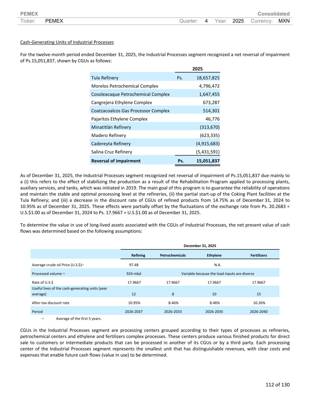 PEMEX Consolidated Ticker: PEMEX Quarter: 4 Year: 2025 Currency: MXN 112 of 130 Cash-Generating Units of Industrial Processes For the twelve-month period ended December 31, 2025, the Industrial Processes segment recognized a net reversal of impairment of Ps.15,051,837, shown by CGUs as follows: 2025 Tula Refinery Ps. 18,657,825 Morelos Petrochemical Complex 4,796,472 Cosoleacaque Petrochemical Complex 1,647,455 Cangrejera Ethylene Complex 673,287 Coatzacoalcos Gas Processor Complex 514,301 Pajaritos Ethylene Complex 46,776 Minatitlán Refinery (313,670) Madero Refinery (623,335) Cadereyta Refinery (4,915,683) Salina Cruz Refinery (5,431,591) Reversal of impairment Ps. 15,051,837 As of December 31, 2025, the Industrial Processes segment recognized net reversal of impairment of Ps.15,051,837 due mainly to a (i) this refers to the effect of stabilizing the production as a result of the Rehabilitation Program applied to processing plants, auxiliary services, and tanks, which was initiated in 2019. The main goal of this program is to guarantee the reliability of operations and maintain the stable and optimal processing level at the refineries, (ii) the partial start-up of the Coking Plant facilities at the Tula Refinery; and (iii) a decrease in the discount rate of CGUs of refined products from 14.75% as of December 31, 2024 to 10.95% as of December 31, 2025. These effects were partially offset by the fluctuations of the exchange rate from Ps. 20.2683 = U.S.$1.00 as of December 31, 2024 to Ps. 17.9667 = U.S.$1.00 as of December 31, 2025. To determine the value in use of long-lived assets associated with the CGUs of Industrial Processes, the net present value of cash flows was determined based on the following assumptions: December 31, 2025 Refining Petrochemicals Ethylene Fertilizers Average crude oil Price (U.S.$)(1) 97.48 N.A. Processed volume (1) 924 mbd Variable because the load inputs are diverse Rate of U.S.$ 17.9667 17.9667 17.9667 17.9667 Useful lives of the cash-generating units (year average) 12 8 10 15 After-tax discount rate 10.95% 8.46% 8.46% 10.26% Period 2026-2037 2026-2033 2026-2035 2026-2040 (1) Average of the first 5 years. CGUs in the Industrial Processes segment are processing centers grouped according to their types of processes as refineries, petrochemical centers and ethylene and fertilizers complex processes. These centers produce various finished products for direct sale to customers or intermediate products that can be processed in another of its CGUs or by a third party. Each processing center of the Industrial Processes segment represents the smallest unit that has distinguishable revenues, with clear costs and expenses that enable future cash flows (value in use) to be determined.