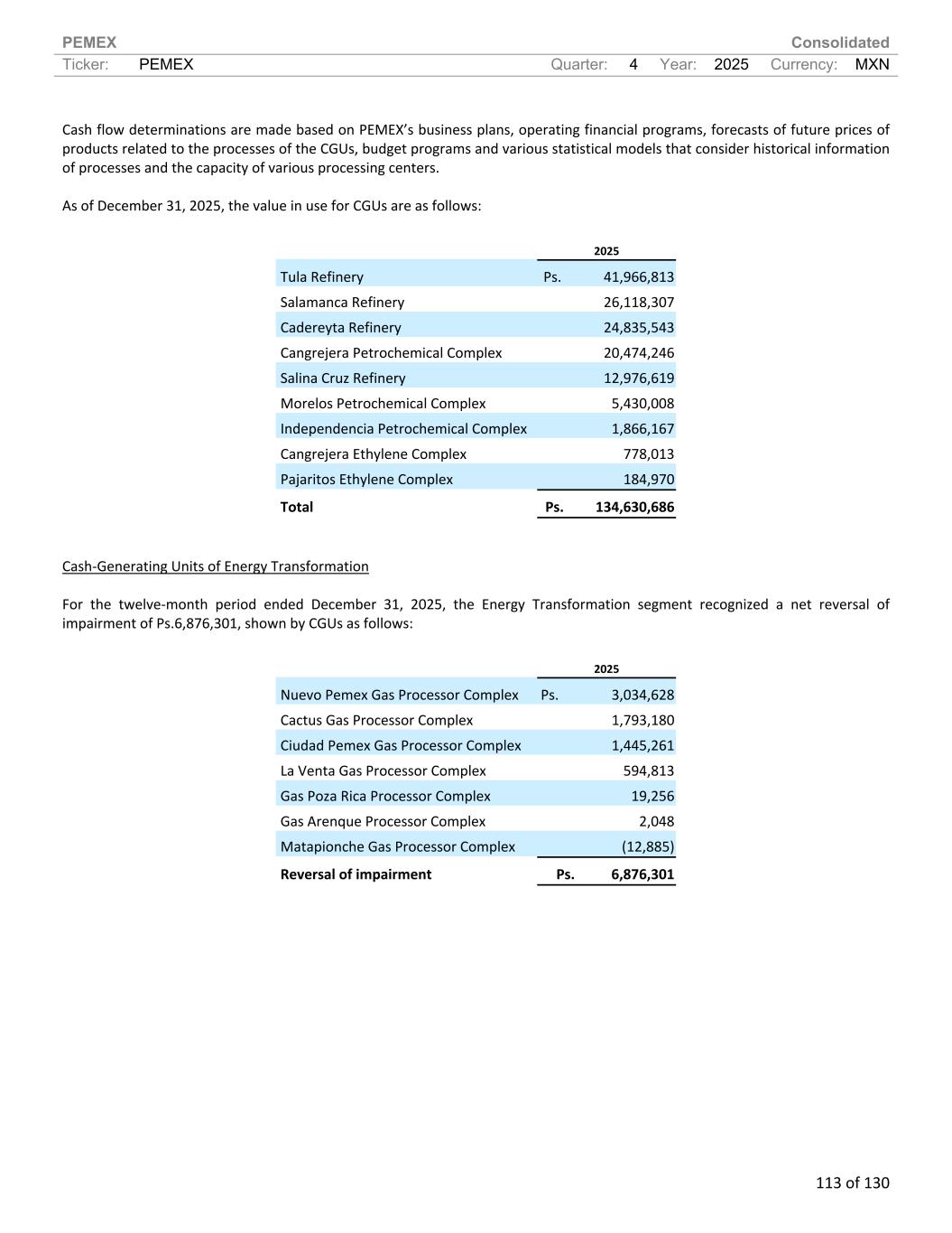 PEMEX Consolidated Ticker: PEMEX Quarter: 4 Year: 2025 Currency: MXN 113 of 130 Cash flow determinations are made based on PEMEX’s business plans, operating financial programs, forecasts of future prices of products related to the processes of the CGUs, budget programs and various statistical models that consider historical information of processes and the capacity of various processing centers. As of December 31, 2025, the value in use for CGUs are as follows: 2025 Tula Refinery Ps. 41,966,813 Salamanca Refinery 26,118,307 Cadereyta Refinery 24,835,543 Cangrejera Petrochemical Complex 20,474,246 Salina Cruz Refinery 12,976,619 Morelos Petrochemical Complex 5,430,008 Independencia Petrochemical Complex 1,866,167 Cangrejera Ethylene Complex 778,013 Pajaritos Ethylene Complex 184,970 Total Ps. 134,630,686 Cash-Generating Units of Energy Transformation For the twelve-month period ended December 31, 2025, the Energy Transformation segment recognized a net reversal of impairment of Ps.6,876,301, shown by CGUs as follows: 2025 Nuevo Pemex Gas Processor Complex Ps. 3,034,628 Cactus Gas Processor Complex 1,793,180 Ciudad Pemex Gas Processor Complex 1,445,261 La Venta Gas Processor Complex 594,813 Gas Poza Rica Processor Complex 19,256 Gas Arenque Processor Complex 2,048 Matapionche Gas Processor Complex (12,885) Reversal of impairment Ps. 6,876,301
