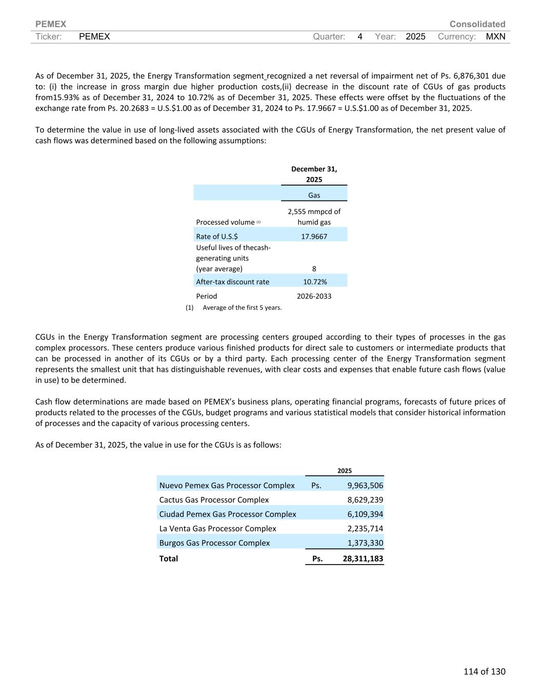 PEMEX Consolidated Ticker: PEMEX Quarter: 4 Year: 2025 Currency: MXN 114 of 130 As of December 31, 2025, the Energy Transformation segment recognized a net reversal of impairment net of Ps. 6,876,301 due to: (i) the increase in gross margin due higher production costs,(ii) decrease in the discount rate of CGUs of gas products from15.93% as of December 31, 2024 to 10.72% as of December 31, 2025. These effects were offset by the fluctuations of the exchange rate from Ps. 20.2683 = U.S.$1.00 as of December 31, 2024 to Ps. 17.9667 = U.S.$1.00 as of December 31, 2025. To determine the value in use of long-lived assets associated with the CGUs of Energy Transformation, the net present value of cash flows was determined based on the following assumptions: December 31, 2025 Gas Processed volume (1) 2,555 mmpcd of humid gas Rate of U.S.$ 17.9667 Useful lives of thecash- generating units (year average) 8 After-tax discount rate 10.72% Period 2026-2033 (1) Average of the first 5 years. CGUs in the Energy Transformation segment are processing centers grouped according to their types of processes in the gas complex processors. These centers produce various finished products for direct sale to customers or intermediate products that can be processed in another of its CGUs or by a third party. Each processing center of the Energy Transformation segment represents the smallest unit that has distinguishable revenues, with clear costs and expenses that enable future cash flows (value in use) to be determined. Cash flow determinations are made based on PEMEX’s business plans, operating financial programs, forecasts of future prices of products related to the processes of the CGUs, budget programs and various statistical models that consider historical information of processes and the capacity of various processing centers. As of December 31, 2025, the value in use for the CGUs is as follows: 2025 Nuevo Pemex Gas Processor Complex Ps. 9,963,506 Cactus Gas Processor Complex 8,629,239 Ciudad Pemex Gas Processor Complex 6,109,394 La Venta Gas Processor Complex 2,235,714 Burgos Gas Processor Complex 1,373,330 Total Ps. 28,311,183