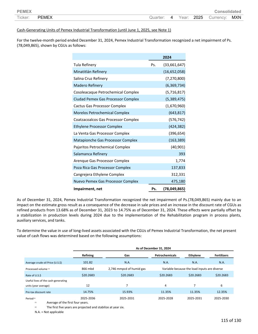 PEMEX Consolidated Ticker: PEMEX Quarter: 4 Year: 2025 Currency: MXN 115 of 130 Cash-Generating Units of Pemex Industrial Transformation (until June 1, 2025, see Note 1) For the twelve-month period ended December 31, 2024, Pemex Industrial Transformation recognized a net impairment of Ps. (78,049,865), shown by CGUs as follows: 2024 Tula Refinery Ps. (33,661,647) Minatitlán Refinery (16,652,058) Salina Cruz Refinery (7,270,800) Madero Refinery (6,369,734) Cosoleacaque Petrochemical Complex (5,716,817) Ciudad Pemex Gas Processor Complex (5,389,475) Cactus Gas Processor Complex (1,670,960) Morelos Petrochemical Complex (643,817) Coatzacoalcos Gas Processor Complex (576,742) Ethylene Processor Complex (424,382) La Venta Gas Processor Complex (396,654) Matapionche Gas Processor Complex (163,389) Pajaritos Petrochemical Complex (40,901) Salamanca Refinery 393 Arenque Gas Processor Complex 1,774 Poza Rica Gas Processor Complex 137,833 Cangrejera Ethylene Complex 312,331 Nuevo Pemex Gas Processor Complex 475,180 Impairment, net Ps. (78,049,865) As of December 31, 2024, Pemex Industrial Transformation recognized the net impairment of Ps.(78,049,865) mainly due to an impact on the estimate gross result as a consequence of the decrease in sale prices and an increase in the discount rate of CGUs as refined products from 13.68% as of December 31, 2023 to 14.75% as of December 31, 2024. These effects were partially offset by a stabilization in production levels during 2024 due to the implementation of the Rehabilitation program in process plants, auxiliary services, and tanks. To determine the value in use of long-lived assets associated with the CGUs of Pemex Industrial Transformation, the net present value of cash flows was determined based on the following assumptions: As of December 31, 2024 Refining Gas Petrochemicals Ethylene Fertilizers Average crude oil Price (U.S.$) 101.82 N.A. N.A. N.A. N.A. Processed volume (1) 866 mbd 2,746 mmpcd of humid gas Variable because the load inputs are diverse Rate of U.S.$ $20.2683 $20.2683 $20.2683 $20.2683 $20.2683 Useful lives of the cash-generating units (year average) 12 7 4 7 6 Pre-tax discount rate 14.75% 15.93% 11.35% 11.35% 12.35% Period (2) 2025-2036 2025-2031 2025-2028 2025-2031 2025-2030 (1) Average of the first four years. (2) The first five years are projected and stabilize at year six. N.A. = Not applicable