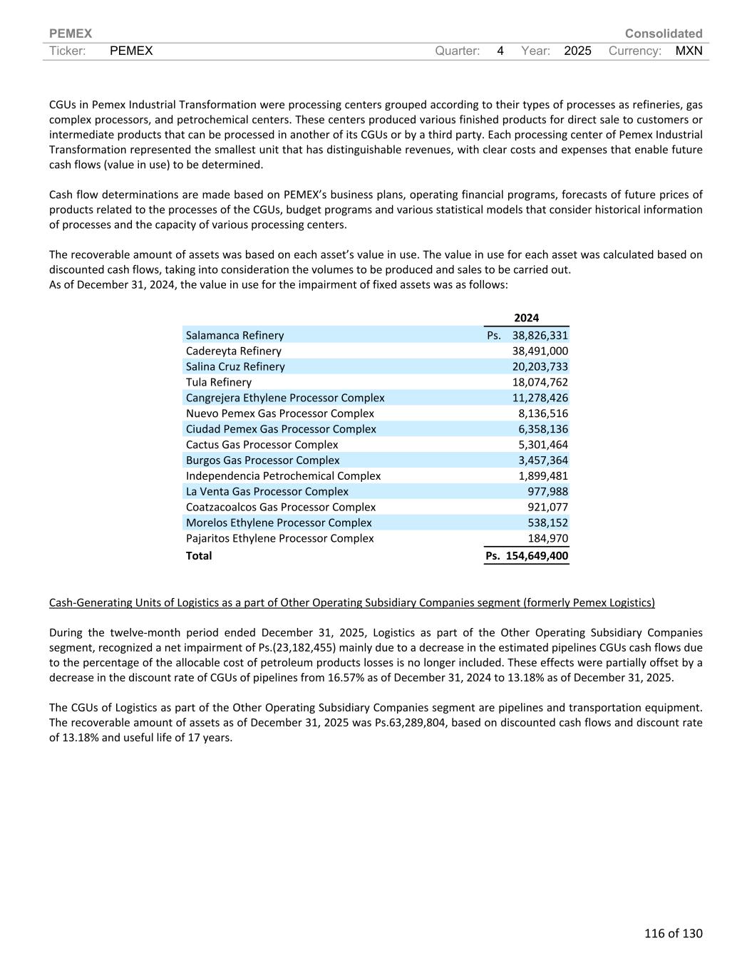 PEMEX Consolidated Ticker: PEMEX Quarter: 4 Year: 2025 Currency: MXN 116 of 130 CGUs in Pemex Industrial Transformation were processing centers grouped according to their types of processes as refineries, gas complex processors, and petrochemical centers. These centers produced various finished products for direct sale to customers or intermediate products that can be processed in another of its CGUs or by a third party. Each processing center of Pemex Industrial Transformation represented the smallest unit that has distinguishable revenues, with clear costs and expenses that enable future cash flows (value in use) to be determined. Cash flow determinations are made based on PEMEX’s business plans, operating financial programs, forecasts of future prices of products related to the processes of the CGUs, budget programs and various statistical models that consider historical information of processes and the capacity of various processing centers. The recoverable amount of assets was based on each asset’s value in use. The value in use for each asset was calculated based on discounted cash flows, taking into consideration the volumes to be produced and sales to be carried out. As of December 31, 2024, the value in use for the impairment of fixed assets was as follows: 2024 Salamanca Refinery Ps. 38,826,331 Cadereyta Refinery 38,491,000 Salina Cruz Refinery 20,203,733 Tula Refinery 18,074,762 Cangrejera Ethylene Processor Complex 11,278,426 Nuevo Pemex Gas Processor Complex 8,136,516 Ciudad Pemex Gas Processor Complex 6,358,136 Cactus Gas Processor Complex 5,301,464 Burgos Gas Processor Complex 3,457,364 Independencia Petrochemical Complex 1,899,481 La Venta Gas Processor Complex 977,988 Coatzacoalcos Gas Processor Complex 921,077 Morelos Ethylene Processor Complex 538,152 Pajaritos Ethylene Processor Complex 184,970 Total Ps. 154,649,400 Cash-Generating Units of Logistics as a part of Other Operating Subsidiary Companies segment (formerly Pemex Logistics) During the twelve-month period ended December 31, 2025, Logistics as part of the Other Operating Subsidiary Companies segment, recognized a net impairment of Ps.(23,182,455) mainly due to a decrease in the estimated pipelines CGUs cash flows due to the percentage of the allocable cost of petroleum products losses is no longer included. These effects were partially offset by a decrease in the discount rate of CGUs of pipelines from 16.57% as of December 31, 2024 to 13.18% as of December 31, 2025. The CGUs of Logistics as part of the Other Operating Subsidiary Companies segment are pipelines and transportation equipment. The recoverable amount of assets as of December 31, 2025 was Ps.63,289,804, based on discounted cash flows and discount rate of 13.18% and useful life of 17 years.