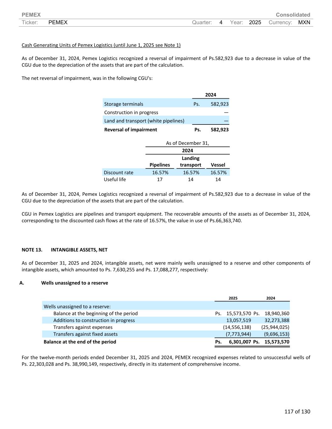 PEMEX Consolidated Ticker: PEMEX Quarter: 4 Year: 2025 Currency: MXN 117 of 130 Cash Generating Units of Pemex Logistics (until June 1, 2025 see Note 1) As of December 31, 2024, Pemex Logistics recognized a reversal of impairment of Ps.582,923 due to a decrease in value of the CGU due to the depreciation of the assets that are part of the calculation. The net reversal of impairment, was in the following CGU's: 2024 Storage terminals Ps. 582,923 Construction in progress — Land and transport (white pipelines) — Reversal of impairment Ps. 582,923 As of December 31, 2024 Pipelines Landing transport Vessel Discount rate 16.57% 16.57% 16.57% Useful life 17 14 14 As of December 31, 2024, Pemex Logistics recognized a reversal of impairment of Ps.582,923 due to a decrease in value of the CGU due to the depreciation of the assets that are part of the calculation. CGU in Pemex Logistics are pipelines and transport equipment. The recoverable amounts of the assets as of December 31, 2024, corresponding to the discounted cash flows at the rate of 16.57%, the value in use of Ps.66,363,740. NOTE 13. INTANGIBLE ASSETS, NET As of December 31, 2025 and 2024, intangible assets, net were mainly wells unassigned to a reserve and other components of intangible assets, which amounted to Ps. 7,630,255 and Ps. 17,088,277, respectively: A. Wells unassigned to a reserve 2025 2024 Wells unassigned to a reserve: Balance at the beginning of the period Ps. 15,573,570 Ps. 18,940,360 Additions to construction in progress 13,057,519 32,273,388 Transfers against expenses (14,556,138) (25,944,025) Transfers against fixed assets (7,773,944) (9,696,153) Balance at the end of the period Ps. 6,301,007 Ps. 15,573,570 For the twelve-month periods ended December 31, 2025 and 2024, PEMEX recognized expenses related to unsuccessful wells of Ps. 22,303,028 and Ps. 38,990,149, respectively, directly in its statement of comprehensive income.