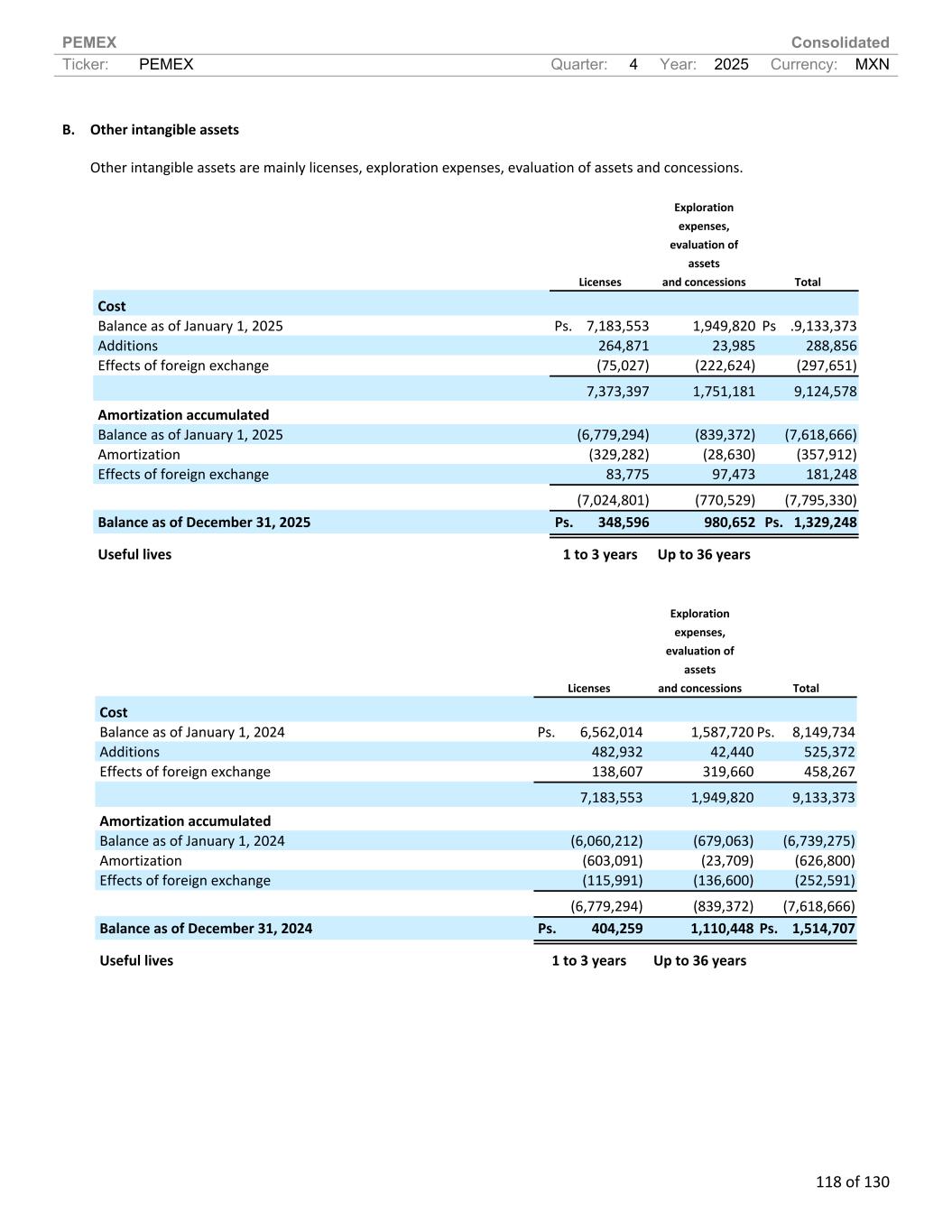 PEMEX Consolidated Ticker: PEMEX Quarter: 4 Year: 2025 Currency: MXN 118 of 130 B. Other intangible assets Other intangible assets are mainly licenses, exploration expenses, evaluation of assets and concessions. Licenses Exploration expenses, evaluation of assets and concessions Total Cost Balance as of January 1, 2025 Ps. 7,183,553 1,949,820 Ps .9,133,373 Additions 264,871 23,985 288,856 Effects of foreign exchange (75,027) (222,624) (297,651) 7,373,397 1,751,181 9,124,578 Amortization accumulated Balance as of January 1, 2025 (6,779,294) (839,372) (7,618,666) Amortization (329,282) (28,630) (357,912) Effects of foreign exchange 83,775 97,473 181,248 (7,024,801) (770,529) (7,795,330) Balance as of December 31, 2025 Ps. 348,596 980,652 Ps. 1,329,248 Useful lives 1 to 3 years Up to 36 years Licenses Exploration expenses, evaluation of assets and concessions Total Cost Balance as of January 1, 2024 Ps. 6,562,014 1,587,720 Ps. 8,149,734 Additions 482,932 42,440 525,372 Effects of foreign exchange 138,607 319,660 458,267 7,183,553 1,949,820 9,133,373 Amortization accumulated Balance as of January 1, 2024 (6,060,212) (679,063) (6,739,275) Amortization (603,091) (23,709) (626,800) Effects of foreign exchange (115,991) (136,600) (252,591) (6,779,294) (839,372) (7,618,666) Balance as of December 31, 2024 Ps. 404,259 1,110,448 Ps. 1,514,707 Useful lives 1 to 3 years Up to 36 years
