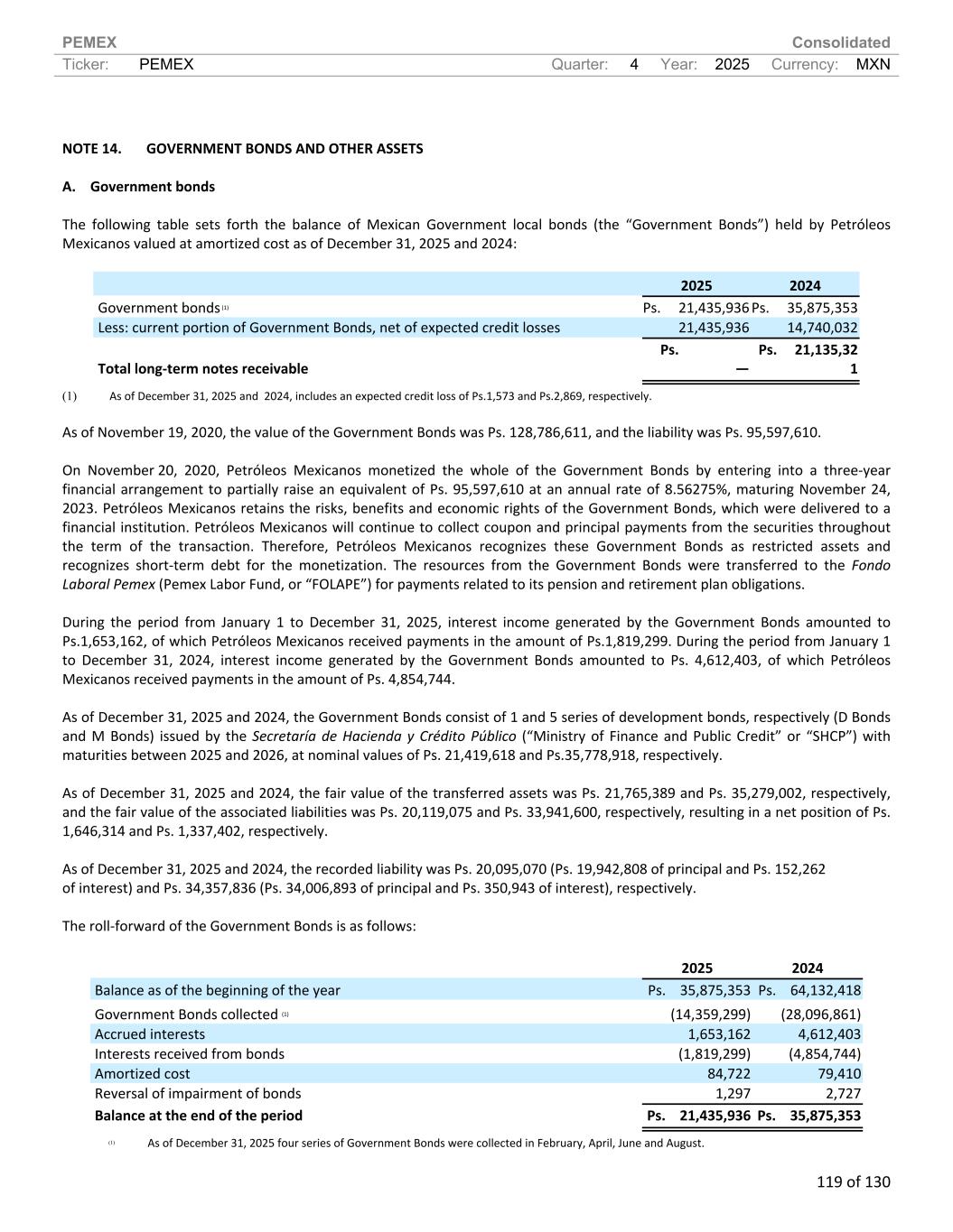 PEMEX Consolidated Ticker: PEMEX Quarter: 4 Year: 2025 Currency: MXN 119 of 130 NOTE 14. GOVERNMENT BONDS AND OTHER ASSETS A. Government bonds The following table sets forth the balance of Mexican Government local bonds (the “Government Bonds”) held by Petróleos Mexicanos valued at amortized cost as of December 31, 2025 and 2024: 2025 2024 Government bonds (1) Ps. 21,435,936 Ps. 35,875,353 Less: current portion of Government Bonds, net of expected credit losses 21,435,936 14,740,032 Total long-term notes receivable Ps. — Ps. 21,135,32 1 (1) As of December 31, 2025 and 2024, includes an expected credit loss of Ps.1,573 and Ps.2,869, respectively. As of November 19, 2020, the value of the Government Bonds was Ps. 128,786,611, and the liability was Ps. 95,597,610. On November 20, 2020, Petróleos Mexicanos monetized the whole of the Government Bonds by entering into a three-year financial arrangement to partially raise an equivalent of Ps. 95,597,610 at an annual rate of 8.56275%, maturing November 24, 2023. Petróleos Mexicanos retains the risks, benefits and economic rights of the Government Bonds, which were delivered to a financial institution. Petróleos Mexicanos will continue to collect coupon and principal payments from the securities throughout the term of the transaction. Therefore, Petróleos Mexicanos recognizes these Government Bonds as restricted assets and recognizes short-term debt for the monetization. The resources from the Government Bonds were transferred to the Fondo Laboral Pemex (Pemex Labor Fund, or “FOLAPE”) for payments related to its pension and retirement plan obligations. During the period from January 1 to December 31, 2025, interest income generated by the Government Bonds amounted to Ps.1,653,162, of which Petróleos Mexicanos received payments in the amount of Ps.1,819,299. During the period from January 1 to December 31, 2024, interest income generated by the Government Bonds amounted to Ps. 4,612,403, of which Petróleos Mexicanos received payments in the amount of Ps. 4,854,744. As of December 31, 2025 and 2024, the Government Bonds consist of 1 and 5 series of development bonds, respectively (D Bonds and M Bonds) issued by the Secretaría de Hacienda y Crédito Público (“Ministry of Finance and Public Credit” or “SHCP”) with maturities between 2025 and 2026, at nominal values of Ps. 21,419,618 and Ps.35,778,918, respectively. As of December 31, 2025 and 2024, the fair value of the transferred assets was Ps. 21,765,389 and Ps. 35,279,002, respectively, and the fair value of the associated liabilities was Ps. 20,119,075 and Ps. 33,941,600, respectively, resulting in a net position of Ps. 1,646,314 and Ps. 1,337,402, respectively. As of December 31, 2025 and 2024, the recorded liability was Ps. 20,095,070 (Ps. 19,942,808 of principal and Ps. 152,262 of interest) and Ps. 34,357,836 (Ps. 34,006,893 of principal and Ps. 350,943 of interest), respectively. The roll-forward of the Government Bonds is as follows: 2025 2024 Balance as of the beginning of the year Ps. 35,875,353 Ps. 64,132,418 Government Bonds collected (1) (14,359,299) (28,096,861) Accrued interests 1,653,162 4,612,403 Interests received from bonds (1,819,299) (4,854,744) Amortized cost 84,722 79,410 Reversal of impairment of bonds 1,297 2,727 Balance at the end of the period Ps. 21,435,936 Ps. 35,875,353 (1) As of December 31, 2025 four series of Government Bonds were collected in February, April, June and August.