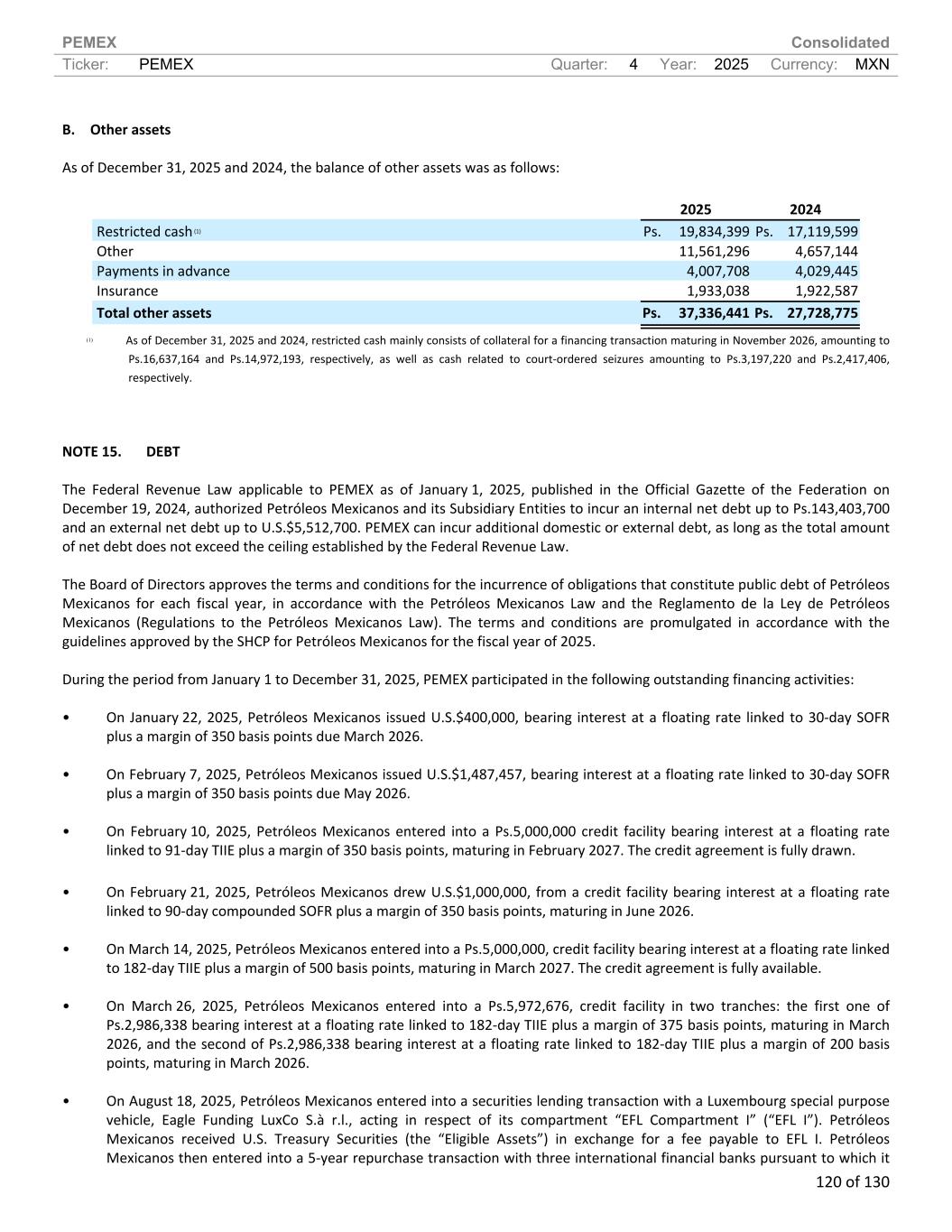 PEMEX Consolidated Ticker: PEMEX Quarter: 4 Year: 2025 Currency: MXN 120 of 130 B. Other assets As of December 31, 2025 and 2024, the balance of other assets was as follows: 2025 2024 Restricted cash (1) Ps. 19,834,399 Ps. 17,119,599 Other 11,561,296 4,657,144 Payments in advance 4,007,708 4,029,445 Insurance 1,933,038 1,922,587 Total other assets Ps. 37,336,441 Ps. 27,728,775 (1) As of December 31, 2025 and 2024, restricted cash mainly consists of collateral for a financing transaction maturing in November 2026, amounting to Ps.16,637,164 and Ps.14,972,193, respectively, as well as cash related to court-ordered seizures amounting to Ps.3,197,220 and Ps.2,417,406, respectively. NOTE 15. DEBT The Federal Revenue Law applicable to PEMEX as of January 1, 2025, published in the Official Gazette of the Federation on December 19, 2024, authorized Petróleos Mexicanos and its Subsidiary Entities to incur an internal net debt up to Ps.143,403,700 and an external net debt up to U.S.$5,512,700. PEMEX can incur additional domestic or external debt, as long as the total amount of net debt does not exceed the ceiling established by the Federal Revenue Law. The Board of Directors approves the terms and conditions for the incurrence of obligations that constitute public debt of Petróleos Mexicanos for each fiscal year, in accordance with the Petróleos Mexicanos Law and the Reglamento de la Ley de Petróleos Mexicanos (Regulations to the Petróleos Mexicanos Law). The terms and conditions are promulgated in accordance with the guidelines approved by the SHCP for Petróleos Mexicanos for the fiscal year of 2025. During the period from January 1 to December 31, 2025, PEMEX participated in the following outstanding financing activities: • On January 22, 2025, Petróleos Mexicanos issued U.S.$400,000, bearing interest at a floating rate linked to 30-day SOFR plus a margin of 350 basis points due March 2026. • On February 7, 2025, Petróleos Mexicanos issued U.S.$1,487,457, bearing interest at a floating rate linked to 30-day SOFR plus a margin of 350 basis points due May 2026. • On February 10, 2025, Petróleos Mexicanos entered into a Ps.5,000,000 credit facility bearing interest at a floating rate linked to 91-day TIIE plus a margin of 350 basis points, maturing in February 2027. The credit agreement is fully drawn. • On February 21, 2025, Petróleos Mexicanos drew U.S.$1,000,000, from a credit facility bearing interest at a floating rate linked to 90-day compounded SOFR plus a margin of 350 basis points, maturing in June 2026. • On March 14, 2025, Petróleos Mexicanos entered into a Ps.5,000,000, credit facility bearing interest at a floating rate linked to 182-day TIIE plus a margin of 500 basis points, maturing in March 2027. The credit agreement is fully available. • On March 26, 2025, Petróleos Mexicanos entered into a Ps.5,972,676, credit facility in two tranches: the first one of Ps.2,986,338 bearing interest at a floating rate linked to 182-day TIIE plus a margin of 375 basis points, maturing in March 2026, and the second of Ps.2,986,338 bearing interest at a floating rate linked to 182-day TIIE plus a margin of 200 basis points, maturing in March 2026. • On August 18, 2025, Petróleos Mexicanos entered into a securities lending transaction with a Luxembourg special purpose vehicle, Eagle Funding LuxCo S.à r.l., acting in respect of its compartment “EFL Compartment I” (“EFL I”). Petróleos Mexicanos received U.S. Treasury Securities (the “Eligible Assets”) in exchange for a fee payable to EFL I. Petróleos Mexicanos then entered into a 5-year repurchase transaction with three international financial banks pursuant to which it