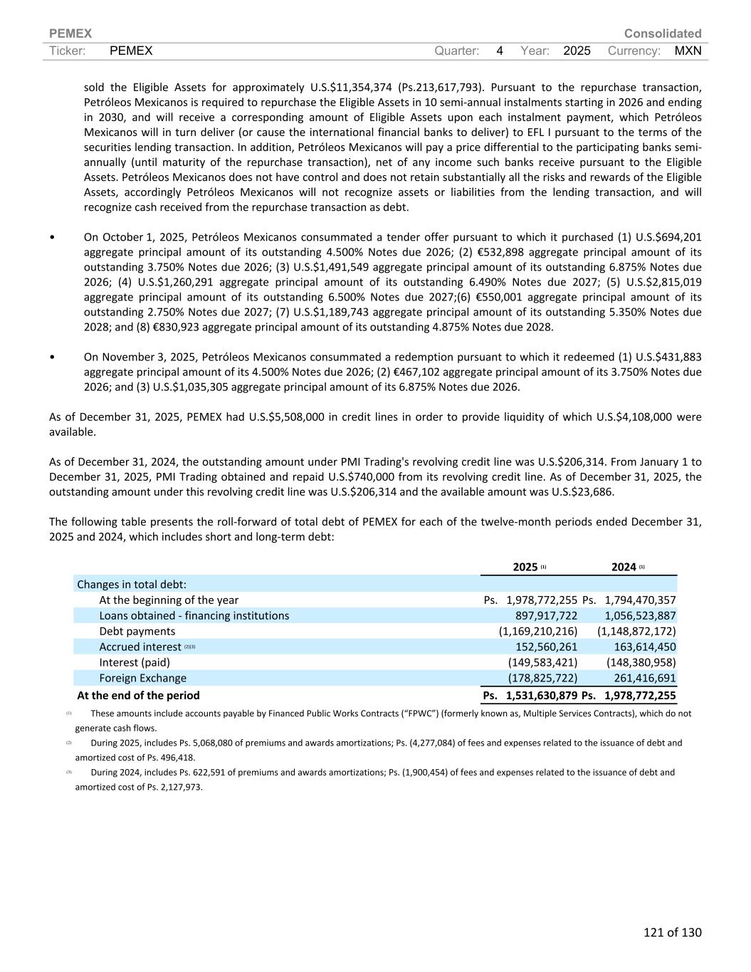 PEMEX Consolidated Ticker: PEMEX Quarter: 4 Year: 2025 Currency: MXN 121 of 130 sold the Eligible Assets for approximately U.S.$11,354,374 (Ps.213,617,793). Pursuant to the repurchase transaction, Petróleos Mexicanos is required to repurchase the Eligible Assets in 10 semi-annual instalments starting in 2026 and ending in 2030, and will receive a corresponding amount of Eligible Assets upon each instalment payment, which Petróleos Mexicanos will in turn deliver (or cause the international financial banks to deliver) to EFL I pursuant to the terms of the securities lending transaction. In addition, Petróleos Mexicanos will pay a price differential to the participating banks semi- annually (until maturity of the repurchase transaction), net of any income such banks receive pursuant to the Eligible Assets. Petróleos Mexicanos does not have control and does not retain substantially all the risks and rewards of the Eligible Assets, accordingly Petróleos Mexicanos will not recognize assets or liabilities from the lending transaction, and will recognize cash received from the repurchase transaction as debt. • On October 1, 2025, Petróleos Mexicanos consummated a tender offer pursuant to which it purchased (1) U.S.$694,201 aggregate principal amount of its outstanding 4.500% Notes due 2026; (2) €532,898 aggregate principal amount of its outstanding 3.750% Notes due 2026; (3) U.S.$1,491,549 aggregate principal amount of its outstanding 6.875% Notes due 2026; (4) U.S.$1,260,291 aggregate principal amount of its outstanding 6.490% Notes due 2027; (5) U.S.$2,815,019 aggregate principal amount of its outstanding 6.500% Notes due 2027;(6) €550,001 aggregate principal amount of its outstanding 2.750% Notes due 2027; (7) U.S.$1,189,743 aggregate principal amount of its outstanding 5.350% Notes due 2028; and (8) €830,923 aggregate principal amount of its outstanding 4.875% Notes due 2028. • On November 3, 2025, Petróleos Mexicanos consummated a redemption pursuant to which it redeemed (1) U.S.$431,883 aggregate principal amount of its 4.500% Notes due 2026; (2) €467,102 aggregate principal amount of its 3.750% Notes due 2026; and (3) U.S.$1,035,305 aggregate principal amount of its 6.875% Notes due 2026. As of December 31, 2025, PEMEX had U.S.$5,508,000 in credit lines in order to provide liquidity of which U.S.$4,108,000 were available. As of December 31, 2024, the outstanding amount under PMI Trading's revolving credit line was U.S.$206,314. From January 1 to December 31, 2025, PMI Trading obtained and repaid U.S.$740,000 from its revolving credit line. As of December 31, 2025, the outstanding amount under this revolving credit line was U.S.$206,314 and the available amount was U.S.$23,686. The following table presents the roll-forward of total debt of PEMEX for each of the twelve-month periods ended December 31, 2025 and 2024, which includes short and long-term debt: 2025 (1) 2024 (1) Changes in total debt: At the beginning of the year Ps. 1,978,772,255 Ps. 1,794,470,357 Loans obtained - financing institutions 897,917,722 1,056,523,887 Debt payments (1,169,210,216) (1,148,872,172) Accrued interest (2)(3) 152,560,261 163,614,450 Interest (paid) (149,583,421) (148,380,958) Foreign Exchange (178,825,722) 261,416,691 At the end of the period Ps. 1,531,630,879 Ps. 1,978,772,255 (1) These amounts include accounts payable by Financed Public Works Contracts (“FPWC”) (formerly known as, Multiple Services Contracts), which do not generate cash flows. (2) During 2025, includes Ps. 5,068,080 of premiums and awards amortizations; Ps. (4,277,084) of fees and expenses related to the issuance of debt and amortized cost of Ps. 496,418. (3) During 2024, includes Ps. 622,591 of premiums and awards amortizations; Ps. (1,900,454) of fees and expenses related to the issuance of debt and amortized cost of Ps. 2,127,973.