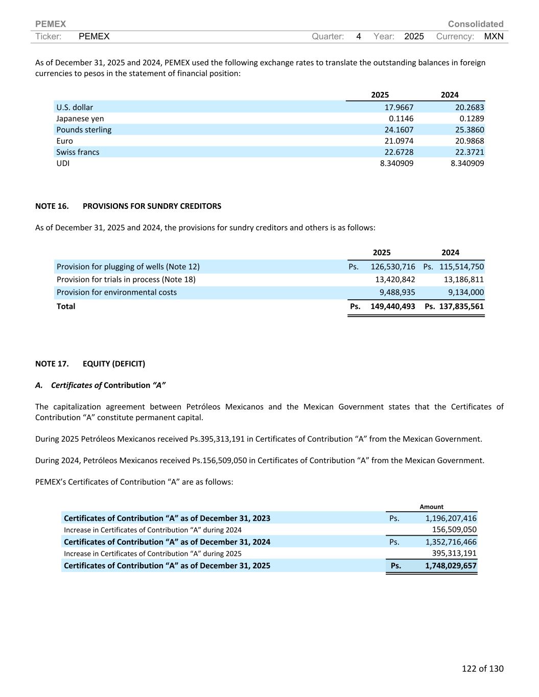 PEMEX Consolidated Ticker: PEMEX Quarter: 4 Year: 2025 Currency: MXN 122 of 130 As of December 31, 2025 and 2024, PEMEX used the following exchange rates to translate the outstanding balances in foreign currencies to pesos in the statement of financial position: 2025 2024 U.S. dollar 17.9667 20.2683 Japanese yen 0.1146 0.1289 Pounds sterling 24.1607 25.3860 Euro 21.0974 20.9868 Swiss francs 22.6728 22.3721 UDI 8.340909 8.340909 NOTE 16. PROVISIONS FOR SUNDRY CREDITORS As of December 31, 2025 and 2024, the provisions for sundry creditors and others is as follows: 2025 2024 Provision for plugging of wells (Note 12) Ps. 126,530,716 Ps. 115,514,750 Provision for trials in process (Note 18) 13,420,842 13,186,811 Provision for environmental costs 9,488,935 9,134,000 Total Ps. 149,440,493 Ps. 137,835,561 NOTE 17. EQUITY (DEFICIT) A. Certificates of Contribution “A” The capitalization agreement between Petróleos Mexicanos and the Mexican Government states that the Certificates of Contribution “A” constitute permanent capital. During 2025 Petróleos Mexicanos received Ps.395,313,191 in Certificates of Contribution “A” from the Mexican Government. During 2024, Petróleos Mexicanos received Ps.156,509,050 in Certificates of Contribution “A” from the Mexican Government. PEMEX’s Certificates of Contribution “A” are as follows: Amount Certificates of Contribution “A” as of December 31, 2023 Ps. 1,196,207,416 Increase in Certificates of Contribution “A” during 2024 156,509,050 Certificates of Contribution “A” as of December 31, 2024 Ps. 1,352,716,466 Increase in Certificates of Contribution “A” during 2025 395,313,191 Certificates of Contribution “A” as of December 31, 2025 Ps. 1,748,029,657
