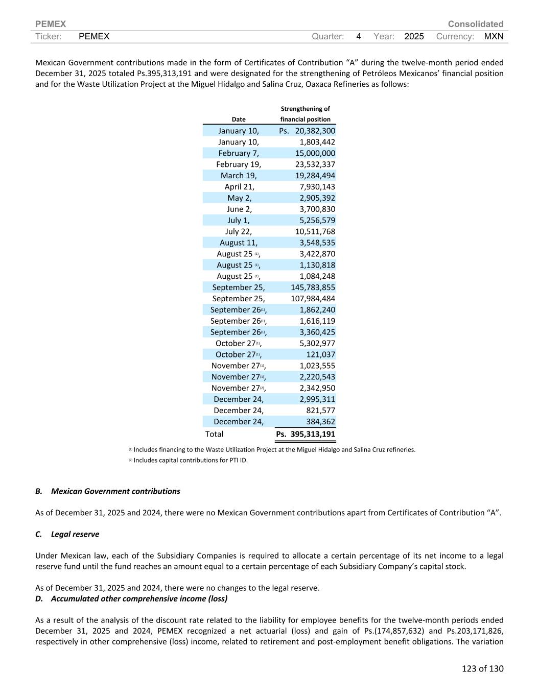 PEMEX Consolidated Ticker: PEMEX Quarter: 4 Year: 2025 Currency: MXN 123 of 130 Mexican Government contributions made in the form of Certificates of Contribution “A” during the twelve-month period ended December 31, 2025 totaled Ps.395,313,191 and were designated for the strengthening of Petróleos Mexicanos’ financial position and for the Waste Utilization Project at the Miguel Hidalgo and Salina Cruz, Oaxaca Refineries as follows: Date Strengthening of financial position January 10, Ps. 20,382,300 January 10, 1,803,442 February 7, 15,000,000 February 19, 23,532,337 March 19, 19,284,494 April 21, 7,930,143 May 2, 2,905,392 June 2, 3,700,830 July 1, 5,256,579 July 22, 10,511,768 August 11, 3,548,535 August 25 (1), 3,422,870 August 25 (1), 1,130,818 August 25 (1), 1,084,248 September 25, 145,783,855 September 25, 107,984,484 September 26(1), 1,862,240 September 26(1), 1,616,119 September 26(1), 3,360,425 October 27(1), 5,302,977 October 27(1), 121,037 November 27(1), 1,023,555 November 27(1), 2,220,543 November 27(2), 2,342,950 December 24, 2,995,311 December 24, 821,577 December 24, 384,362 Total Ps. 395,313,191 (1) Includes financing to the Waste Utilization Project at the Miguel Hidalgo and Salina Cruz refineries. (2) Includes capital contributions for PTI ID. B. Mexican Government contributions As of December 31, 2025 and 2024, there were no Mexican Government contributions apart from Certificates of Contribution “A”. C. Legal reserve Under Mexican law, each of the Subsidiary Companies is required to allocate a certain percentage of its net income to a legal reserve fund until the fund reaches an amount equal to a certain percentage of each Subsidiary Company’s capital stock. As of December 31, 2025 and 2024, there were no changes to the legal reserve. D. Accumulated other comprehensive income (loss) As a result of the analysis of the discount rate related to the liability for employee benefits for the twelve-month periods ended December 31, 2025 and 2024, PEMEX recognized a net actuarial (loss) and gain of Ps.(174,857,632) and Ps.203,171,826, respectively in other comprehensive (loss) income, related to retirement and post-employment benefit obligations. The variation
