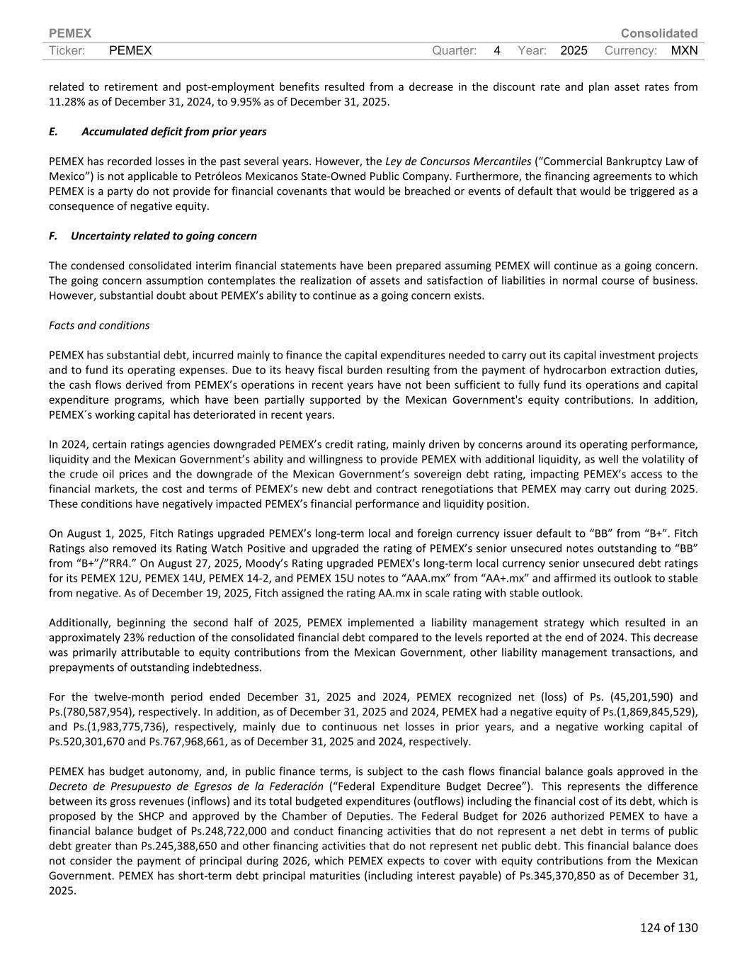 PEMEX Consolidated Ticker: PEMEX Quarter: 4 Year: 2025 Currency: MXN 124 of 130 related to retirement and post-employment benefits resulted from a decrease in the discount rate and plan asset rates from 11.28% as of December 31, 2024, to 9.95% as of December 31, 2025. E. Accumulated deficit from prior years PEMEX has recorded losses in the past several years. However, the Ley de Concursos Mercantiles (“Commercial Bankruptcy Law of Mexico”) is not applicable to Petróleos Mexicanos State-Owned Public Company. Furthermore, the financing agreements to which PEMEX is a party do not provide for financial covenants that would be breached or events of default that would be triggered as a consequence of negative equity. F. Uncertainty related to going concern The condensed consolidated interim financial statements have been prepared assuming PEMEX will continue as a going concern. The going concern assumption contemplates the realization of assets and satisfaction of liabilities in normal course of business. However, substantial doubt about PEMEX’s ability to continue as a going concern exists. Facts and conditions PEMEX has substantial debt, incurred mainly to finance the capital expenditures needed to carry out its capital investment projects and to fund its operating expenses. Due to its heavy fiscal burden resulting from the payment of hydrocarbon extraction duties, the cash flows derived from PEMEX’s operations in recent years have not been sufficient to fully fund its operations and capital expenditure programs, which have been partially supported by the Mexican Government's equity contributions. In addition, PEMEX´s working capital has deteriorated in recent years. In 2024, certain ratings agencies downgraded PEMEX’s credit rating, mainly driven by concerns around its operating performance, liquidity and the Mexican Government’s ability and willingness to provide PEMEX with additional liquidity, as well the volatility of the crude oil prices and the downgrade of the Mexican Government’s sovereign debt rating, impacting PEMEX’s access to the financial markets, the cost and terms of PEMEX’s new debt and contract renegotiations that PEMEX may carry out during 2025. These conditions have negatively impacted PEMEX’s financial performance and liquidity position. On August 1, 2025, Fitch Ratings upgraded PEMEX’s long-term local and foreign currency issuer default to “BB” from “B+”. Fitch Ratings also removed its Rating Watch Positive and upgraded the rating of PEMEX’s senior unsecured notes outstanding to “BB” from “B+”/”RR4.” On August 27, 2025, Moody’s Rating upgraded PEMEX’s long-term local currency senior unsecured debt ratings for its PEMEX 12U, PEMEX 14U, PEMEX 14-2, and PEMEX 15U notes to “AAA.mx” from “AA+.mx” and affirmed its outlook to stable from negative. As of December 19, 2025, Fitch assigned the rating AA.mx in scale rating with stable outlook. Additionally, beginning the second half of 2025, PEMEX implemented a liability management strategy which resulted in an approximately 23% reduction of the consolidated financial debt compared to the levels reported at the end of 2024. This decrease was primarily attributable to equity contributions from the Mexican Government, other liability management transactions, and prepayments of outstanding indebtedness. For the twelve-month period ended December 31, 2025 and 2024, PEMEX recognized net (loss) of Ps. (45,201,590) and Ps.(780,587,954), respectively. In addition, as of December 31, 2025 and 2024, PEMEX had a negative equity of Ps.(1,869,845,529), and Ps.(1,983,775,736), respectively, mainly due to continuous net losses in prior years, and a negative working capital of Ps.520,301,670 and Ps.767,968,661, as of December 31, 2025 and 2024, respectively. PEMEX has budget autonomy, and, in public finance terms, is subject to the cash flows financial balance goals approved in the Decreto de Presupuesto de Egresos de la Federación (“Federal Expenditure Budget Decree”). This represents the difference between its gross revenues (inflows) and its total budgeted expenditures (outflows) including the financial cost of its debt, which is proposed by the SHCP and approved by the Chamber of Deputies. The Federal Budget for 2026 authorized PEMEX to have a financial balance budget of Ps.248,722,000 and conduct financing activities that do not represent a net debt in terms of public debt greater than Ps.245,388,650 and other financing activities that do not represent net public debt. This financial balance does not consider the payment of principal during 2026, which PEMEX expects to cover with equity contributions from the Mexican Government. PEMEX has short-term debt principal maturities (including interest payable) of Ps.345,370,850 as of December 31, 2025.
