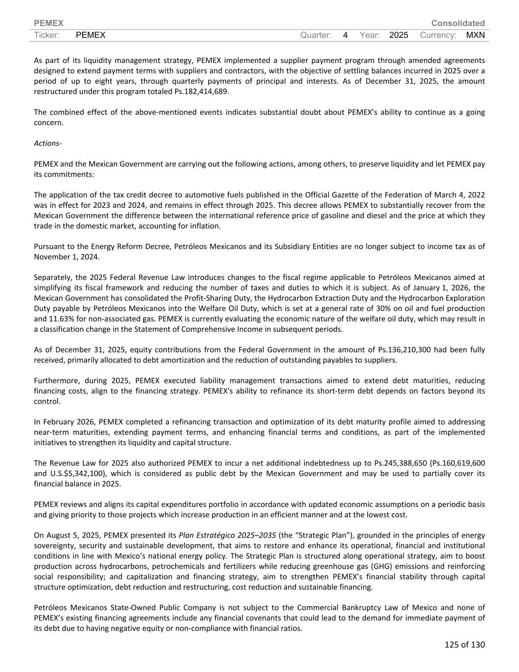 PEMEX Consolidated Ticker: PEMEX Quarter: 4 Year: 2025 Currency: MXN 125 of 130 As part of its liquidity management strategy, PEMEX implemented a supplier payment program through amended agreements designed to extend payment terms with suppliers and contractors, with the objective of settling balances incurred in 2025 over a period of up to eight years, through quarterly payments of principal and interests. As of December 31, 2025, the amount restructured under this program totaled Ps.182,414,689. The combined effect of the above-mentioned events indicates substantial doubt about PEMEX’s ability to continue as a going concern. Actions- PEMEX and the Mexican Government are carrying out the following actions, among others, to preserve liquidity and let PEMEX pay its commitments: The application of the tax credit decree to automotive fuels published in the Official Gazette of the Federation of March 4, 2022 was in effect for 2023 and 2024, and remains in effect through 2025. This decree allows PEMEX to substantially recover from the Mexican Government the difference between the international reference price of gasoline and diesel and the price at which they trade in the domestic market, accounting for inflation. Pursuant to the Energy Reform Decree, Petróleos Mexicanos and its Subsidiary Entities are no longer subject to income tax as of November 1, 2024. Separately, the 2025 Federal Revenue Law introduces changes to the fiscal regime applicable to Petróleos Mexicanos aimed at simplifying its fiscal framework and reducing the number of taxes and duties to which it is subject. As of January 1, 2026, the Mexican Government has consolidated the Profit-Sharing Duty, the Hydrocarbon Extraction Duty and the Hydrocarbon Exploration Duty payable by Petróleos Mexicanos into the Welfare Oil Duty, which is set at a general rate of 30% on oil and fuel production and 11.63% for non-associated gas. PEMEX is currently evaluating the economic nature of the welfare oil duty, which may result in a classification change in the Statement of Comprehensive Income in subsequent periods. As of December 31, 2025, equity contributions from the Federal Government in the amount of Ps.136,210,300 had been fully received, primarily allocated to debt amortization and the reduction of outstanding payables to suppliers. Furthermore, during 2025, PEMEX executed liability management transactions aimed to extend debt maturities, reducing financing costs, align to the financing strategy. PEMEX's ability to refinance its short-term debt depends on factors beyond its control. In February 2026, PEMEX completed a refinancing transaction and optimization of its debt maturity profile aimed to addressing near-term maturities, extending payment terms, and enhancing financial terms and conditions, as part of the implemented initiatives to strengthen its liquidity and capital structure. The Revenue Law for 2025 also authorized PEMEX to incur a net additional indebtedness up to Ps.245,388,650 (Ps.160,619,600 and U.S.$5,342,100), which is considered as public debt by the Mexican Government and may be used to partially cover its financial balance in 2025. PEMEX reviews and aligns its capital expenditures portfolio in accordance with updated economic assumptions on a periodic basis and giving priority to those projects which increase production in an efficient manner and at the lowest cost. On August 5, 2025, PEMEX presented its Plan Estratégico 2025–2035 (the “Strategic Plan”), grounded in the principles of energy sovereignty, security and sustainable development, that aims to restore and enhance its operational, financial and institutional conditions in line with Mexico’s national energy policy. The Strategic Plan is structured along operational strategy, aim to boost production across hydrocarbons, petrochemicals and fertilizers while reducing greenhouse gas (GHG) emissions and reinforcing social responsibility; and capitalization and financing strategy, aim to strengthen PEMEX’s financial stability through capital structure optimization, debt reduction and restructuring, cost reduction and sustainable financing. Petróleos Mexicanos State-Owned Public Company is not subject to the Commercial Bankruptcy Law of Mexico and none of PEMEX’s existing financing agreements include any financial covenants that could lead to the demand for immediate payment of its debt due to having negative equity or non-compliance with financial ratios.