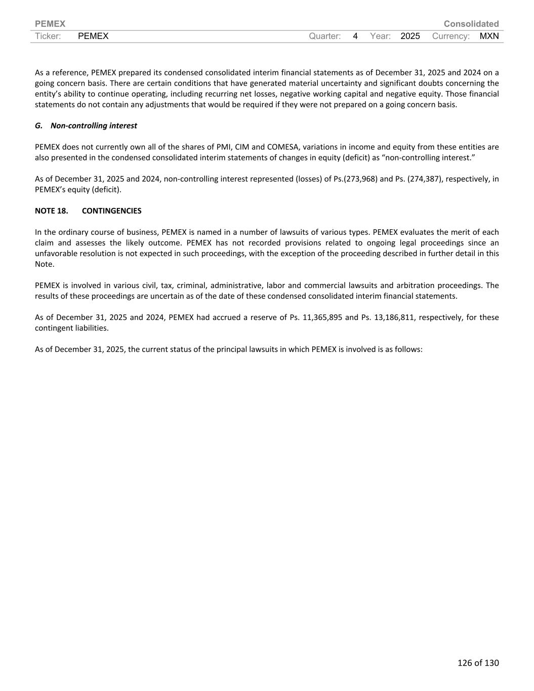 PEMEX Consolidated Ticker: PEMEX Quarter: 4 Year: 2025 Currency: MXN 126 of 130 As a reference, PEMEX prepared its condensed consolidated interim financial statements as of December 31, 2025 and 2024 on a going concern basis. There are certain conditions that have generated material uncertainty and significant doubts concerning the entity’s ability to continue operating, including recurring net losses, negative working capital and negative equity. Those financial statements do not contain any adjustments that would be required if they were not prepared on a going concern basis. G. Non-controlling interest PEMEX does not currently own all of the shares of PMI, CIM and COMESA, variations in income and equity from these entities are also presented in the condensed consolidated interim statements of changes in equity (deficit) as “non-controlling interest.” As of December 31, 2025 and 2024, non-controlling interest represented (losses) of Ps.(273,968) and Ps. (274,387), respectively, in PEMEX’s equity (deficit). NOTE 18. CONTINGENCIES In the ordinary course of business, PEMEX is named in a number of lawsuits of various types. PEMEX evaluates the merit of each claim and assesses the likely outcome. PEMEX has not recorded provisions related to ongoing legal proceedings since an unfavorable resolution is not expected in such proceedings, with the exception of the proceeding described in further detail in this Note. PEMEX is involved in various civil, tax, criminal, administrative, labor and commercial lawsuits and arbitration proceedings. The results of these proceedings are uncertain as of the date of these condensed consolidated interim financial statements. As of December 31, 2025 and 2024, PEMEX had accrued a reserve of Ps. 11,365,895 and Ps. 13,186,811, respectively, for these contingent liabilities. As of December 31, 2025, the current status of the principal lawsuits in which PEMEX is involved is as follows: