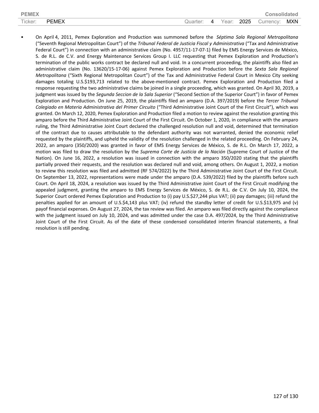 PEMEX Consolidated Ticker: PEMEX Quarter: 4 Year: 2025 Currency: MXN 127 of 130 • On April 4, 2011, Pemex Exploration and Production was summoned before the Séptima Sala Regional Metropolitana (“Seventh Regional Metropolitan Court”) of the Tribunal Federal de Justicia Fiscal y Administrativa (“Tax and Administrative Federal Court”) in connection with an administrative claim (No. 4957/11-17-07-1) filed by EMS Energy Services de México, S. de R.L. de C.V. and Energy Maintenance Services Group I. LLC requesting that Pemex Exploration and Production’s termination of the public works contract be declared null and void. In a concurrent proceeding, the plaintiffs also filed an administrative claim (No. 13620/15-17-06) against Pemex Exploration and Production before the Sexta Sala Regional Metropolitana (“Sixth Regional Metropolitan Court”) of the Tax and Administrative Federal Court in Mexico City seeking damages totaling U.S.$193,713 related to the above-mentioned contract. Pemex Exploration and Production filed a response requesting the two administrative claims be joined in a single proceeding, which was granted. On April 30, 2019, a judgment was issued by the Segunda Seccion de la Sala Superior (“Second Section of the Superior Court”) in favor of Pemex Exploration and Production. On June 25, 2019, the plaintiffs filed an amparo (D.A. 397/2019) before the Tercer Tribunal Colegiado en Materia Administrativa del Primer Circuito (“Third Administrative Joint Court of the First Circuit”), which was granted. On March 12, 2020, Pemex Exploration and Production filed a motion to review against the resolution granting this amparo before the Third Administrative Joint Court of the First Circuit. On October 1, 2020, in compliance with the amparo ruling, the Third Administrative Joint Court declared the challenged resolution null and void, determined that termination of the contract due to causes attributable to the defendant authority was not warranted, denied the economic relief requested by the plaintiffs, and upheld the validity of the resolution challenged in the related proceeding. On February 24, 2022, an amparo (350/2020) was granted in favor of EMS Energy Services de México, S. de R.L. On March 17, 2022, a motion was filed to draw the resolution by the Suprema Corte de Justicia de la Nación (Supreme Court of Justice of the Nation). On June 16, 2022, a resolution was issued in connection with the amparo 350/2020 stating that the plaintiffs partially proved their requests, and the resolution was declared null and void, among others. On August 1, 2022, a motion to review this resolution was filed and admitted (RF 574/2022) by the Third Administrative Joint Court of the First Circuit. On September 13, 2022, representations were made under the amparo (D.A. 539/2022) filed by the plaintiffs before such Court. On April 18, 2024, a resolution was issued by the Third Administrative Joint Court of the First Circuit modifying the appealed judgment, granting the amparo to EMS Energy Services de México, S. de R.L. de C.V. On July 10, 2024, the Superior Court ordered Pemex Exploration and Production to (i) pay U.S.$27,244 plus VAT; (ii) pay damages; (iii) refund the penalties applied for an amount of U.S.$4,143 plus VAT; (iv) refund the standby letter of credit for U.S.$13,975 and (v) payof financial expenses. On August 27, 2024, the tax review was filed. An amparo was filed directly against the compliance with the judgment issued on July 10, 2024, and was admitted under the case D.A. 497/2024, by the Third Administrative Joint Court of the First Circuit. As of the date of these condensed consolidated interim financial statements, a final resolution is still pending.