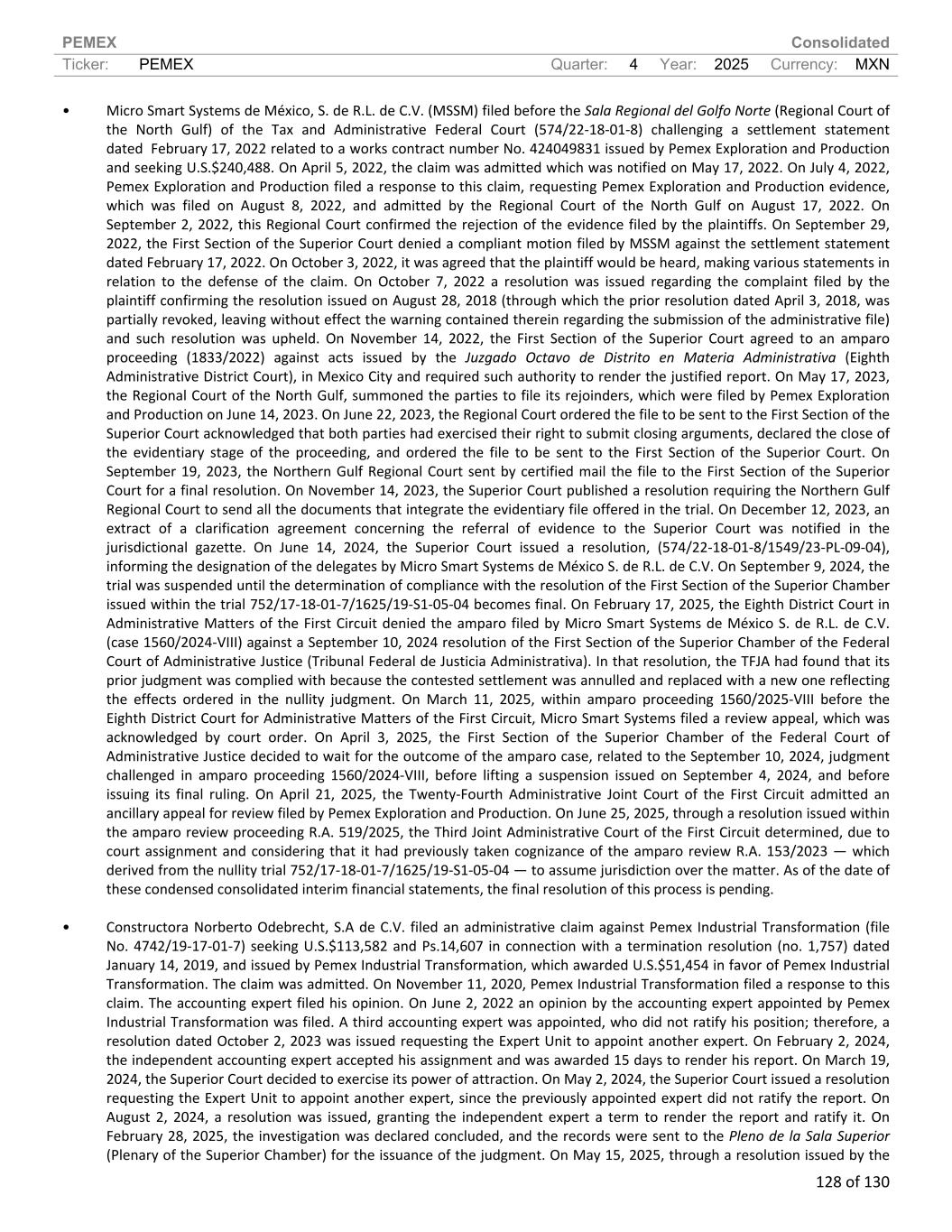 PEMEX Consolidated Ticker: PEMEX Quarter: 4 Year: 2025 Currency: MXN 128 of 130 • Micro Smart Systems de México, S. de R.L. de C.V. (MSSM) filed before the Sala Regional del Golfo Norte (Regional Court of the North Gulf) of the Tax and Administrative Federal Court (574/22-18-01-8) challenging a settlement statement dated February 17, 2022 related to a works contract number No. 424049831 issued by Pemex Exploration and Production and seeking U.S.$240,488. On April 5, 2022, the claim was admitted which was notified on May 17, 2022. On July 4, 2022, Pemex Exploration and Production filed a response to this claim, requesting Pemex Exploration and Production evidence, which was filed on August 8, 2022, and admitted by the Regional Court of the North Gulf on August 17, 2022. On September 2, 2022, this Regional Court confirmed the rejection of the evidence filed by the plaintiffs. On September 29, 2022, the First Section of the Superior Court denied a compliant motion filed by MSSM against the settlement statement dated February 17, 2022. On October 3, 2022, it was agreed that the plaintiff would be heard, making various statements in relation to the defense of the claim. On October 7, 2022 a resolution was issued regarding the complaint filed by the plaintiff confirming the resolution issued on August 28, 2018 (through which the prior resolution dated April 3, 2018, was partially revoked, leaving without effect the warning contained therein regarding the submission of the administrative file) and such resolution was upheld. On November 14, 2022, the First Section of the Superior Court agreed to an amparo proceeding (1833/2022) against acts issued by the Juzgado Octavo de Distrito en Materia Administrativa (Eighth Administrative District Court), in Mexico City and required such authority to render the justified report. On May 17, 2023, the Regional Court of the North Gulf, summoned the parties to file its rejoinders, which were filed by Pemex Exploration and Production on June 14, 2023. On June 22, 2023, the Regional Court ordered the file to be sent to the First Section of the Superior Court acknowledged that both parties had exercised their right to submit closing arguments, declared the close of the evidentiary stage of the proceeding, and ordered the file to be sent to the First Section of the Superior Court. On September 19, 2023, the Northern Gulf Regional Court sent by certified mail the file to the First Section of the Superior Court for a final resolution. On November 14, 2023, the Superior Court published a resolution requiring the Northern Gulf Regional Court to send all the documents that integrate the evidentiary file offered in the trial. On December 12, 2023, an extract of a clarification agreement concerning the referral of evidence to the Superior Court was notified in the jurisdictional gazette. On June 14, 2024, the Superior Court issued a resolution, (574/22-18-01-8/1549/23-PL-09-04), informing the designation of the delegates by Micro Smart Systems de México S. de R.L. de C.V. On September 9, 2024, the trial was suspended until the determination of compliance with the resolution of the First Section of the Superior Chamber issued within the trial 752/17-18-01-7/1625/19-S1-05-04 becomes final. On February 17, 2025, the Eighth District Court in Administrative Matters of the First Circuit denied the amparo filed by Micro Smart Systems de México S. de R.L. de C.V. (case 1560/2024-VIII) against a September 10, 2024 resolution of the First Section of the Superior Chamber of the Federal Court of Administrative Justice (Tribunal Federal de Justicia Administrativa). In that resolution, the TFJA had found that its prior judgment was complied with because the contested settlement was annulled and replaced with a new one reflecting the effects ordered in the nullity judgment. On March 11, 2025, within amparo proceeding 1560/2025-VIII before the Eighth District Court for Administrative Matters of the First Circuit, Micro Smart Systems filed a review appeal, which was acknowledged by court order. On April 3, 2025, the First Section of the Superior Chamber of the Federal Court of Administrative Justice decided to wait for the outcome of the amparo case, related to the September 10, 2024, judgment challenged in amparo proceeding 1560/2024-VIII, before lifting a suspension issued on September 4, 2024, and before issuing its final ruling. On April 21, 2025, the Twenty-Fourth Administrative Joint Court of the First Circuit admitted an ancillary appeal for review filed by Pemex Exploration and Production. On June 25, 2025, through a resolution issued within the amparo review proceeding R.A. 519/2025, the Third Joint Administrative Court of the First Circuit determined, due to court assignment and considering that it had previously taken cognizance of the amparo review R.A. 153/2023 — which derived from the nullity trial 752/17-18-01-7/1625/19-S1-05-04 — to assume jurisdiction over the matter. As of the date of these condensed consolidated interim financial statements, the final resolution of this process is pending. • Constructora Norberto Odebrecht, S.A de C.V. filed an administrative claim against Pemex Industrial Transformation (file No. 4742/19-17-01-7) seeking U.S.$113,582 and Ps.14,607 in connection with a termination resolution (no. 1,757) dated January 14, 2019, and issued by Pemex Industrial Transformation, which awarded U.S.$51,454 in favor of Pemex Industrial Transformation. The claim was admitted. On November 11, 2020, Pemex Industrial Transformation filed a response to this claim. The accounting expert filed his opinion. On June 2, 2022 an opinion by the accounting expert appointed by Pemex Industrial Transformation was filed. A third accounting expert was appointed, who did not ratify his position; therefore, a resolution dated October 2, 2023 was issued requesting the Expert Unit to appoint another expert. On February 2, 2024, the independent accounting expert accepte