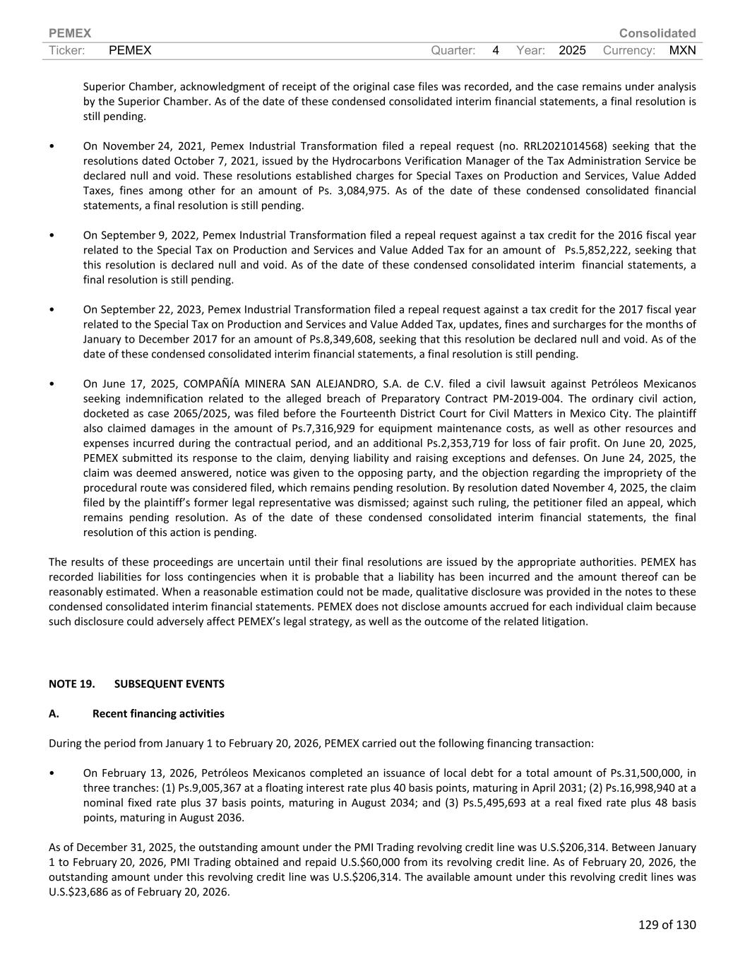 PEMEX Consolidated Ticker: PEMEX Quarter: 4 Year: 2025 Currency: MXN 129 of 130 Superior Chamber, acknowledgment of receipt of the original case files was recorded, and the case remains under analysis by the Superior Chamber. As of the date of these condensed consolidated interim financial statements, a final resolution is still pending. • On November 24, 2021, Pemex Industrial Transformation filed a repeal request (no. RRL2021014568) seeking that the resolutions dated October 7, 2021, issued by the Hydrocarbons Verification Manager of the Tax Administration Service be declared null and void. These resolutions established charges for Special Taxes on Production and Services, Value Added Taxes, fines among other for an amount of Ps. 3,084,975. As of the date of these condensed consolidated financial statements, a final resolution is still pending. • On September 9, 2022, Pemex Industrial Transformation filed a repeal request against a tax credit for the 2016 fiscal year related to the Special Tax on Production and Services and Value Added Tax for an amount of Ps.5,852,222, seeking that this resolution is declared null and void. As of the date of these condensed consolidated interim financial statements, a final resolution is still pending. • On September 22, 2023, Pemex Industrial Transformation filed a repeal request against a tax credit for the 2017 fiscal year related to the Special Tax on Production and Services and Value Added Tax, updates, fines and surcharges for the months of January to December 2017 for an amount of Ps.8,349,608, seeking that this resolution be declared null and void. As of the date of these condensed consolidated interim financial statements, a final resolution is still pending. • On June 17, 2025, COMPAÑÍA MINERA SAN ALEJANDRO, S.A. de C.V. filed a civil lawsuit against Petróleos Mexicanos seeking indemnification related to the alleged breach of Preparatory Contract PM-2019-004. The ordinary civil action, docketed as case 2065/2025, was filed before the Fourteenth District Court for Civil Matters in Mexico City. The plaintiff also claimed damages in the amount of Ps.7,316,929 for equipment maintenance costs, as well as other resources and expenses incurred during the contractual period, and an additional Ps.2,353,719 for loss of fair profit. On June 20, 2025, PEMEX submitted its response to the claim, denying liability and raising exceptions and defenses. On June 24, 2025, the claim was deemed answered, notice was given to the opposing party, and the objection regarding the impropriety of the procedural route was considered filed, which remains pending resolution. By resolution dated November 4, 2025, the claim filed by the plaintiff’s former legal representative was dismissed; against such ruling, the petitioner filed an appeal, which remains pending resolution. As of the date of these condensed consolidated interim financial statements, the final resolution of this action is pending. The results of these proceedings are uncertain until their final resolutions are issued by the appropriate authorities. PEMEX has recorded liabilities for loss contingencies when it is probable that a liability has been incurred and the amount thereof can be reasonably estimated. When a reasonable estimation could not be made, qualitative disclosure was provided in the notes to these condensed consolidated interim financial statements. PEMEX does not disclose amounts accrued for each individual claim because such disclosure could adversely affect PEMEX’s legal strategy, as well as the outcome of the related litigation. NOTE 19. SUBSEQUENT EVENTS A. Recent financing activities During the period from January 1 to February 20, 2026, PEMEX carried out the following financing transaction: • On February 13, 2026, Petróleos Mexicanos completed an issuance of local debt for a total amount of Ps.31,500,000, in three tranches: (1) Ps.9,005,367 at a floating interest rate plus 40 basis points, maturing in April 2031; (2) Ps.16,998,940 at a nominal fixed rate plus 37 basis points, maturing in August 2034; and (3) Ps.5,495,693 at a real fixed rate plus 48 basis points, maturing in August 2036. As of December 31, 2025, the outstanding amount under the PMI Trading revolving credit line was U.S.$206,314. Between January 1 to February 20, 2026, PMI Trading obtained and repaid U.S.$60,000 from its revolving credit line. As of February 20, 2026, the outstanding amount under this revolving credit line was U.S.$206,314. The available amount under this revolving credit lines was U.S.$23,686 as of February 20, 2026.