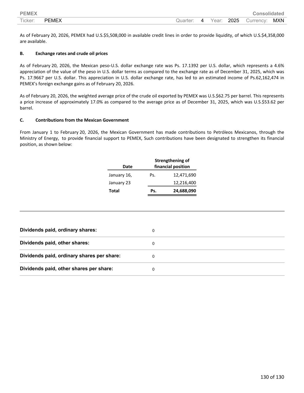 PEMEX Consolidated Ticker: PEMEX Quarter: 4 Year: 2025 Currency: MXN 130 of 130 As of February 20, 2026, PEMEX had U.S.$5,508,000 in available credit lines in order to provide liquidity, of which U.S.$4,358,000 are available. B. Exchange rates and crude oil prices As of February 20, 2026, the Mexican peso-U.S. dollar exchange rate was Ps. 17.1392 per U.S. dollar, which represents a 4.6% appreciation of the value of the peso in U.S. dollar terms as compared to the exchange rate as of December 31, 2025, which was Ps. 17.9667 per U.S. dollar. This appreciation in U.S. dollar exchange rate, has led to an estimated income of Ps.62,162,474 in PEMEX’s foreign exchange gains as of February 20, 2026. As of February 20, 2026, the weighted average price of the crude oil exported by PEMEX was U.S.$62.75 per barrel. This represents a price increase of approximately 17.0% as compared to the average price as of December 31, 2025, which was U.S.$53.62 per barrel. C. Contributions from the Mexican Government From January 1 to February 20, 2026, the Mexican Government has made contributions to Petróleos Mexicanos, through the Ministry of Energy, to provide financial support to PEMEX, Such contributions have been designated to strengthen its financial position, as shown below: Date Strengthening of financial position January 16, Ps. 12,471,690 January 23 12,216,400 Total Ps. 24,688,090 Dividends paid, ordinary shares: 0 Dividends paid, other shares: 0 Dividends paid, ordinary shares per share: 0 Dividends paid, other shares per share: 0