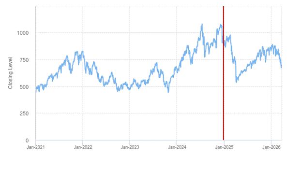 The graph below shows the daily closing levels of the underlier from January 1, 2021 through March 24, 2026 (using hypothetical performance data and historical closing levels). As a result, the following graph does not reflect the global financial crisis which began in 2008, which had a materially negative impact on the price of most equity securities and, as a result, the level of most equity indices. Since the underlier was launched on December 27, 2024 and has a limited operating history, the graph includes hypothetical performance data for the underlier prior to its launch on December 27, 2024. The hypothetical performance data prior to December 27, 2024 was obtained from the underlier sponsor’s website, without independent verification. The historical closing levels from December 27, 2024 to March 24, 2026 were obtained from Bloomberg Financial Services, without independent verification. (In the graph, the hypothetical historical closing levels can be found to the left of the vertical solid line marker and the historical closing levels can be found to the right of the vertical solid line marker.) You should not take the hypothetical performance data or historical levels of the underlier as an indication of the future performance of the underlier.