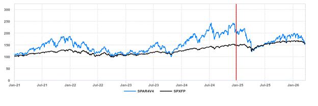 Since the underlier was launched on December 27, 2024 and has a limited operating history, the graph includes hypothetical performance data for the underlier prior to its launch of December 27, 2024. The hypothetical performance data for the underlier prior to December 27, 2024 used to create this graph was obtained from the underlier sponsor’s website, without independent verification. The daily historical closing levels of the underlier from December 27, 2024 to March 24, 2026 used to create this graph were obtained from Bloomberg Financial Services, without independent verification. (In the graph, historical closing levels can be found to the right of the vertical solid line marker.) The daily historical closing levels of the S&P 500® Futures Excess Return Index from January 1, 2021 through March 24, 2026 used to create this graph were obtained from Bloomberg Financial Services, without independent verification. You should not take this graph, the hypothetical performance data of the underlier or the historical closing levels of the indices used to create this graph as an indication of the future performance of any index, including the underlier, or the correlation (if any) between the level of the underlier and the level of the S&P 500® Futures Excess Return Index.