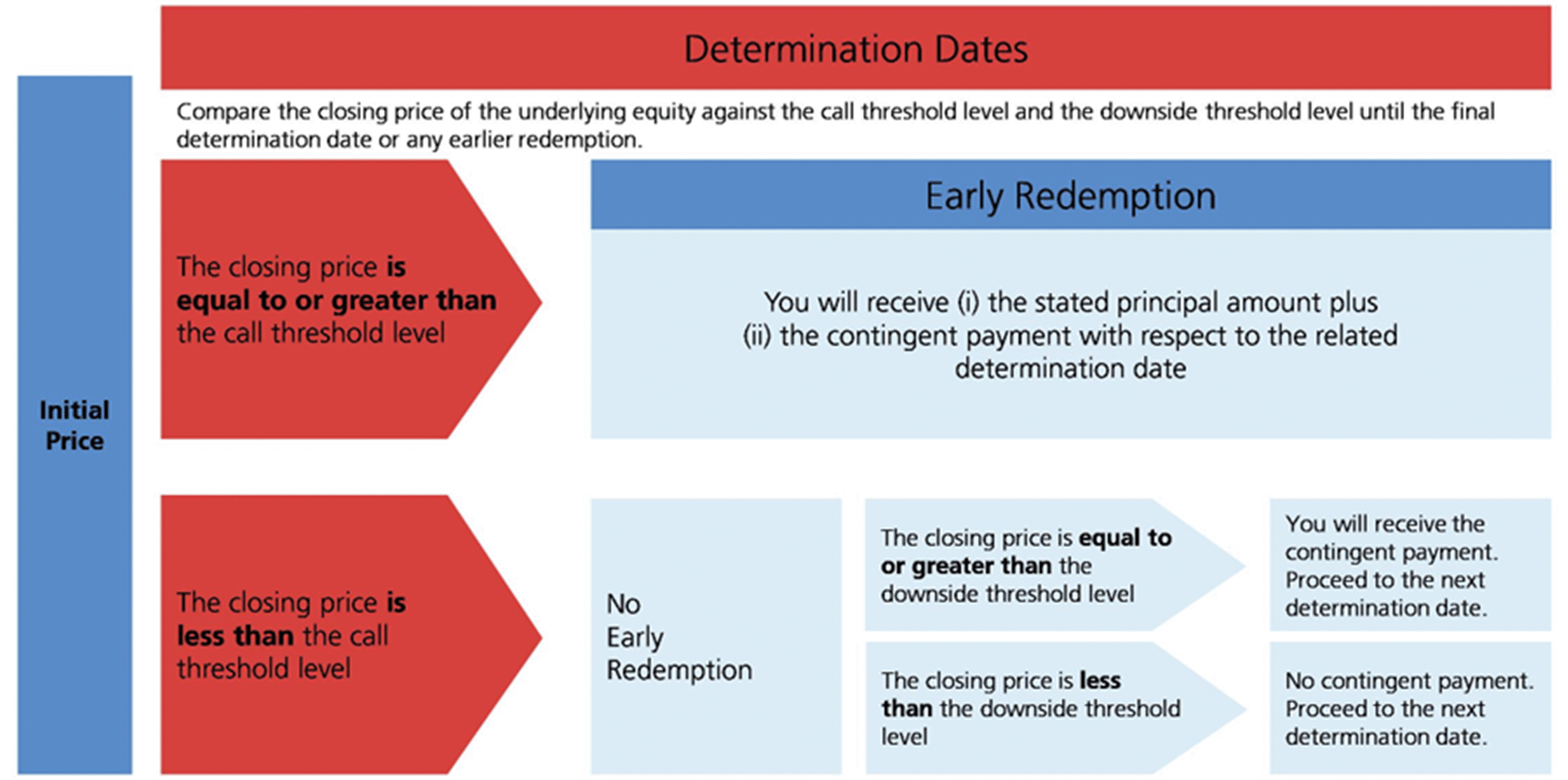If, on any determination date (other than the final determination date), the closing price of the underlying equity is equal to or greater than the call threshold level, the securities will be redeemed early and we will pay the early redemption amount on the first contingent payment date immediately following the related determination date. |