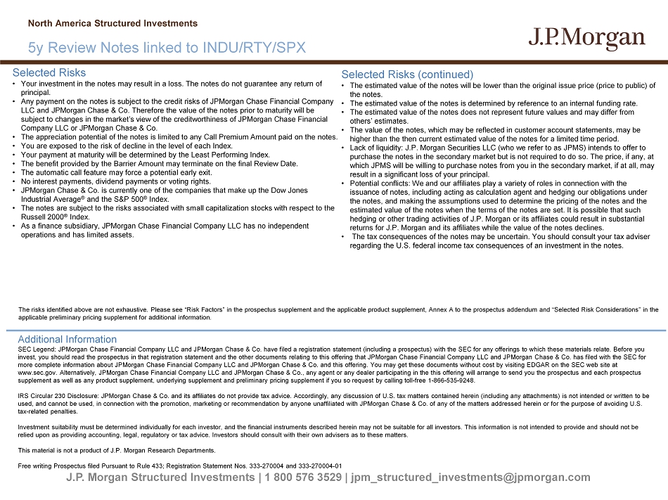 J.P. Morgan Structured Investments | 1 800 576 3529 | jpm_structured_investments@jpmorgan.com Selected Risks • Your investment in the notes may result in a loss. The notes do not guarantee any return of principal. • Any payment on the notes is subject to the credit risks of JPMorgan Chase Financial Company LLC and JPMorgan Chase & Co. Therefore the value of the notes prior to maturity will be subject to changes in the market’s view of the creditworthiness of JPMorgan Chase Financial Company LLC or JPMorgan Chase & Co. • The appreciation potential of the notes is limited to any Call Premium Amount paid on the notes. • You are exposed to the risk of decline in the level of each Index. • Your payment at maturity will be determined by the Least Performing Index. • The benefit provided by the Barrier Amount may terminate on the final Review Date. • The automatic call feature may force a potential early exit. • No interest payments, dividend payments or voting rights. • JPMorgan Chase & Co. is currently one of the companies that make up the Dow Jones Industrial Average ® and the S&P 500 ® Index. • The notes are subject to the risks associated with small capitalization stocks with respect to the Russell 2000 ® Index. • As a finance subsidiary, JPMorgan Chase Financial Company LLC has no independent operations and has limited assets. Selected Risks (continued) • The estimated value of the notes will be lower than the original issue price (price to public) of the notes. • The estimated value of the notes is determined by reference to an internal funding rate. • The estimated value of the notes does not represent future values and may differ from others’ estimates. • The value of the notes, which may be reflected in customer account statements, may be higher than the then current estimated value of the notes for a limited time period. • Lack of liquidity: J.P. Morgan Securities LLC (who we refer to as JPMS ) intends to offer to purchase the notes in the secondary market but is not required to do so. The price, if any, at which JPMS will be willing to purchase notes from you in the secondary market, if at all, may result in a significant loss of your principal. • Potential conflicts: We and our affiliates play a variety of roles in connection with the issuance of notes, including acting as calculation agent and hedging our obligations under the notes, and making the assumptions used to determine the pricing of the notes and the estimated value of the notes when the terms of the notes are set. It is possible that such hedging or other trading activities of J.P. Morgan or its affiliates could result in substantial returns for J.P. Morgan and its affiliates while the value of the notes declines. • The tax consequences of the notes may be uncertain. You should consult your tax adviser regarding the U.S. federal income tax consequences of an investment in the notes. Additional Information SEC Legend: JPMorgan Chase Financial Company LLC and JPMorgan Chase & Co. have filed a registration statement (including a pr osp ectus) with the SEC for any offerings to which these materials relate. Before you invest, you should read the prospectus in that registration statement and the other documents relating to this offering that JPM organ Chase Financial Company LLC and JPMorgan Chase & Co. has filed with the SEC for more complete information about JPMorgan Chase Financial Company LLC and JPMorgan Chase & Co. and this offering. You may get the se documents without cost by visiting EDGAR on the SEC web site at www.sec.gov. Alternatively, JPMorgan Chase Financial Company LLC and JPMorgan Chase & Co., any agent or any dealer participat ing in the this offering will arrange to send you the prospectus and each prospectus supplement as well as any product supplement, underlying supplement and preliminary pricing supplement if you so request by c all ing toll - free 1 - 866 - 535 - 9248. IRS Circular 230 Disclosure: JPMorgan Chase & Co. and its affiliates do not provide tax advice. Accordingly, any discussion o f U .S. tax matters contained herein (including any attachments) is not intended or written to be used, and cannot be used, in connection with the promotion, marketing or recommendation by anyone unaffiliated with JPMorgan Cha se & Co. of any of the matters addressed herein or for the purpose of avoiding U.S. tax - related penalties. Investment suitability must be determined individually for each investor, and the financial instruments described herein may not be suitable for all investors. This information is not intended to provide and should not be relied upon as providing accounting, legal, regulatory or tax advice. Investors should consult with their own advisers as to the se matters. This material is not a product of J.P. Morgan Research Departments. Free writing Prospectus filed Pursuant to Rule 433; Registration Statement Nos. 333 - 270004 and 333 - 270004 - 01 North America Structured Investments 5y Review Notes linked to INDU/RTY/SPX The risks identified above are not exhaustive. Please see “Risk Factors” in the prospectus supplement and the applicable prod uct supplement, Annex A to the prospectus addendum and “Selected Risk Considerations” in the applicable preliminary pricing supplement for additional information.