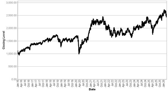 The graph below illustrates the performance of the Russell 2000® Index from January 4, 2016 to March 25, 2026. The closing level of the Russell 2000® Index on March 25, 2026 was 2,536.378. We obtained the closing levels of the Russell 2000® Index from Bloomberg, and we have not participated in the preparation of or verified such information. Currently, whereas the sponsor of the Russell 2000® Index publishes the official closing level of the Russell 2000® Index to six decimal places, Bloomberg reports the closing level to three decimal places. As a result, the closing level of the Russell 2000® Index reported by Bloomberg may be lower or higher than the official closing level of the Russell 2000® Index published by the sponsor of the Russell 2000® Index. The historical closing levels of the Russell 2000® Index should not be taken as an indication of future performance and no assurance can be given as to the final underlying level or any future closing level of the Russell 2000® Index. We cannot give you assurance that the performance of the Russell 2000® Index will result in a positive return on your initial investment and you could lose a significant portion or all of the stated principal amount at maturity.