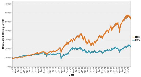 The following graph sets forth the historical performances of the Nasdaq-100 Index® and the Russell 2000® Index from January 4, 2016 through March 25, 2026, based on the daily closing levels of the underlyings. For comparison purposes, each underlying has been normalized to have a closing level of 100.00 on January 4, 2016 by dividing the closing level of that underlying on each day by the closing level of that underlying on January 4, 2016 and multiplying by 100.00.