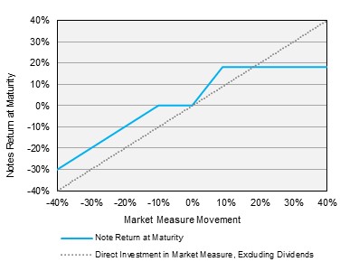 ●2-to-1 leveraged upside exposure to increases in the Market Measure, subject to the Capped Value ●1-to-1 downside exposure to decreases in the Market Measure beyond a 10.00% decline, with up to 90.00% of your principal at risk |