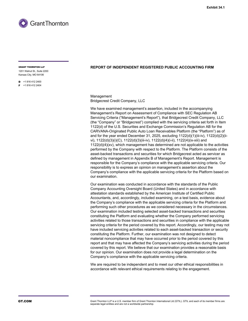 GT.COM Grant Thornton LLP is a U.S. member firm of Grant Thornton International Ltd (GTIL). GTIL and each of its member firms are separate legal entities and are not a worldwide partnership. Management Bridgecrest Credit Company, LLC We have examined management’s assertion, included in the accompanying Management’s Report on Assessment of Compliance with SEC Regulation AB Servicing Criteria (“Management’s Report”), that Bridgecrest Credit Company, LLC (the “Company” or “Bridgecrest”) complied with the servicing criteria set forth in Item 1122(d) of the U.S. Securities and Exchange Commission’s Regulation AB for the CARVANA-Originated Public Auto Loan Receivables Platform (the “Platform”) as of and for the year ended December 31, 2025, excluding 1122(d)(1)(iii-iv), 1122(d)(2)(ii- vi), 1122(d)(3)(i)(C), 1122(d)(3)(iii-iv), 1122(d)(4)(i-ii), 1122(4)(ix-xiii) and 1122(d)(4)(xv), which management has determined are not applicable to the activities performed by the Company with respect to the Platform. The Platform consists of the asset-backed transactions and securities for which Bridgecrest acted as servicer as defined by management in Appendix B of Management’s Report. Management is responsible for the Company’s compliance with the applicable servicing criteria. Our responsibility is to express an opinion on management’s assertion about the Company’s compliance with the applicable servicing criteria for the Platform based on our examination. Our examination was conducted in accordance with the standards of the Public Company Accounting Oversight Board (United States) and in accordance with attestation standards established by the American Institute of Certified Public Accountants, and, accordingly, included examining, on a test basis, evidence about the Company’s compliance with the applicable servicing criteria for the Platform and performing such other procedures as we considered necessary in the circumstances. Our examination included testing selected asset-backed transactions and securities constituting the Platform and evaluating whether the Company performed servicing activities related to those transactions and securities in compliance with the applicable servicing criteria for the period covered by this report. Accordingly, our testing may not have included servicing activities related to each asset-backed transaction or security constituting the Platform. Further, our examination was not designed to detect material noncompliance that may have occurred prior to the period covered by this report and that may have affected the Company’s servicing activities during the period covered by this report. We believe that our examination provides a reasonable basis for our opinion. Our examination does not provide a legal determination on the Company’s compliance with the applicable servicing criteria. We are required to be independent and to meet our other ethical responsibilities in accordance with relevant ethical requirements relating to the engagement. REPORT OF INDEPENDENT REGISTERED PUBLIC ACCOUNTING FIRM GRANT THORNTON LLP 1201 Walnut St., Suite 2200 Kansas City, MO 64106 D +1 816 412 2400 F +1 816 412 2404 Exhibit 34.1
