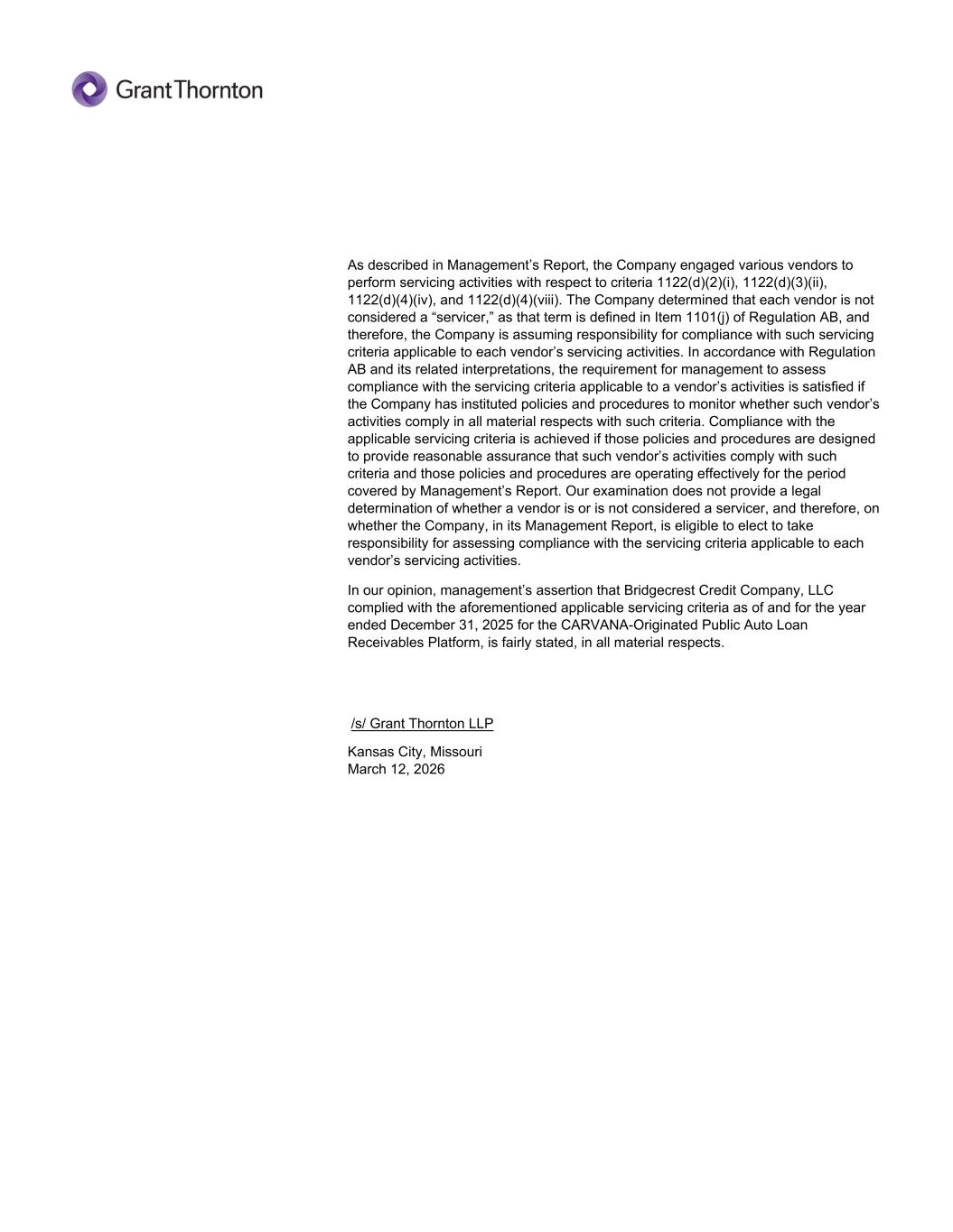 As described in Management’s Report, the Company engaged various vendors to perform servicing activities with respect to criteria 1122(d)(2)(i), 1122(d)(3)(ii), 1122(d)(4)(iv), and 1122(d)(4)(viii). The Company determined that each vendor is not considered a “servicer,” as that term is defined in Item 1101(j) of Regulation AB, and therefore, the Company is assuming responsibility for compliance with such servicing criteria applicable to each vendor’s servicing activities. In accordance with Regulation AB and its related interpretations, the requirement for management to assess compliance with the servicing criteria applicable to a vendor’s activities is satisfied if the Company has instituted policies and procedures to monitor whether such vendor’s activities comply in all material respects with such criteria. Compliance with the applicable servicing criteria is achieved if those policies and procedures are designed to provide reasonable assurance that such vendor’s activities comply with such criteria and those policies and procedures are operating effectively for the period covered by Management’s Report. Our examination does not provide a legal determination of whether a vendor is or is not considered a servicer, and therefore, on whether the Company, in its Management Report, is eligible to elect to take responsibility for assessing compliance with the servicing criteria applicable to each vendor’s servicing activities. In our opinion, management’s assertion that Bridgecrest Credit Company, LLC complied with the aforementioned applicable servicing criteria as of and for the year ended December 31, 2025 for the CARVANA-Originated Public Auto Loan Receivables Platform, is fairly stated, in all material respects. Kansas City, Missouri March 12, 2026 /s/ Grant Thornton LLP