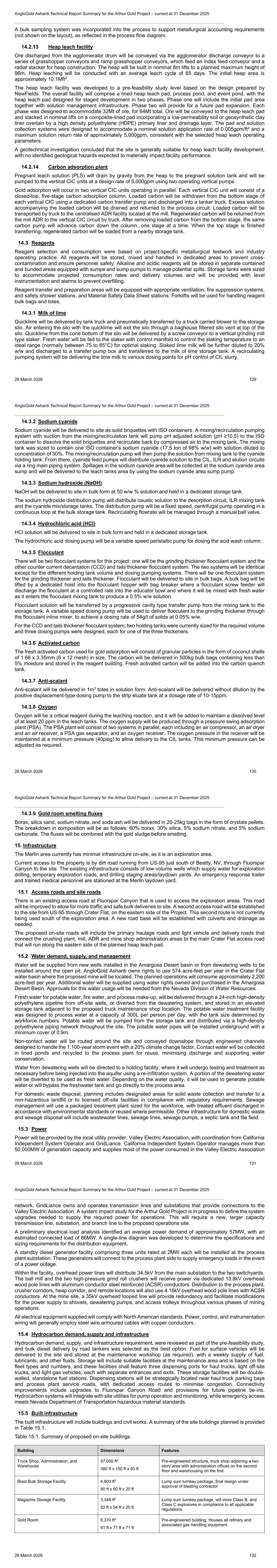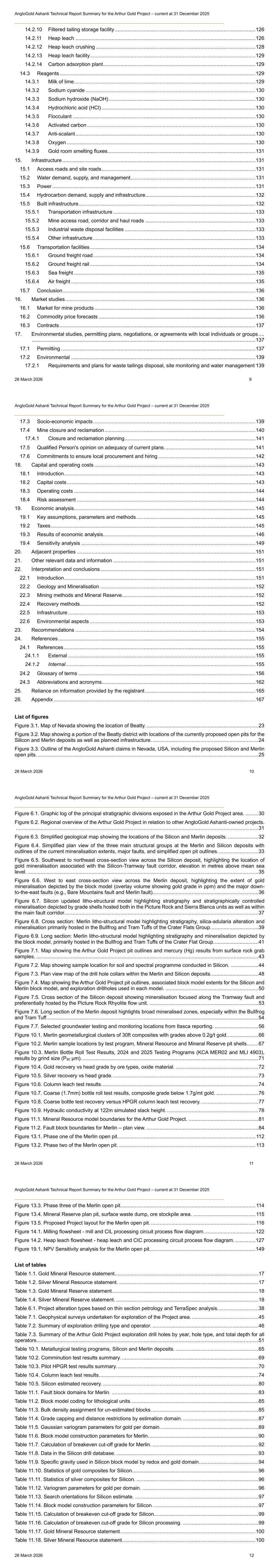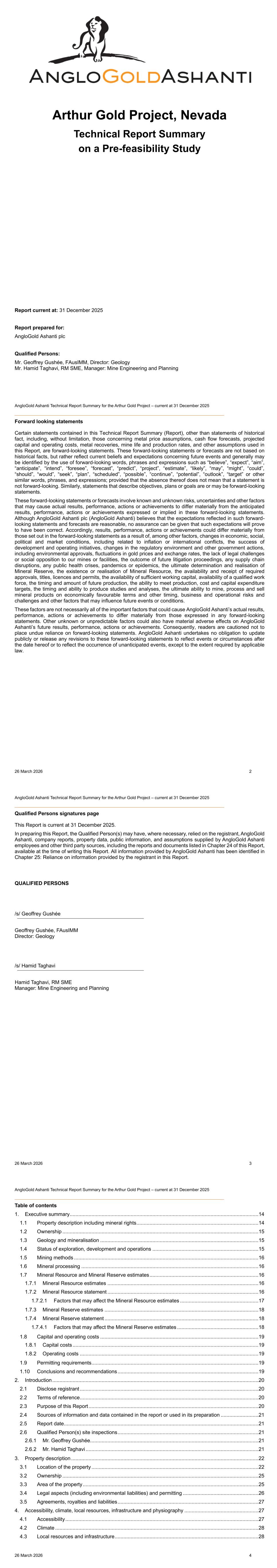 AngloGold Ashanti Technical Report Summary for the Arthur Gold Project – current at 31 December 2025 __________________________________________________________________________________________ 26 March 2026 9 14.2.10 Filtered tailing storage facility ................................................................................................. 126 14.2.11 Heap leach ............................................................................................................................ 126 14.2.12 Heap leach crushing .............................................................................................................. 128 14.2.13 Heap leach facility .................................................................................................................. 129 14.2.14 Carbon adsorption plant ......................................................................................................... 129 14.3 Reagents ....................................................................................................................................... 129 14.3.1 Milk of lime ............................................................................................................................. 129 14.3.2 Sodium cyanide ..................................................................................................................... 130 14.3.3 Sodium hydroxide (NaOH) ..................................................................................................... 130 14.3.4 Hydrochloric acid (HCl) .......................................................................................................... 130 14.3.5 Flocculant .............................................................................................................................. 130 14.3.6 Activated carbon .................................................................................................................... 130 14.3.7 Anti-scalant ............................................................................................................................ 130 14.3.8 Oxygen .................................................................................................................................. 130 14.3.9 Gold room smelting fluxes ...................................................................................................... 131 15. Infrastructure ..................................................................................................................................... 131 15.1 Access roads and site roads .......................................................................................................... 131 15.2 Water demand, supply, and management ...................................................................................... 131 15.3 Power ............................................................................................................................................ 131 15.4 Hydrocarbon demand, supply and infrastructure ............................................................................ 132 15.5 Built infrastructure .......................................................................................................................... 132 15.5.1 Transportation infrastructure .................................................................................................. 133 15.5.2 Mine access road, corridor and haul roads ............................................................................ 133 15.5.3 Industrial waste disposal facilities .......................................................................................... 133 15.5.4 Other infrastructure ................................................................................................................ 133 15.6 Transportation facilities .................................................................................................................. 134 15.6.1 Ground freight road ................................................................................................................ 134 15.6.2 Ground freight rail .................................................................................................................. 134 15.6.3 Sea freight ............................................................................................................................. 135 15.6.4 Air freight ............................................................................................................................... 135 15.7 Conclusion ..................................................................................................................................... 136 16. Market studies ................................................................................................................................... 136 16.1 Market for mine products ............................................................................................................... 136 16.2 Commodity price forecasts ............................................................................................................ 136 16.3 Contracts ....................................................................................................................................... 137 17. Environmental studies, permitting plans, negotiations, or agreements with local individuals or groups .... .......................................................................................................................................................... 137 17.1 Permitting ...................................................................................................................................... 137 17.2 Environmental ............................................................................................................................... 139 17.2.1 Requirements and plans for waste tailings disposal, site monitoring and water management 139 AngloGol