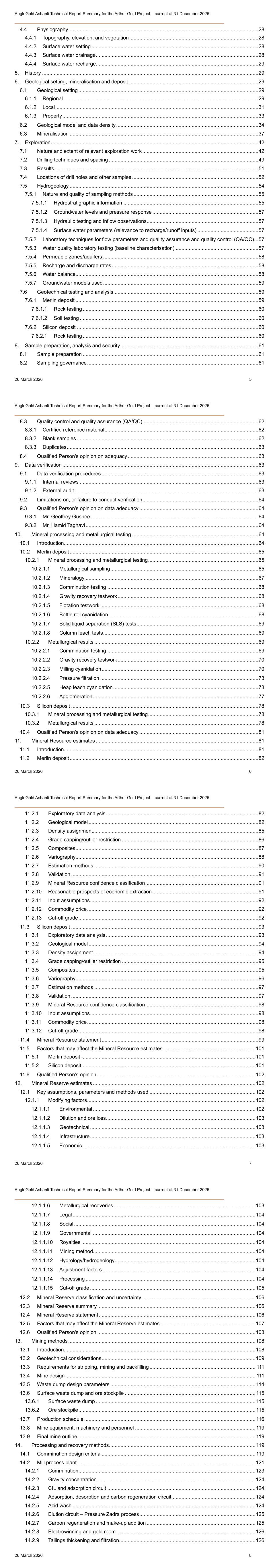 AngloGold Ashanti Technical Report Summary for the Arthur Gold Project – current at 31 December 2025 __________________________________________________________________________________________ 26 March 2026 5 4.4 Physiography ................................................................................................................................... 28 4.4.1 Topography, elevation, and vegetation ......................................................................................... 28 4.4.2 Surface water setting ................................................................................................................... 28 4.4.3 Surface water drainage ................................................................................................................ 28 4.4.4 Surface water recharge................................................................................................................ 29 5. History ..................................................................................................................................................... 29 6. Geological setting, mineralisation and deposit ......................................................................................... 29 6.1 Geological setting ............................................................................................................................ 29 6.1.1 Regional ...................................................................................................................................... 29 6.1.2 Local ............................................................................................................................................ 31 6.1.3 Property ....................................................................................................................................... 33 6.2 Geological model and data density .................................................................................................. 34 6.3 Mineralisation .................................................................................................................................. 37 7. Exploration ............................................................................................................................................... 42 7.1 Nature and extent of relevant exploration work ................................................................................ 42 7.2 Drilling techniques and spacing ....................................................................................................... 49 7.3 Results ............................................................................................................................................ 51 7.4 Locations of drill holes and other samples ....................................................................................... 52 7.5 Hydrogeology .................................................................................................................................. 54 7.5.1 Nature and quality of sampling methods ...................................................................................... 55 7.5.1.1 Hydrostratigraphic information ............................................................................................. 55 7.5.1.2 Groundwater levels and pressure response ......................................................................... 57 7.5.1.3 Hydraulic testing and inflow observations ............................................................................. 57 7.5.1.4 Surface water parameters (relevance to recharge/runoff inputs) .......................................... 57 7.5.2 Laboratory techniques for flow parameters and quality assurance and quality control (QA/QC) ... 57 7.5.3 Water quality laboratory testing (baseline characterisation) ......................................................... 57 7.5.4 Permeable zones/aquifers ........................................................................................................... 58 7.5.5 Recharge and discharge rates ..................................................................................................... 58 7.5.6 Water balance .............................................................................................................................. 58 7.5.7 Groundwater models used ........................................................................................................... 59 7.6 Geotechnical testing and analysis ................................................................................................... 59 7.6.1 Merlin deposit .............................................................................................................................. 59 7.6.1.1 Rock testing ......................................................................................................................... 60 7.6.1.2 Soil testing ........................................................................................................................... 60 7.6.2 Silicon deposit ............................................................................................................................. 60 7.6.2.1 Rock testing ......................................................................................................................... 60 8. Sample preparation, analysis and security ............................................................................................... 61 8.1 Sample preparation ......................................................................................................................... 61 8.2 Sampling governance ...................................................................................................................... 61 AngloGold Ashanti Technical Report Summary for the Arthur Gold Project – current at 31 December 2025 __________________________________________________________________________________________ 
