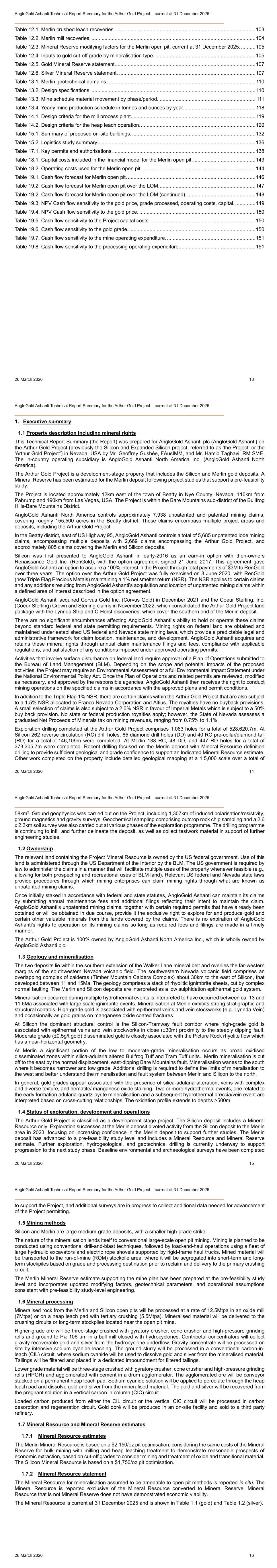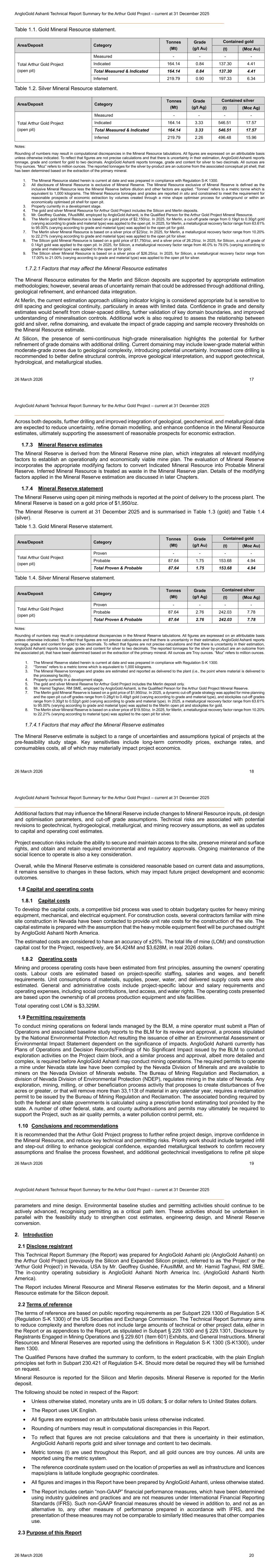 AngloGold Ashanti Technical Report Summary for the Arthur Gold Project – current at 31 December 2025 __________________________________________________________________________________________ 26 March 2026 13 Table 12.1. Merlin crushed leach recoveries. ................................................................................................ 103 Table 12.2. Merlin mill recoveries. ................................................................................................................. 104 Table 12.3. Mineral Reserve modifying factors for the Merlin open pit, current at 31 December 2025. .......... 105 Table 12.4. Inputs to gold cut-off grade by mineralisation type. ..................................................................... 105 Table 12.5. Gold Mineral Reserve statement. ................................................................................................ 107 Table 12.6. Silver Mineral Reserve statement. .............................................................................................. 107 Table 13.1. Merlin geotechnical domains....................................................................................................... 110 Table 13.2. Design specifications. ................................................................................................................. 110 Table 13.3. Mine schedule material movement by phase/period. .................................................................. 111 Table 13.4. Yearly mine production schedule in tonnes and ounces by year. ................................................. 118 Table 14.1. Design criteria for the mill process plant. .................................................................................... 119 Table 14.2. Design criteria for the heap leach operation. ............................................................................... 120 Table 15.1. Summary of proposed on-site buildings. ..................................................................................... 132 Table 15.2. Logistics study summary. ............................................................................................................ 136 Table 17.1. Key permits and authorisations. .................................................................................................. 138 Table 18.1. Capital costs included in the financial model for the Merlin open pit. ........................................... 143 Table 18.2. Operating costs used for the Merlin open pit. .............................................................................. 144 Table 19.1. Cash flow forecast for Merlin open pit. ........................................................................................ 146 Table 19.2. Cash flow forecast for Merlin open pit over the LOM. .................................................................. 147 Table 19.2. Cash flow forecast for Merlin open pit over the LOM (continued). ............................................... 148 Table 19.3. NPV Cash flow sensitivity to the gold price, grade processed, operating costs, capital. .............. 149 Table 19.4. NPV Cash flow sensitivity to the gold price. ................................................................................ 150 Table 19.5. Cash flow sensitivity to the Project capital costs. ........................................................................ 150 Table 19.6. Cash flow sensitivity to the gold grade. ....................................................................................... 150 Table 19.7. Cash flow sensitivity to the mine operating expenditure. ............................................................. 151 Table 19.8. Cash flow sensitivity to the processing operating expenditure..................................................... 151 AngloGold Ashanti Technical Report Summary for the Arthur Gold Project – current at 31 December 2025 __________________________________________________________________________________________ 26 March 2026 14 1. Executive summary 1.1 Property description including mineral rights This Technical Report Summary (the Report) was prepared for AngloGold Ashanti plc (AngloGold Ashanti) on the Arthur Gold Project (previously the Silicon and Expanded Silicon project, referred to as ‘the Project’ or the ‘Arthur Gold Project’) in Nevada, USA by Mr. Geoffrey Gushée, FAusIMM, and Mr. Hamid Taghavi, RM SME. The in-country operating subsidiary is AngloGold Ashanti North America Inc. (AngloGold Ashanti North America). The Arthur Gold Project is a development-stage property that includes the Silicon and Merlin gold deposits. A Mineral Reserve has been estimated for the Merlin deposit following project studies that support a pre-feasibility study. The Project is located approximately 12km east of the town of Beatty in Nye County, Nevada, 110km from Pahrump and 190km from Las Vegas, USA. The Project is within the Bare Mountains sub-district of the Bullfrog Hills-Bare Mountains District. AngloGold Ashanti North America controls approximately 7,938 unpatented and patented mining claims, covering roughly 155,500 acres in the Beatty district. These claims encompass multiple project areas and deposits, including the Arthur Gold Project. In the Beatty district, east of US Highway 95, AngloGold Ashanti controls a total of 5,685 unpatented lode mining claims, encompassing multiple deposits with 2,669 claims encompassing the Arthur Gold Project, and approximately 805 claims covering the Merlin and Silicon deposits. Silicon was first presented to AngloGold Ashanti in early-2016 as an earn-in option with then-owners Renaissance Gold Inc. (RenGold), with the option agreement signed 21 June 2017. This agreement gave AngloGold Ashanti an option to acquire a 100% interest in the Project through total payments of $3M to RenGold over three years. The option over the Arthur Gold Project was fully exercised on 3 June 2020, with RenGold (now Triple Flag P