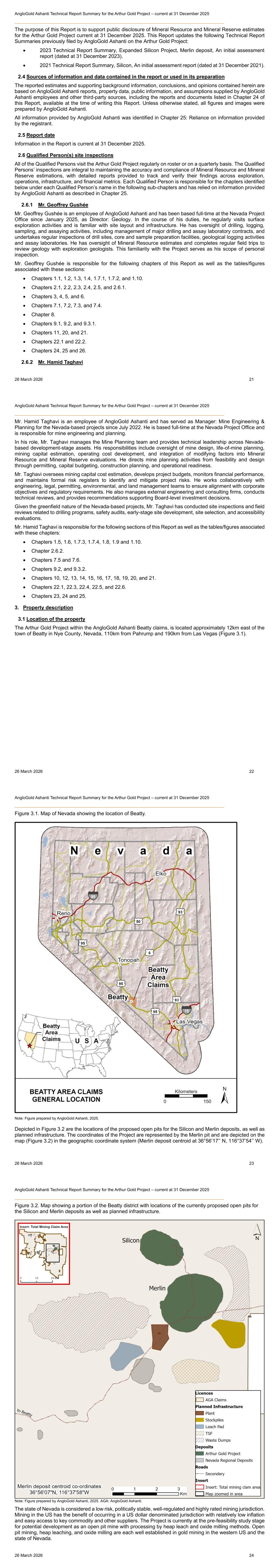 AngloGold Ashanti Technical Report Summary for the Arthur Gold Project – current at 31 December 2025 __________________________________________________________________________________________ 26 March 2026 21 The purpose of this Report is to support public disclosure of Mineral Resource and Mineral Reserve estimates for the Arthur Gold Project current at 31 December 2025. This Report updates the following Technical Report Summaries previously filed by AngloGold Ashanti on the Arthur Gold Project: • 2023 Technical Report Summary, Expanded Silicon Project, Merlin deposit, An initial assessment report (dated at 31 December 2023). • 2021 Technical Report Summary, Silicon, An initial assessment report (dated at 31 December 2021). 2.4 Sources of information and data contained in the report or used in its preparation The reported estimates and supporting background information, conclusions, and opinions contained herein are based on AngloGold Ashanti reports, property data, public information, and assumptions supplied by AngloGold Ashanti employees and other third-party sources, including the reports and documents listed in Chapter 24 of this Report, available at the time of writing this Report. Unless otherwise stated, all figures and images were prepared by AngloGold Ashanti. All information provided by AngloGold Ashanti was identified in Chapter 25: Reliance on information provided by the registrant. 2.5 Report date Information in the Report is current at 31 December 2025. 2.6 Qualified Person(s) site inspections All of the Qualified Persons visit the Arthur Gold Project regularly on roster or on a quarterly basis. The Qualified Persons’ inspections are integral to maintaining the accuracy and compliance of Mineral Resource and Mineral Reserve estimations, with detailed reports provided to track and verify their findings across exploration, operations, infrastructure, and financial metrics. Each Qualified Person is responsible for the chapters identified below under each Qualified Person’s name in the following sub-chapters and has relied on information provided by AngloGold Ashanti as described in Chapter 25. 2.6.1 Mr. Geoffrey Gushée Mr. Geoffrey Gushée is an employee of AngloGold Ashanti and has been based full-time at the Nevada Project Office since January 2025, as Director: Geology. In the course of his duties, he regularly visits surface exploration activities and is familiar with site layout and infrastructure. He has oversight of drilling, logging, sampling, and assaying activities, including management of major drilling and assay laboratory contracts, and undertakes regular inspections of drill sites, core and sample preparation facilities, geological logging activities and assay laboratories. He has oversight of Mineral Resource estimates and completes regular field trips to review geology with exploration geologists. This familiarity with the Project serves as his scope of personal inspection. Mr. Geoffrey Gushée is responsible for the following chapters of this Report as well as the tables/figures associated with these sections: • Chapters 1.1, 1.2, 1.3, 1.4, 1.7.1, 1.7.2, and 1.10. • Chapters 2.1, 2.2, 2.3, 2.4, 2.5, and 2.6.1. • Chapters 3, 4, 5, and 6. • Chapters 7.1, 7.2, 7.3, and 7.4. • Chapter 8. • Chapters 9.1, 9.2, and 9.3.1. • Chapters 11, 20, and 21. • Chapters 22.1 and 22.2. • Chapters 24, 25 and 26. 2.6.2 Mr. Hamid Taghavi AngloGold Ashanti Technical Report Summary for the Arthur Gold Project – current at 31 December 2025 __________________________________________________________________________________________ 26 March 2026 22 Mr. Hamid Taghavi is an employee of AngloGold Ashanti and has served as Manager: Mine Engineering & Planning for the Nevada-based projects since July 2022. He is based full-time at the Nevada Project Office and is responsible for mine engineering and planning. In his role, Mr. Taghavi manages the Mine Planning team and provides technical leadership across Nevada- based development-stage assets. His responsibilities include oversight of mine design, life-of-mine planning, mining capital estimation, operating cost development, and integration of modifying factors into Mineral Resource and Mineral Reserve evaluations. He directs mine planning activities from feasibility and design through permitting, capital budgeting, construction planning, and operational readiness. Mr. Taghavi oversees mining capital cost estimation, develops project budgets, monitors financial performance, and maintains formal risk registers to identify and mitigate project risks. He works collaboratively with engineering, legal, permitting, environmental, and land management teams to ensure alignment with corporate objectives and regulatory requirements. He also manages external engineering and consulting firms, conducts technical reviews, and provides recommendations supporting Board-level investment decisions. Given the greenfield nature of the Nevada-based projects, Mr. Taghavi has conducted site inspections and field reviews related to drilling programs, safety audits, early-stage site development, site selection, and accessibility evaluations. Mr. Hamid Taghavi is responsible for the following sections of this Report as well as the tables/figures associated with these chapters: • Chapters 1.5, 1.6, 1.7.3, 1.7.4, 1.8, 1.9 and 1.10. • Chapter 2.6.2. • Chapters 7.5 and 7.6. • Chapters 9.2, and 9.3.2. • Chapters 10, 12, 13, 14, 15, 16, 17, 18, 19, 20, and 21. • Chapters 22.1, 22.3, 22.4, 22.5, and 22.6. • Chapters 23, 24 and 25. 3. Property description 3.1 Location of the property The Arthur Gold Project within the AngloGold Ashanti Beatty claims, is located approximately 12km east of the town of Beatty in Nye County, Nevada, 110km from Pahrump and 190km from Las Vegas (Figure 3.1). AngloGold Ashanti Technical Report Summary for the Arthur Gold Project – current at 31 December 2025 ____________________________________________