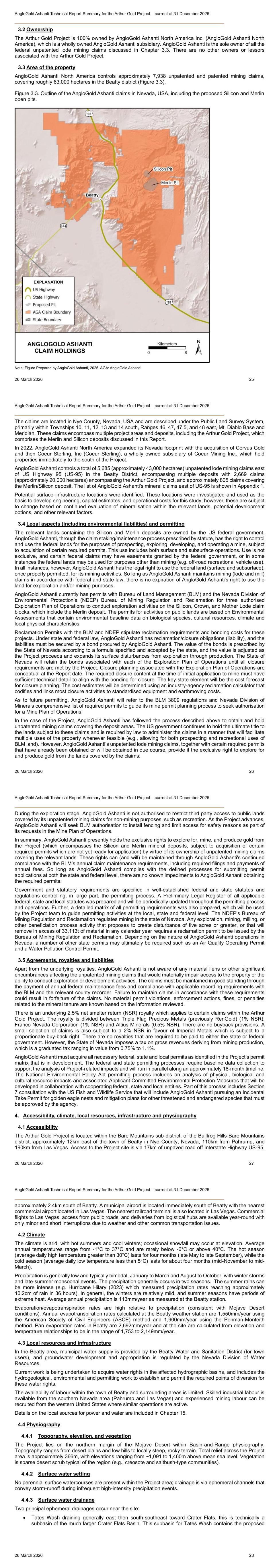 AngloGold Ashanti Technical Report Summary for the Arthur Gold Project – current at 31 December 2025 __________________________________________________________________________________________ 26 March 2026 25 3.2 Ownership The Arthur Gold Project is 100% owned by AngloGold Ashanti North America Inc. (AngloGold Ashanti North America), which is a wholly owned AngloGold Ashanti subsidiary. AngloGold Ashanti is the sole owner of all the federal unpatented lode mining claims discussed in Chapter 3.3. There are no other owners or lessors associated with the Arthur Gold Project. 3.3 Area of the property AngloGold Ashanti North America controls approximately 7,938 unpatented and patented mining claims, covering roughly 63,000 hectares in the Beatty district (Figure 3.3). Figure 3.3. Outline of the AngloGold Ashanti claims in Nevada, USA, including the proposed Silicon and Merlin open pits. Note: Figure Prepared by AngloGold Ashanti, 2025. AGA: AngloGold Ashanti. AngloGold Ashanti Technical Report Summary for the Arthur Gold Project – current at 31 December 2025 __________________________________________________________________________________________ 26 March 2026 26 The claims are located in Nye County, Nevada, USA and are described under the Public Land Survey System, primarily within Townships 10, 11, 12, 13 and 14 south, Ranges 46, 47, 47.5, and 48 east, Mt. Diablo Base and Meridian. These claims encompass multiple project areas and deposits, including the Arthur Gold Project, which comprises the Merlin and Silicon deposits discussed in this Report. In 2022, AngloGold Ashanti North America expanded its Nevada footprint with the acquisition of Corvus Gold and then Coeur Sterling, Inc (Coeur Sterling), a wholly owned subsidiary of Coeur Mining Inc., which held properties immediately to the south of the Project. AngloGold Ashanti controls a total of 5,685 (approximately 43,000 hectares) unpatented lode mining claims east of US Highway 95 (US-95) in the Beatty District, encompassing multiple deposits with 2,669 claims (approximately 20,000 hectares) encompassing the Arthur Gold Project, and approximately 805 claims covering the Merlin/Silicon deposit. The list of AngloGold Ashanti's mineral claims east of US-95 is shown in Appendix 1. Potential surface infrastructure locations were identified. These locations were investigated and used as the basis to develop engineering, capital estimates, and operational costs for this study; however, these are subject to change based on continued evaluation of mineralisation within the relevant lands, potential development options, and other relevant factors. 3.4 Legal aspects (including environmental liabilities) and permitting The relevant lands containing the Silicon and Merlin deposits are owned by the US federal government. AngloGold Ashanti, through the claim staking/maintenance process prescribed by statute, has the right to control and use the federal lands for the purposes of prospecting, exploring, developing, and operating a mine, subject to acquisition of certain required permits. This use includes both surface and subsurface operations. Use is not exclusive, and certain federal claims may have easements granted by the federal government, or in some instances the federal lands may be used for purposes other than mining (e.g. off-road recreational vehicle use). In all instances, however, AngloGold Ashanti has the legal right to use the federal land (surface and subsurface), once properly permitted, for its mining activities. So long as AngloGold Ashanti maintains mining (lode and mill) claims in accordance with federal and state law, there is no expiration of AngloGold Ashanti's right to use the land for exploration and/or mining purposes. AngloGold Ashanti currently has permits with Bureau of Land Management (BLM) and the Nevada Division of Environmental Protection’s (NDEP) Bureau of Mining Regulation and Reclamation for three authorised Exploration Plan of Operations to conduct exploration activities on the Silicon, Crown, and Mother Lode claim blocks, which include the Merlin deposit. The permits for activities on public lands are based on Environmental Assessments that contain environmental baseline data on biological species, cultural resources, climate and local physical characteristics. Reclamation Permits with the BLM and NDEP stipulate reclamation requirements and bonding costs for these projects. Under state and federal law, AngloGold Ashanti has reclamation/closure obligations (liability), and the liabilities must be secured by a bond procured by AngloGold Ashanti. The value of the bonds is prescribed by the State of Nevada according to a formula specified and accepted by the state, and the value is adjusted as the Project proceeds and expands its surface disturbances from exploration through production. The State of Nevada will retain the bonds associated with each of the Exploration Plan of Operations until all closure requirements are met by the Project. Closure planning associated with the Exploration Plan of Operations are conceptual at the Report date. The required closure content at the time of initial application to mine must have sufficient technical detail to align with the bonding for closure. The key state element will be the cost forecast for closure planning. The cost estimates will be determined using an industry-agency reclamation calculator that codifies and links most closure activities to standardised equipment and earthmoving costs. As to future permitting, AngloGold Ashanti will refer to the BLM 3809 regulations and Nevada Division of Minerals comprehensive list of required permits to guide its mine permit planning process to seek authorisation for a Mine Plan of Operations. In the case of the Project, AngloGold Ashanti has followed the process described above to obtain and hold unpatented mining claims covering the deposit areas. The US government continues to hold the ultimate title to the lands subject to th
