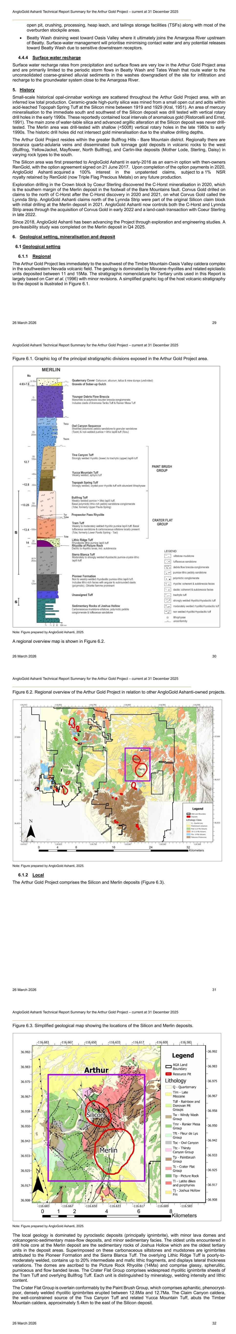 AngloGold Ashanti Technical Report Summary for the Arthur Gold Project – current at 31 December 2025 __________________________________________________________________________________________ 26 March 2026 29 open pit, crushing, processing, heap leach, and tailings storage facilities (TSFs) along with most of the overburden stockpile areas. • Beatty Wash draining west toward Oasis Valley where it ultimately joins the Amargosa River upstream of Beatty. Surface-water management will prioritise minimising contact water and any potential releases toward Beatty Wash due to sensitive downstream receptors. 4.4.4 Surface water recharge Surface water recharge rates from precipitation and surface flows are very low in the Arthur Gold Project area and are primarily limited to the periodic storm flows in Beatty Wash and Tates Wash that route water to the unconsolidated coarse-grained alluvial sediments in the washes downgradient of the site for infiltration and recharge to the groundwater system close to the Amargosa River. 5. History Small-scale historical opal-cinnabar workings are scattered throughout the Arthur Gold Project area, with an inferred low total production. Ceramic-grade high-purity silica was mined from a small open cut and adits within acid-leached Topopah Spring Tuff at the Silicon mine between 1919 and 1929 (Kral, 1951). An area of mercury mineralisation to the immediate south and southwest of the Silicon deposit was drill tested with vertical rotary drill holes in the early 1990s. These reportedly contained local intervals of anomalous gold (Ristorcelli and Ernst, 1991). The main zone of water-table silica and advanced argillic alteration at the Silicon deposit was never drill- tested. The Merlin area was drill-tested with shallow (<500ft) vertical rotary holes in the late 1980s to early 1990s. The historic drill holes did not intersect gold mineralisation due to the shallow drilling depths. The Arthur Gold Project resides within the greater Bullfrog Hills - Bare Mountain district. Regionally there are bonanza quartz-adularia veins and disseminated bulk tonnage gold deposits in volcanic rocks to the west (Bullfrog, YellowJacket, Mayflower, North Bullfrog), and Carlin-like deposits (Mother Lode, Sterling, Daisy) in varying rock types to the south. The Silicon area was first presented to AngloGold Ashanti in early-2016 as an earn-in option with then-owners RenGold, with the option agreement signed on 21 June 2017. Upon completion of the option payments in 2020, AngloGold Ashanti acquired a 100% interest in the unpatented claims, subject to a 1% NSR royalty retained by RenGold (now Triple Flag Precious Metals) on any future production. Exploration drilling in the Crown block by Coeur Sterling discovered the C-Horst mineralisation in 2020, which is the southern margin of the Merlin deposit in the footwall of the Bare Mountains fault. Corvus Gold drilled on claims to the north of C-Horst after the C-Horst discovery in 2020 and 2021, on what Corvus Gold called the Lynnda Strip. AngloGold Ashanti claims north of the Lynnda Strip were part of the original Silicon claim block with initial drilling at the Merlin deposit in 2021. AngloGold Ashanti now controls both the C-Horst and Lynnda Strip areas through the acquisition of Corvus Gold in early 2022 and a land-cash transaction with Coeur Sterling in late 2022. Since 2018, AngloGold Ashanti has been advancing the Project through exploration and engineering studies. A pre-feasibility study was completed on the Merlin deposit in Q4 2025. 6. Geological setting, mineralisation and deposit 6.1 Geological setting 6.1.1 Regional The Arthur Gold Project lies immediately to the southwest of the Timber Mountain-Oasis Valley caldera complex in the southwestern Nevada volcanic field. The geology is dominated by Miocene rhyolites and related epiclastic units deposited between 11 and 15Ma. The stratigraphic nomenclature for Tertiary units used in this Report is largely based on Carr et al. (1996) with minor revisions. A simplified graphic log of the host volcanic stratigraphy to the deposit is illustrated in Figure 6.1. AngloGold Ashanti Technical Report Summary for the Arthur Gold Project – current at 31 December 2025 __________________________________________________________________________________________ 26 March 2026 30 Figure 6.1. Graphic log of the principal stratigraphic divisions exposed in the Arthur Gold Project area. Note: Figure prepared by AngloGold Ashanti, 2025. A regional overview map is shown in Figure 6.2. AngloGold Ashanti Technical Report Summary for the Arthur Gold Project – current at 31 December 2025 __________________________________________________________________________________________ 26 March 2026 31 Figure 6.2. Regional overview of the Arthur Gold Project in relation to other AngloGold Ashanti-owned projects. Note: Figure prepared by AngloGold Ashanti, 2025. 6.1.2 Local The Arthur Gold Project comprises the Silicon and Merlin deposits (Figure 6.3). AngloGold Ashanti Technical Report Summary for the Arthur Gold Project – current at 31 December 2025 __________________________________________________________________________________________ 26 March 2026 32 Figure 6.3. Simplified geological map showing the locations of the Silicon and Merlin deposits. Note: Figure prepared by AngloGold Ashanti, 2025. The local geology is dominated by pyroclastic deposits (principally ignimbrite), with minor lava domes and volcanogenic-sedimentary mass-flow deposits, and minor sedimentary facies. The oldest units encountered in drill hole core at the Merlin deposit are the sedimentary rocks of Joshua Hollow which are the oldest tertiary units in the deposit areas. Superimposed on these carbonaceous siltstones and mudstones are ignimbrites attributed to the Pioneer Formation and the Sierra Blanca Tuff. The overlying Lithic Ridge Tuff is poorly-to- moderately welded, contains up to 20% intermediate and mafic lithic fragments, and displa