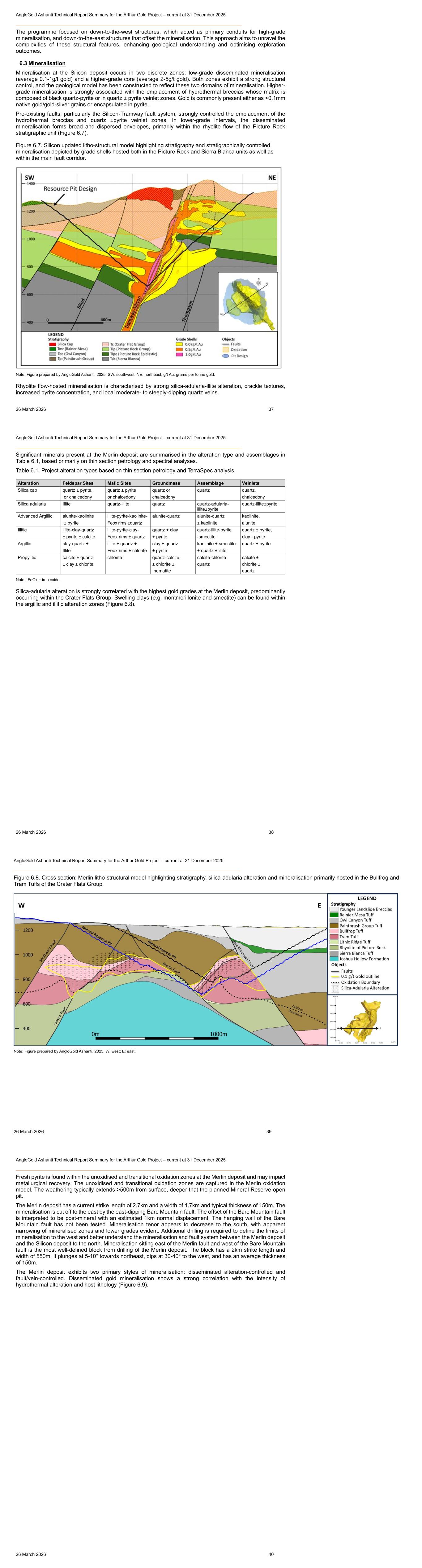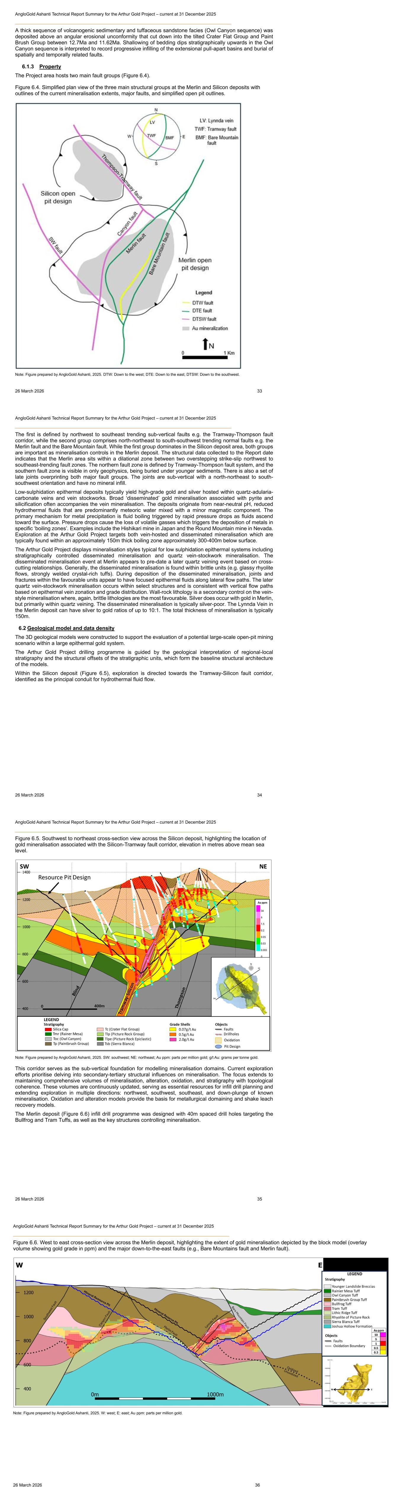 AngloGold Ashanti Technical Report Summary for the Arthur Gold Project – current at 31 December 2025 __________________________________________________________________________________________ 26 March 2026 37 The programme focused on down-to-the-west structures, which acted as primary conduits for high-grade mineralisation, and down-to-the-east structures that offset the mineralisation. This approach aims to unravel the complexities of these structural features, enhancing geological understanding and optimising exploration outcomes. 6.3 Mineralisation Mineralisation at the Silicon deposit occurs in two discrete zones: low-grade disseminated mineralisation (average 0.1-1g/t gold) and a higher-grade core (average 2-5g/t gold). Both zones exhibit a strong structural control, and the geological model has been constructed to reflect these two domains of mineralisation. Higher- grade mineralisation is strongly associated with the emplacement of hydrothermal breccias whose matrix is composed of black quartz-pyrite or in quartz ± pyrite veinlet zones. Gold is commonly present either as <0.1mm native gold/gold-silver grains or encapsulated in pyrite. Pre-existing faults, particularly the Silicon-Tramway fault system, strongly controlled the emplacement of the hydrothermal breccias and quartz ±pyrite veinlet zones. In lower-grade intervals, the disseminated mineralisation forms broad and dispersed envelopes, primarily within the rhyolite flow of the Picture Rock stratigraphic unit (Figure 6.7). Figure 6.7. Silicon updated litho-structural model highlighting stratigraphy and stratigraphically controlled mineralisation depicted by grade shells hosted both in the Picture Rock and Sierra Blanca units as well as within the main fault corridor. Note: Figure prepared by AngloGold Ashanti, 2025. SW: southwest; NE: northeast; g/t Au: grams per tonne gold. Rhyolite flow-hosted mineralisation is characterised by strong silica-adularia-illite alteration, crackle textures, increased pyrite concentration, and local moderate- to steeply-dipping quartz veins. AngloGold Ashanti Technical Report Summary for the Arthur Gold Project – current at 31 December 2025 __________________________________________________________________________________________ 26 March 2026 38 Significant minerals present at the Merlin deposit are summarised in the alteration type and assemblages in Table 6.1, based primarily on thin section petrology and spectral analyses. Table 6.1. Project alteration types based on thin section petrology and TerraSpec analysis. Alteration Feldspar Sites Mafic Sites Groundmass Assemblage Veinlets Silica cap quartz ± pyrite, quartz ± pyrite quartz or quartz quartz, or chalcedony or chalcedony chalcedony chalcedony Silica adularia Illite quartz-illite quartz quartz-adularia- illite±pyrite quartz-illite±pyrite Advanced Argillic alunite-kaolinite illite-pyrite-kaolinite- alunite-quartz alunite-quartz kaolinite, ± pyrite Feox rims ±quartz ± kaolinite alunite Illitic illite-clay-quartz illite-pyrite-clay- quartz + clay quartz-illite-pyrite quartz ± pyrite, ± pyrite ± calcite Feox rims ± quartz + pyrite -smectite clay - pyrite Argillic clay-quartz ± illite + quartz + clay + quartz kaolinite + smectite quartz ± pyrite Illite Feox rims ± chlorite ± pyrite + quartz ± illite Propylitic calcite ± quartz chlorite quartz-calcite- calcite-chlorite- calcite ± ± clay ± chlorite ± chlorite ± quartz chlorite ± hematite quartz Note: FeOx = iron oxide. Silica-adularia alteration is strongly correlated with the highest gold grades at the Merlin deposit, predominantly occurring within the Crater Flats Group. Swelling clays (e.g. montmorillonite and smectite) can be found within the argillic and illitic alteration zones (Figure 6.8). AngloGold Ashanti Technical Report Summary for the Arthur Gold Project – current at 31 December 2025 __________________________________________________________________________________________ 26 March 2026 39 Figure 6.8. Cross section: Merlin litho-structural model highlighting stratigraphy, silica-adularia alteration and mineralisation primarily hosted in the Bullfrog and Tram Tuffs of the Crater Flats Group. Note: Figure prepared by AngloGold Ashanti, 2025. W: west; E: east. AngloGold Ashanti Technical Report Summary for the Arthur Gold Project – current at 31 December 2025 __________________________________________________________________________________________ 26 March 2026 40 Fresh pyrite is found within the unoxidised and transitional oxidation zones at the Merlin deposit and may impact metallurgical recovery. The unoxidised and transitional oxidation zones are captured in the Merlin oxidation model. The weathering typically extends >500m from surface, deeper that the planned Mineral Reserve open pit. The Merlin deposit has a current strike length of 2.7km and a width of 1.7km and typical thickness of 150m. The mineralisation is cut off to the east by the east-dipping Bare Mountain fault. The offset of the Bare Mountain fault is interpreted to be post-mineral with an estimated 1km normal displacement. The hanging wall of the Bare Mountain fault has not been tested. Mineralisation tenor appears to decrease to the south, with apparent narrowing of mineralised zones and lower grades evident. Additional drilling is required to define the limits of mineralisation to the west and better understand the mineralisation and fault system between the Merlin deposit and the Silicon deposit to the north. Mineralisation sitting east of the Merlin fault and west of the Bare Mountain fault is the most well-defined block from drilling of the Merlin deposit. The block has a 2km strike length and width of 550m. It plunges at 5-10° towards northeast, dips at 30-40° to the west, and has an average thickness of 150m. The Merlin deposit exhibits two primary styles of mineralisation: disseminated alteration-controlled and fault/vein-controlled. Disseminated gold mineralisation shows a