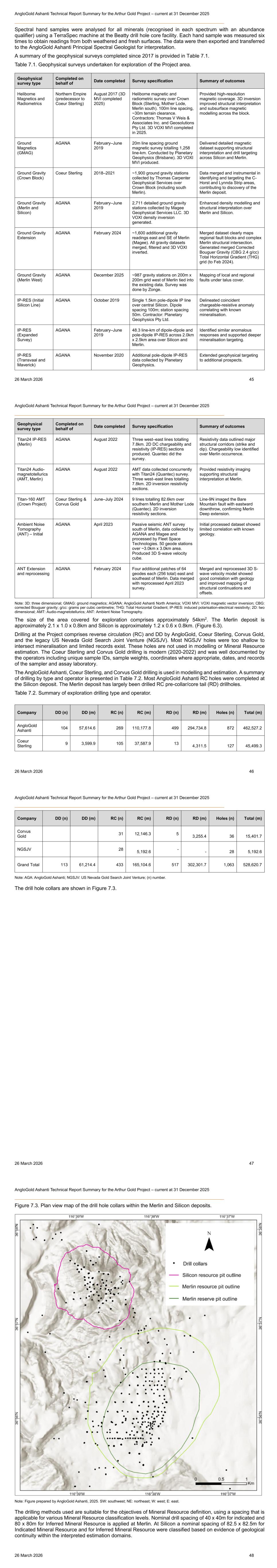 AngloGold Ashanti Technical Report Summary for the Arthur Gold Project – current at 31 December 2025 __________________________________________________________________________________________ 26 March 2026 41 Figure 6.9. Long section: Merlin litho-structural model highlighting stratigraphy and mineralisation depicted by the block model, primarily hosted in the Bullfrog and Tram Tuffs of the Crater Flat Group. Note: Figure prepared by AngloGold Ashanti, 2025. Au ppm: parts per million gold. AngloGold Ashanti Technical Report Summary for the Arthur Gold Project – current at 31 December 2025 __________________________________________________________________________________________ 26 March 2026 42 The Crater Flats Group serves as a favourable host for both disseminated and vein-style mineralisation due to its brittle nature, providing an excellent conduit for fluid flow. Core logging from diamond drill (DD) holes indicates that the Merlin deposit underwent multiple pulses of hydrothermal fluid activity. Silica-adularia alteration plays a critical role in mineralisation by both introducing gold-rich fluids and increasing host rock brittleness, making it more prone to fracturing. This fracturing prepared the ground for subsequent hydrothermal pulses, further enhancing mineralisation potential. Additional studies are needed to determine the number of mineralising events and their relative timing. The variability in gold grades is similar between the two styles of mineralisation, ranging from 0.1g/t to greater than 100g/t gold. 7. Exploration 7.1 Nature and extent of relevant exploration work In addition to Mineral Resource definition drilling, detailed geological mapping at 1:5,000 scale was completed over a total area of 58km2. AngloGold Ashanti conducted a topographic survey in 2024 using NAD83 (North American Datum of 1983) Universal Transverse Mercator (UTM) Zone 11N coordinate system with a resolution of 1m. The ground geophysics completed over the duration of the Project is summarised below. AngloGold Ashanti also completed geochemical sampling comprising outcrop rock chip sampling and a 2.6 x 2.3km soil survey was also completed at various phases of the exploration programme. During August and September, 2017, surface geologic-structural mapping and collection of 233 rock chip geochemical samples were completed to define drill targets. Rock chip samples were collected of different alteration types at structural intersections; however, consistent geochemical halos were not defined in rock chips. The one element that reported consistently elevated values was mercury, with over 4ppm mercury in 8% of all samples (Figure 7.1). AngloGold Ashanti Technical Report Summary for the Arthur Gold Project – current at 31 December 2025 __________________________________________________________________________________________ 26 March 2026 43 Figure 7.1. Map showing the Arthur Gold Project pit outlines and mercury (Hg) results from surface rock grab samples. Note: Figure prepared by AngloGold Ashanti, 2025. Hg (ppm): parts per million mercury. Throughout the first quarter of 2018, a gridded 318 soil and spectral programme (200 x 400m sample spacing, reducing to 200 x 200m spacing over zones of mapped ASTER anomalies) was completed over an area of 2.6 x 2.3km (Figure 7.2). AngloGold Ashanti Technical Report Summary for the Arthur Gold Project – current at 31 December 2025 __________________________________________________________________________________________ 26 March 2026 44 Figure 7.2. Map showing sample location for soil and spectral programme conducted in Silicon. Note: Figure prepared by AngloGold Ashanti. Soil samples are indicated as ‘Sil_SoilSample Locations’ and spectral samples as ‘A3841_WhiteMica’. Samples were collected and sieved down in the field to approximately 3kg passing a 1mm fraction size. The greater than 1mm fraction was discarded on site. Samples were then zip-tied and transported to the AngloGold Ashanti Beatty drill hole core facility and placed in rice sacks for transport to the Australian Laboratory Services (ALS) laboratory in Reno, Nevada (ALS Reno). A hand sample was also collected along the grid for hyperspectral analysis. The spectral samples were labelled with the site sample number and transported to the AngloGold Ashanti Beatty drill hole core facility for analysis. The soil results indicate a very patchy pathfinder elemental zoning (including gold, zinc, lead, molybdenum, and bismuth) with low, at or near background levels, or at best, very weakly elevated values.