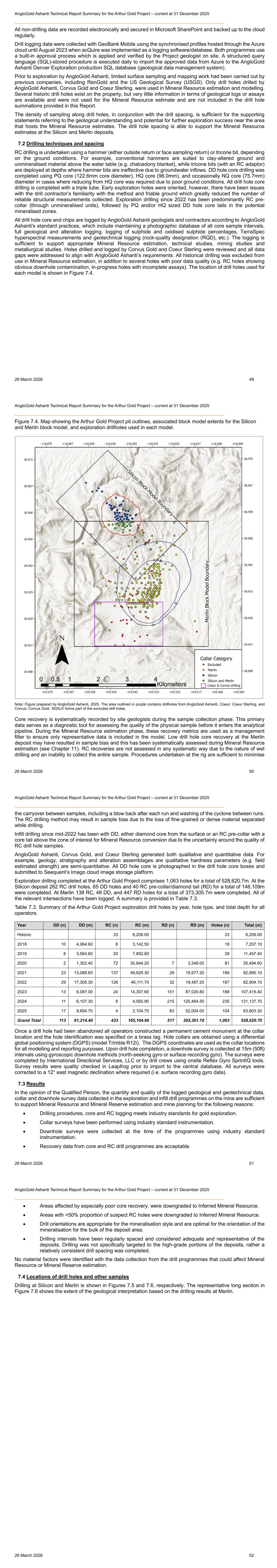 AngloGold Ashanti Technical Report Summary for the Arthur Gold Project – current at 31 December 2025 __________________________________________________________________________________________ 26 March 2026 49 All non-drilling data are recorded electronically and secured in Microsoft SharePoint and backed up to the cloud regularly. Drill logging data were collected with GeoBank Mobile using the synchronised profiles hosted through the Azure cloud until August 2023 when acQuire was implemented as a logging software/database. Both programmes use a built-in approval process which is applied and verified by the Project geologist on site. A structured query language (SQL)-stored procedure is executed daily to import the approved data from Azure to the AngloGold Ashanti Denver Exploration production SQL database (geological data management system). Prior to exploration by AngloGold Ashanti, limited surface sampling and mapping work had been carried out by previous companies, including RenGold and the US Geological Survey (USGS). Only drill holes drilled by AngloGold Ashanti, Corvus Gold and Coeur Sterling. were used in Mineral Resource estimation and modelling. Several historic drill holes exist on the property, but very little information in terms of geological logs or assays are available and were not used for the Mineral Resource estimate and are not included in the drill hole summations provided in this Report. The density of sampling along drill holes, in conjunction with the drill spacing, is sufficient for the supporting statements referring to the geological understanding and potential for further exploration success near the area that hosts the Mineral Resource estimates. The drill hole spacing is able to support the Mineral Resource estimates at the Silicon and Merlin deposits. 7.2 Drilling techniques and spacing RC drilling is undertaken using a hammer (either outside return or face sampling return) or tricone bit, depending on the ground conditions. For example, conventional hammers are suited to clay-altered ground and unmineralised material above the water table (e.g. chalcedony blanket), while tricone bits (with an RC adaptor) are deployed at depths where hammer bits are ineffective due to groundwater inflows. DD hole core drilling was completed using PQ core (122.6mm core diameter), HQ core (96.0mm), and occasionally NQ core (75.7mm) diameter in cases where reducing from HQ core was required due to poor ground conditions. All drill hole core drilling is completed with a triple tube. Early exploration holes were oriented, however, there have been issues with the drill contractor’s familiarity with the method and friable ground which greatly reduced the number of reliable structural measurements collected. Exploration drilling since 2022 has been predominantly RC pre- collar (through unmineralised units), followed by PQ and/or HQ sized DD hole core tails in the potential mineralised zones. All drill hole core and chips are logged by AngloGold Ashanti geologists and contractors according to AngloGold Ashanti's standard practices, which include maintaining a photographic database of all core sample intervals, full geological and alteration logging, logging of sulphide and oxidised sulphide percentages, TerraSpec hyperspectral measurements and geotechnical logging (rock-quality designation (RQD), etc.). The logging is sufficient to support appropriate Mineral Resource estimation, technical studies, mining studies and metallurgical studies. Holse drilled and logged by Corvus Gold and Coeur Sterling were reviewed and all data gaps were addressed to align with AngloGold Ashanti’s requirements. All historical drilling was excluded from use in Mineral Resource estimation, in addition to several holes with poor data quality (e.g. RC holes showing obvious downhole contamination, in-progress holes with incomplete assays). The location of drill holes used for each model is shown in Figure 7.4. AngloGold Ashanti Technical Report Summary for the Arthur Gold Project – current at 31 December 2025 __________________________________________________________________________________________ 26 March 2026 50 Figure 7.4. Map showing the Arthur Gold Project pit outlines, associated block model extents for the Silicon and Merlin block model, and exploration drillholes used in each model. Note: Figure prepared by AngloGold Ashanti, 2025. The area outlined in purple contains drillholes from AngloGold Ashanti, Coeur: Coeur Sterling, and Corvus: Corvus Gold. NGSJV forms part of the excluded drill holes. Core recovery is systematically recorded by site geologists during the sample collection phase. This primary data serves as a diagnostic tool for assessing the quality of the physical sample before it enters the analytical pipeline. During the Mineral Resource estimation phase, these recovery metrics are used as a management filter to ensure only representative data is included in the model. Low drill hole core recovery at the Merlin deposit may have resulted in sample bias and this has been systematically assessed during Mineral Resource estimation (see Chapter 11). RC recoveries are not assessed in any systematic way due to the nature of wet drilling and an inability to collect the entire sample. Procedures undertaken at the rig are sufficient to minimise AngloGold Ashanti Technical Report Summary for the Arthur Gold Project – current at 31 December 2025 __________________________________________________________________________________________ 26 March 2026 51 the carryover between samples, including a blow back after each run and washing of the cyclone between runs. The RC drilling method may result in sample bias due to the loss of fine-grained or dense material separated while drilling. Infill drilling since mid-2022 has been with DD, either diamond core from the surface or an RC pre-collar with a core tail above the zone of interest for Mineral Resource conversion due to the uncertainty around 