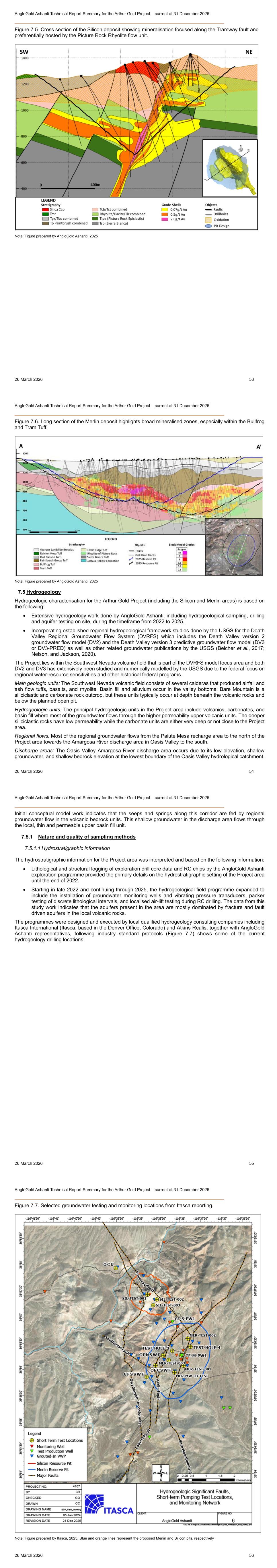 AngloGold Ashanti Technical Report Summary for the Arthur Gold Project – current at 31 December 2025 __________________________________________________________________________________________ 26 March 2026 53 Figure 7.5. Cross section of the Silicon deposit showing mineralisation focused along the Tramway fault and preferentially hosted by the Picture Rock Rhyolite flow unit. Note: Figure prepared by AngloGold Ashanti, 2025 AngloGold Ashanti Technical Report Summary for the Arthur Gold Project – current at 31 December 2025 __________________________________________________________________________________________ 26 March 2026 54 Figure 7.6. Long section of the Merlin deposit highlights broad mineralised zones, especially within the Bullfrog and Tram Tuff. Note: Figure prepared by AngloGold Ashanti, 2025 7.5 Hydrogeology Hydrogeologic characterisation for the Arthur Gold Project (including the Silicon and Merlin areas) is based on the following: • Extensive hydrogeology work done by AngloGold Ashanti, including hydrogeological sampling, drilling and aquifer testing on site, during the timeframe from 2022 to 2025. • Incorporating established regional hydrogeological framework studies done by the USGS for the Death Valley Regional Groundwater Flow System (DVRFS) which includes the Death Valley version 2 groundwater flow model (DV2) and the Death Valley version 3 predictive groundwater flow model (DV3 or DV3-PRED) as well as other related groundwater publications by the USGS (Belcher et al., 2017; Nelson, and Jackson, 2020). The Project lies within the Southwest Nevada volcanic field that is part of the DVRFS model focus area and both DV2 and DV3 has extensively been studied and numerically modelled by the USGS due to the federal focus on regional water-resource sensitivities and other historical federal programs. Main geologic units: The Southwest Nevada volcanic field consists of several calderas that produced airfall and ash flow tuffs, basalts, and rhyolite. Basin fill and alluvium occur in the valley bottoms. Bare Mountain is a siliciclastic and carbonate rock outcrop, but these units typically occur at depth beneath the volcanic rocks and below the planned open pit. Hydrogeologic units: The principal hydrogeologic units in the Project area include volcanics, carbonates, and basin fill where most of the groundwater flows through the higher permeability upper volcanic units. The deeper siliciclastic rocks have low permeability while the carbonate units are either very deep or not close to the Project area. Regional flows: Most of the regional groundwater flows from the Paiute Mesa recharge area to the north of the Project area towards the Amargosa River discharge area in Oasis Valley to the south. Discharge areas: The Oasis Valley Amargosa River discharge area occurs due to its low elevation, shallow groundwater, and shallow bedrock elevation at the lowest boundary of the Oasis Valley hydrological catchment. AngloGold Ashanti Technical Report Summary for the Arthur Gold Project – current at 31 December 2025 __________________________________________________________________________________________ 26 March 2026 55 Initial conceptual model work indicates that the seeps and springs along this corridor are fed by regional groundwater flow in the volcanic bedrock units. This shallow groundwater in the discharge area flows through the local, thin and permeable upper basin fill unit. 7.5.1 Nature and quality of sampling methods 7.5.1.1 Hydrostratigraphic information The hydrostratigraphic information for the Project area was interpreted and based on the following information: • Lithological and structural logging of exploration drill core data and RC chips by the AngloGold Ashanti exploration programme provided the primary details on the hydrostratigraphic setting of the Project area until the end of 2022. • Starting in late 2022 and continuing through 2025, the hydrogeological field programme expanded to include the installation of groundwater monitoring wells and vibrating pressure transducers, packer testing of discrete lithological intervals, and localised air-lift testing during RC drilling. The data from this study work indicates that the aquifers present in the area are mostly dominated by fracture and fault driven aquifers in the local volcanic rocks. The programmes were designed and executed by local qualified hydrogeology consulting companies including Itasca International (Itasca, based in the Denver Office, Colorado) and Atkins Realis, together with AngloGold Ashanti representatives, following industry standard protocols (Figure 7.7) shows some of the current hydrogeology drilling locations. AngloGold Ashanti Technical Report Summary for the Arthur Gold Project – current at 31 December 2025 __________________________________________________________________________________________ 26 March 2026 56 Figure 7.7. Selected groundwater testing and monitoring locations from Itasca reporting. Note: Figure prepared by Itasca, 2025. Blue and orange lines represent the proposed Merlin and Silicon pits, respectively