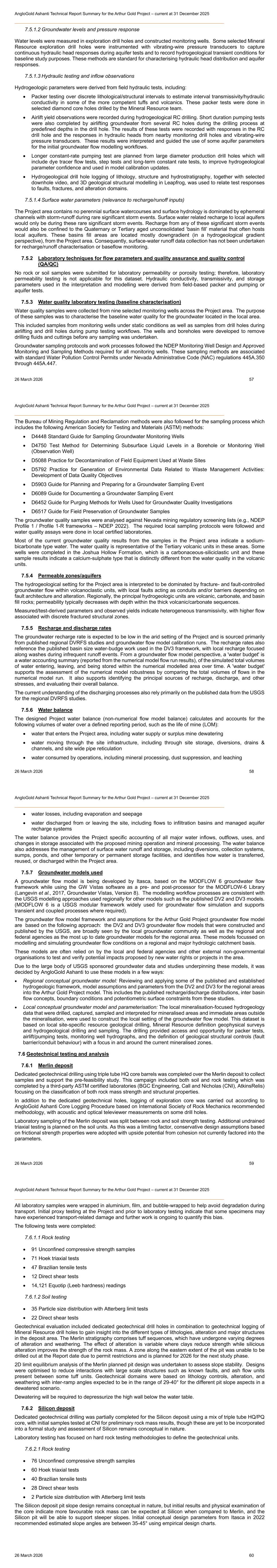 AngloGold Ashanti Technical Report Summary for the Arthur Gold Project – current at 31 December 2025 __________________________________________________________________________________________ 26 March 2026 57 7.5.1.2 Groundwater levels and pressure response Water levels were measured in exploration drill holes and constructed monitoring wells. Some selected Mineral Resource exploration drill holes were instrumented with vibrating-wire pressure transducers to capture continuous hydraulic head responses during aquifer tests and to record hydrogeological transient conditions for baseline study purposes. These methods are standard for characterising hydraulic head distribution and aquifer responses. 7.5.1.3 Hydraulic testing and inflow observations Hydrogeologic parameters were derived from field hydraulic tests, including: • Packer testing over discrete lithological/structural intervals to estimate interval transmissivity/hydraulic conductivity in some of the more competent tuffs and volcanics. These packer tests were done in selected diamond core holes drilled by the Mineral Resource team. • Airlift yield observations were recorded during hydrogeological RC drilling. Short duration pumping tests were also completed by airlifting groundwater from several RC holes during the drilling process at predefined depths in the drill hole. The results of these tests were recorded with responses in the RC drill hole and the responses in hydraulic heads from nearby monitoring drill holes and vibrating-wire pressure transducers. These results were interpreted and guided the use of some aquifer parameters for the initial groundwater flow modelling workflows. • Longer constant-rate pumping test are planned from large diameter production drill holes which will include dye tracer flow tests, step tests and long-term constant rate tests, to improve hydrogeological parameter confidence and used in model calibration updates. • Hydrogeological drill hole logging of lithology, structure and hydrostratigraphy, together with selected downhole video, and 3D geological structural modelling in Leapfrog, was used to relate test responses to faults, fractures, and alteration domains. 7.5.1.4 Surface water parameters (relevance to recharge/runoff inputs) The Project area contains no perennial surface watercourses and surface hydrology is dominated by ephemeral channels with storm-runoff during rare significant storm events. Surface water related recharge to local aquifers would only be during these rare significant storm events. Recharge from any of these significant storm events would also be confined to the Quaternary or Tertiary aged unconsolidated ‘basin fill’ material that often hosts local aquifers. These basins fill areas are located mostly downgradient (in a hydrogeological gradient perspective), from the Project area. Consequently, surface-water runoff data collection has not been undertaken for recharge/runoff characterisation or baseflow monitoring. 7.5.2 Laboratory techniques for flow parameters and quality assurance and quality control (QA/QC) No rock or soil samples were submitted for laboratory permeability or porosity testing; therefore, laboratory permeability testing is not applicable for this dataset. Hydraulic conductivity, transmissivity, and storage parameters used in the interpretation and modelling were derived from field-based packer and pumping or aquifer tests. 7.5.3 Water quality laboratory testing (baseline characterisation) Water quality samples were collected from nine selected monitoring wells across the Project area. The purpose of these samples was to characterise the baseline water quality for the groundwater located in the local area. This included samples from monitoring wells under static conditions as well as samples from drill holes during airlifting and drill holes during pump testing workflows. The wells and boreholes were developed to remove drilling fluids and cuttings before any sampling was undertaken. Groundwater sampling protocols and work processes followed the NDEP Monitoring Well Design and Approved Monitoring and Sampling Methods required for all monitoring wells. These sampling methods are associated with standard Water Pollution Control Permits under Nevada Administrative Code (NAC) regulations 445A.350 through 445A.447. AngloGold Ashanti Technical Report Summary for the Arthur Gold Project – current at 31 December 2025 __________________________________________________________________________________________ 26 March 2026 58 The Bureau of Mining Regulation and Reclamation methods were also followed for the sampling process which includes the following American Society for Testing and Materials (ASTM) methods: • D4448 Standard Guide for Sampling Groundwater Monitoring Wells • D4750 Test Method for Determining Subsurface Liquid Levels in a Borehole or Monitoring Well (Observation Well) • D5088 Practice for Decontamination of Field Equipment Used at Waste Sites • D5792 Practice for Generation of Environmental Data Related to Waste Management Activities: Development of Data Quality Objectives • D5903 Guide for Planning and Preparing for a Groundwater Sampling Event • D6089 Guide for Documenting a Groundwater Sampling Event • D6452 Guide for Purging Methods for Wells Used for Groundwater Quality Investigations • D6517 Guide for Field Preservation of Groundwater Samples The groundwater quality samples were analysed against Nevada mining regulatory screening lists (e.g., NDEP Profile 1 / Profile 1-R frameworks – NDEP 2022). The required local sampling protocols were followed and water quality assays were done in local certified laboratories. Most of the current groundwater quality results from the samples in the Project area indicate a sodium- bicarbonate type water. The water quality is representative of the Tertiary volcanic units in these areas. Some wells were completed in the Joshua Hollow Formation, which is a carbonaceous-siliciclas