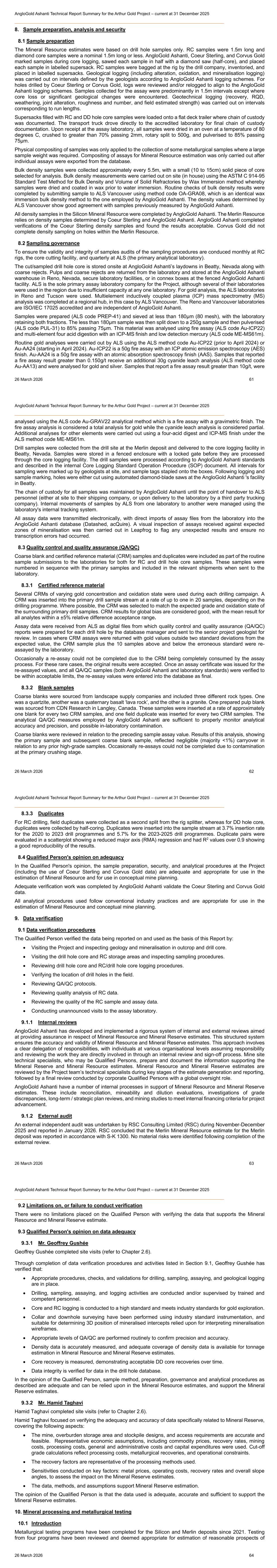 AngloGold Ashanti Technical Report Summary for the Arthur Gold Project – current at 31 December 2025 __________________________________________________________________________________________ 26 March 2026 61 8. Sample preparation, analysis and security 8.1 Sample preparation The Mineral Resource estimates were based on drill hole samples only. RC samples were 1.5m long and diamond core samples were a nominal 1.5m long or less. AngloGold Ashanti, Coeur Sterling, and Corvus Gold marked samples during core logging, sawed each sample in half with a diamond saw (half-core), and placed each sample in labelled supersack. RC samples were bagged at the rig by the drill company, inventoried, and placed in labelled supersacks. Geological logging (including alteration, oxidation, and mineralisation logging) was carried out on intervals defined by the geologists according to AngloGold Ashanti logging schemes. For holes drilled by Coeur Sterling or Corvus Gold, logs were reviewed and/or relogged to align to the AngloGold Ashanti logging schemes. Samples collected for the assay were predominantly in 1.5m intervals except where core loss or significant geological changes were encountered. Geotechnical logging (recovery, RQD, weathering, joint alteration, roughness and number, and field estimated strength) was carried out on intervals corresponding to run lengths. Supersacks filled with RC and DD hole core samples were loaded onto a flat deck trailer where chain of custody was documented. The transport truck drove directly to the accredited laboratory for final chain of custody documentation. Upon receipt at the assay laboratory, all samples were dried in an oven at a temperature of 80 degrees C, crushed to greater than 70% passing 2mm, rotary split to 500g, and pulverised to 85% passing 75µm. Physical compositing of samples was only applied to the collection of some metallurgical samples where a large sample weight was required. Compositing of assays for Mineral Resource estimation was only carried out after individual assays were exported from the database. Bulk density samples were collected approximately every 5.5m, with a small (10 to 15cm) solid piece of core selected for analysis. Bulk density measurements were carried out on site (in house) using the ASTM C 914-95 Standard Test Method for Bulk Density and Volume of Solid Refractories by Wax Immersion method whereby samples were dried and coated in wax prior to water immersion. Routine checks of bulk density results were completed by submitting sample to ALS Vancouver using method code OA-GRA08, which is an identical wax immersion bulk density method to the one employed by AngloGold Ashanti. The density values determined by ALS Vancouver show good agreement with samples previously measured by AngloGold Ashanti. All density samples in the Silicon Mineral Resource were completed by AngloGold Ashanti. The Merlin Resource relies on density samples determined by Coeur Sterling and AngloGold Ashanti. AngloGold Ashanti completed verifications of the Coeur Sterling density samples and found the results acceptable. Corvus Gold did not complete density sampling on holes within the Merlin Resource. 8.2 Sampling governance To ensure the validity and integrity of samples audits of the sampling procedures are conduced monthly at RC rigs, the core cutting facility, and quarterly at ALS (the primary analytical laboratory). The cut/sampled drill hole core is stored onsite at AngloGold Ashanti’s laydowns in Beatty, Nevada along with coarse rejects. Pulps and coarse rejects are returned from the laboratory and stored at the AngloGold Ashanti warehouse in Reno, Nevada, secure laboratory facilities, or in connex boxes at the fenced AngloGold Ashanti facility. ALS is the sole primary assay laboratory company for the Project, although several of their laboratories were used in the region due to insufficient capacity at any one laboratory. For gold analysis, the ALS laboratories in Reno and Tucson were used. Multielement inductively coupled plasma (ICP) mass spectrometry (MS) analysis was completed at a regional hub, in this case by ALS Vancouver. The Reno and Vancouver laboratories are ISO/IEC 17025 accredited and are independent of AngloGold Ashanti. Samples were prepared (ALS code PREP-41) and sieved at less than 180µm (80 mesh), with the laboratory retaining both fractions. The less than 180µm sample was then split down to a 250g sample and then pulverised (ALS code PUL-31) to 85% passing 75µm. This material was analysed using fire assay (ALS code Au-ICP22) and multi-element four acid digestion with an ICP-MS finish and low detection mercury (ALS code ME-MS61m). Routine gold analyses were carried out by ALS using the ALS method code Au-ICP22 (prior to April 2024) or Au-AA24 (starting in April 2024). Au-ICP22 is a 50g fire assay with an ICP atomic emission spectroscopy (AES) finish. Au-AA24 is a 50g fire assay with an atomic absorption spectroscopy finish (AAS). Samples that reported a fire assay result greater than 0.150g/t receive an additional 30g cyanide leach analysis (ALS method code Au-AA13) and were analysed for gold and silver. Samples that report a fire assay result greater than 10g/t, were AngloGold Ashanti Technical Report Summary for the Arthur Gold Project – current at 31 December 2025 __________________________________________________________________________________________ 26 March 2026 62 analysed using the ALS code Au-GRAV22 analytical method which is a fire assay with a gravimetric finish. The fire assay analysis is considered a total analysis for gold while the cyanide leach analysis is considered partial. Additional analyses for other elements were carried out using a four-acid digest and ICP-MS finish under the ALS method code ME-MS61m. Drill samples were collected from the drill site at the Merlin deposit and delivered to the core logging facility in Beatty, Nevada. Samples were stored in a fenced enclosure with a locked gate before t