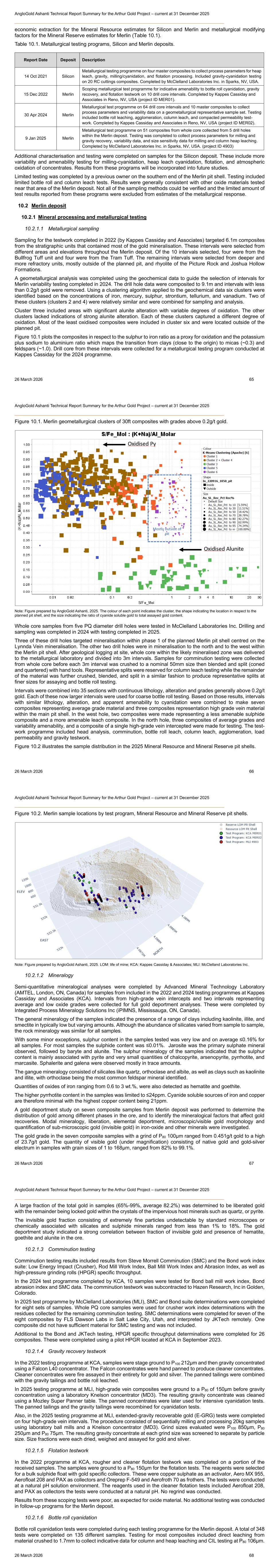 AngloGold Ashanti Technical Report Summary for the Arthur Gold Project – current at 31 December 2025 __________________________________________________________________________________________ 26 March 2026 65 economic extraction for the Mineral Resource estimates for Silicon and Merlin and metallurgical modifying factors for the Mineral Reserve estimates for Merlin (Table 10.1). Table 10.1. Metallurgical testing programs, Silicon and Merlin deposits. Report Date Deposit Description 14 Oct 2021 Silicon Metallurgical testing programme on four master composites to collect process parameters for heap leach, gravity, milling/cyanidation, and flotation processing. Included gravity-cyanidation testing on 20 RC cuttings composites. Completed by McClelland Laboratories Inc. in Sparks, NV, USA. 15 Dec 2022 Merlin Scoping metallurgical test programme for indicative amenability to bottle roll cyanidation, gravity recovery, and flotation testwork on 10 drill core intervals. Completed by Kappes Cassiday and Associates in Reno, NV, USA (project ID MER01). 30 Apr 2024 Merlin Metallurgical test programme on 64 drill core intervals and 10 master composites to collect process parameters and variability data on a geometallurgical representative sample set. Testing included bottle roll leaching, agglomeration, column leach, and compacted permeability test- work. Completed by Kappes Cassiday and Associates in Reno, NV, USA (project ID MER02). 9 Jan 2025 Merlin Metallurgical test programme on 51 composites from whole core collected from 5 drill holes within the Merlin deposit. Testing was completed to collect process parameters for milling and gravity recovery, variability data, and size sensitivity data for milling and column heap leaching. Completed by McClelland Laboratories Inc. in Sparks, NV, USA. (project ID 4903) Additional characterisation and testing were completed on samples for the Silicon deposit. These include more variability and amenability testing for milling-cyanidation, heap leach cyanidation, flotation, and atmospheric oxidation of concentrates. Results from these programs will be incorporated into future studies. Limited testing was completed by a previous owner on the southern end of the Merlin pit shell. Testing included limited bottle roll and column leach tests. Results were generally consistent with other oxide materials tested near that area of the Merlin deposit. Not all of the sampling methods could be verified and the limited amount of test results reported from these programs were excluded from estimates of the metallurgical response. 10.2 Merlin deposit 10.2.1 Mineral processing and metallurgical testing 10.2.1.1 Metallurgical sampling Sampling for the testwork completed in 2022 (by Kappes Cassiday and Associates) targeted 6.1m composites from the stratigraphic units that contained most of the gold mineralisation. These intervals were selected from different areas and elevations throughout the Merlin deposit. Of the 10 intervals selected, four were from the Bullfrog Tuff unit and four were from the Tram Tuff. The remaining intervals were selected from deeper and more refractory units, mostly outside of the planned pit, and rhyolite of the Picture Rock and Joshua Hollow Formations. A geometallurgical analysis was completed using the geochemical data to guide the selection of intervals for Merlin variability testing completed in 2024. The drill hole data were composited to 9.1m and intervals with less than 0.2g/t gold were removed. Using a clustering algorithm applied to the geochemical data six clusters were identified based on the concentrations of iron, mercury, sulphur, strontium, tellurium, and vanadium. Two of these clusters (clusters 2 and 4) were relatively similar and were combined for sampling and analysis. Cluster three included areas with significant alunite alteration with variable degrees of oxidation. The other clusters lacked indications of strong alunite alteration. Each of these clusters captured a different degree of oxidation. Most of the least oxidised composites were included in cluster six and were located outside of the planned pit. Figure 10.1 plots the composites in respect to the sulphur to iron ratio as a proxy for oxidation and the potassium plus sodium to aluminium ratio which maps the transition from clays (close to the origin) to micas (~0.3) and feldspars (~1.0). Drill core from these intervals were collected for a metallurgical testing program conducted at Kappes Cassiday for the 2024 programme. AngloGold Ashanti Technical Report Summary for the Arthur Gold Project – current at 31 December 2025 __________________________________________________________________________________________ 26 March 2026 66 Figure 10.1. Merlin geometallurgical clusters of 30ft composites with grades above 0.2g/t gold. Note: Figure prepared by AngloGold Ashanti, 2025. The colour of each point indicates the cluster, the shape indicating the location in respect to the planned pit shell, and the size indicating the ratio of cyanide soluble gold to total assayed gold content. Whole core samples from five PQ diameter drill holes were tested in McClelland Laboratories Inc. Drilling and sampling was completed in 2024 with testing completed in 2025. Three of these drill holes targeted mineralisation within phase 1 of the planned Merlin pit shell centred on the Lynnda Vein mineralisation. The other two drill holes were in mineralisation to the north and to the west within the Merlin pit shell. After geological logging at site, whole core within the likely mineralised zone was delivered to the metallurgical laboratory and divided into 3m intervals. Samples for comminution testing were collected from whole core before each 3m interval was crushed to a nominal 50mm size then blended and split (coned and quartered) with hand tools. Representative splits were reserved for column leach testing while the remainder of the material was further crushed, blended, and split in a similar fa