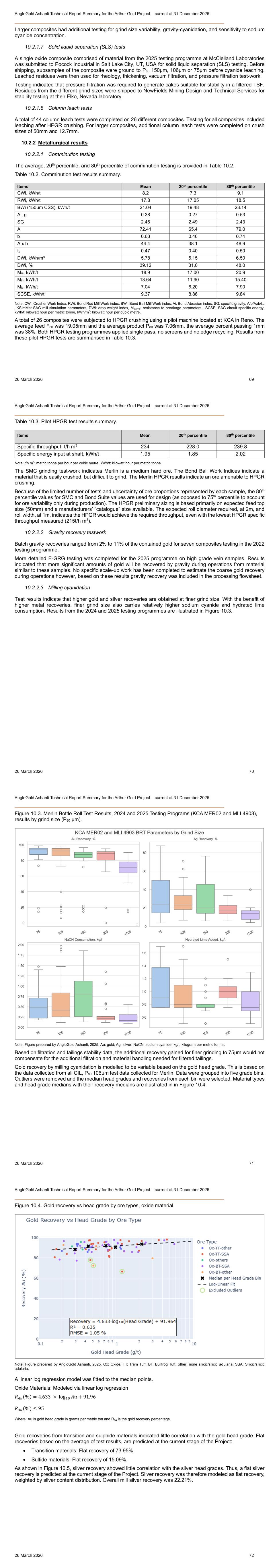 AngloGold Ashanti Technical Report Summary for the Arthur Gold Project – current at 31 December 2025 __________________________________________________________________________________________ 26 March 2026 69 Larger composites had additional testing for grind size variability, gravity-cyanidation, and sensitivity to sodium cyanide concentration. 10.2.1.7 Solid liquid separation (SLS) tests A single oxide composite comprised of material from the 2025 testing programme at McClelland Laboratories was submitted to Pocock Industrial in Salt Lake City, UT, USA for solid liquid separation (SLS) testing. Before shipping, subsamples of the composite were ground to P80 150µm, 106µm or 75µm before cyanide leaching. Leached residues were then used for rheology, thickening, vacuum filtration, and pressure filtration test-work. Testing indicated that pressure filtration was required to generate cakes suitable for stability in a filtered TSF. Residues from the different grind sizes were shipped to NewFields Mining Design and Technical Services for stability testing at their Elko, Nevada laboratory. 10.2.1.8 Column leach tests A total of 44 column leach tests were completed on 26 different composites. Testing for all composites included leaching after HPGR crushing. For larger composites, additional column leach tests were completed on crush sizes of 50mm and 12.7mm. 10.2.2 Metallurgical results 10.2.2.1 Comminution testing The average, 20th percentile, and 80th percentile of comminution testing is provided in Table 10.2. Table 10.2. Comminution test results summary. Items Mean 20th percentile 80th percentile CWi, kWh/t 8.2 7.3 9.1 RWi, kWh/t 17.8 17.05 18.5 BWi (150µm CSS), kWh/t 21.04 19.48 23.14 Ai, g 0.38 0.27 0.53 SG 2.46 2.49 2.43 A 72.41 65.4 79.0 b 0.63 0.46 0.74 A x b 44.4 38.1 48.9 ta 0.47 0.40 0.50 DWi, kWh/m3 5.78 5.15 6.50 DWi, % 39.12 31.0 48.0 Mia, kWh/t 18.9 17.00 20.9 Mih, kWh/t 13.64 11.90 15.40 Mic, kWh/t 7.04 6.20 7.90 SCSE, kWh/t 9.37 8.86 9.84 Note: CWi: Crusher Work Index, RWi: Bond Rod Mill Work index, BWi: Bond Ball Mill Work index, Ai: Bond Abrasion index, SG: specific gravity, A/b/Axb/ta: JKSimMet SAG mill simulation parameters, DWi: drop weight index, Mia/ih/ic: resistance to breakage parameters, SCSE: SAG circuit specific energy, kWh/t: kilowatt hour per metric tonne, kWh/m3: kilowatt hour per cubic metre. A total of 26 composites were subjected to HPGR crushing using a pilot machine located at KCA in Reno. The average feed F80 was 19.05mm and the average product P80 was 7.06mm, the average percent passing 1mm was 38%. Both HPGR testing programmes applied single pass, no screens and no edge recycling. Results from these pilot HPGR tests are summarised in Table 10.3. AngloGold Ashanti Technical Report Summary for the Arthur Gold Project – current at 31 December 2025 __________________________________________________________________________________________ 26 March 2026 70 Table 10.3. Pilot HPGR test results summary. Items Mean 20th percentile 80th percentile Specific throughput, t/h m3 234 228.0 239.8 Specific energy input at shaft, kWh/t 1.95 1.85 2.02 Note: t/h m3: metric tonne per hour per cubic metre, kWh/t: kilowatt hour per metric tonne. The SMC grinding test-work indicates Merlin is a medium hard ore. The Bond Ball Work Indices indicate a material that is easily crushed, but difficult to grind. The Merlin HPGR results indicate an ore amenable to HPGR crushing. Because of the limited number of tests and uncertainty of ore proportions represented by each sample, the 80th percentile values for SMC and Bond Suite values are used for design (as opposed to 75th percentile to account for ore variability only during production). The HPGR preliminary sizing is based primarily on expected feed top size (50mm) and a manufacturers’ “catalogue” size available. The expected roll diameter required, at 2m, and roll width, at 1m, indicates the HPGR would achieve the required throughput, even with the lowest HPGR specific throughput measured (215t/h m3). 10.2.2.2 Gravity recovery testwork Batch gravity recoveries ranged from 2% to 11% of the contained gold for seven composites testing in the 2022 testing programme. More detailed E-GRG testing was completed for the 2025 programme on high grade vein samples. Results indicated that more significant amounts of gold will be recovered by gravity during operations from material similar to these samples. No specific scale-up work has been completed to estimate the coarse gold recovery during operations however, based on these results gravity recovery was included in the processing flowsheet. 10.2.2.3 Milling cyanidation Test results indicate that higher gold and silver recoveries are obtained at finer grind size. With the benefit of higher metal recoveries, finer grind size also carries relatively higher sodium cyanide and hydrated lime consumption. Results from the 2024 and 2025 testing programmes are illustrated in Figure 10.3. AngloGold Ashanti Technical Report Summary for the Arthur Gold Project – current at 31 December 2025 __________________________________________________________________________________________ 26 March 2026 71 Figure 10.3. Merlin Bottle Roll Test Results, 2024 and 2025 Testing Programs (KCA MER02 and MLI 4903), results by grind size (P80 µm). Note: Figure prepared by AngloGold Ashanti, 2025. Au: gold; Ag: silver: NaCN: sodium cyanide; kg/t: kilogram per metric tonne. Based on filtration and tailings stability data, the additional recovery gained for finer grinding to 75µm would not compensate for the additional filtration and material handling needed for filtered tailings. Gold recovery by milling cyanidation is modelled to be variable based on the gold head grade. This is based on the data collected from all CIL, P80 106µm test data collected for Merlin. Data were grouped into five grade bins. Outliers were removed and the median head grades and recoveries from each bin were selected. Material types 
