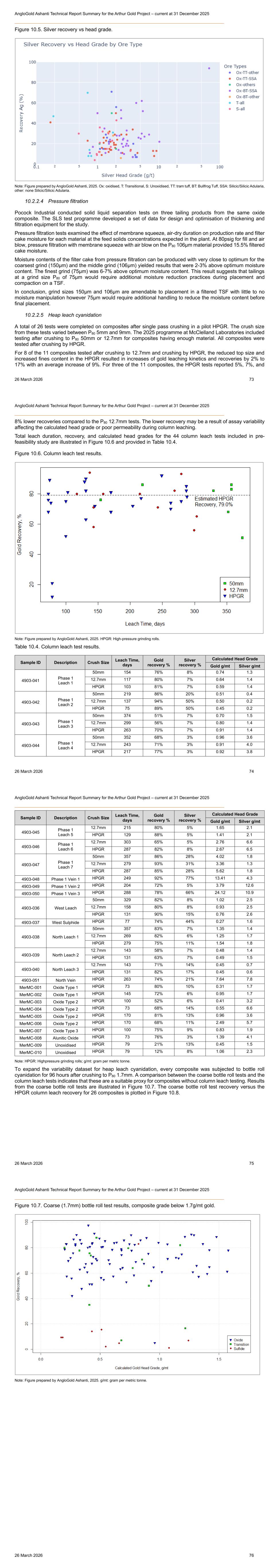 AngloGold Ashanti Technical Report Summary for the Arthur Gold Project – current at 31 December 2025 __________________________________________________________________________________________ 26 March 2026 73 Figure 10.5. Silver recovery vs head grade. Note: Figure prepared by AngloGold Ashanti, 2025. Ox: oxidised, T: Transitional, S: Unoxidised, TT: tram tuff, BT: Bullfrog Tuff, SSA: Silicic/Silicic Adularia, other: none Silicic/Silicic Adularia. 10.2.2.4 Pressure filtration Pocock Industrial conducted solid liquid separation tests on three tailing products from the same oxide composite. The SLS test programme developed a set of data for design and optimisation of thickening and filtration equipment for the study. Pressure filtration tests examined the effect of membrane squeeze, air-dry duration on production rate and filter cake moisture for each material at the feed solids concentrations expected in the plant. At 80psig for fill and air blow, pressure filtration with membrane squeeze with air blow on the P80 106µm material provided 15.5% filtered cake moisture. Moisture contents of the filter cake from pressure filtration can be produced with very close to optimum for the coarsest grind (150µm) and the middle grind (106µm) yielded results that were 2-3% above optimum moisture content. The finest grind (75µm) was 6-7% above optimum moisture content. This result suggests that tailings at a grind size P80 of 75µm would require additional moisture reduction practices during placement and compaction on a TSF. In conclusion, grind sizes 150µm and 106µm are amendable to placement in a filtered TSF with little to no moisture manipulation however 75µm would require additional handling to reduce the moisture content before final placement. 10.2.2.5 Heap leach cyanidation A total of 26 tests were completed on composites after single pass crushing in a pilot HPGR. The crush size from these tests varied between P80 5mm and 9mm. The 2025 programme at McClelland Laboratories included testing after crushing to P80 50mm or 12.7mm for composites having enough material. All composites were tested after crushing by HPGR. For 8 of the 11 composites tested after crushing to 12.7mm and crushing by HPGR, the reduced top size and increased fines content in the HPGR resulted in increases of gold leaching kinetics and recoveries by 2% to 17% with an average increase of 9%. For three of the 11 composites, the HPGR tests reported 5%, 7%, and AngloGold Ashanti Technical Report Summary for the Arthur Gold Project – current at 31 December 2025 __________________________________________________________________________________________ 26 March 2026 74 8% lower recoveries compared to the P80 12.7mm tests. The lower recovery may be a result of assay variability affecting the calculated head grade or poor permeability during column leaching. Total leach duration, recovery, and calculated head grades for the 44 column leach tests included in pre- feasibility study are illustrated in Figure 10.6 and provided in Table 10.4. Figure 10.6. Column leach test results. Note: Figure prepared by AngloGold Ashanti, 2025. HPGR: High-pressure grinding rolls. Table 10.4. Column leach test results. Sample ID Description Crush Size Leach Time, days Gold recovery % Silver recovery % Calculated Head Grade Gold g/mt Silver g/mt 4903-041 Phase 1 Leach 1 50mm 154 76% 8% 0.74 1.3 12.7mm 117 80% 7% 0.64 1.4 HPGR 103 81% 7% 0.59 1.4 4903-042 Phase 1 Leach 2 50mm 219 86% 20% 0.51 0.4 12.7mm 137 94% 50% 0.50 0.2 HPGR 75 89% 50% 0.45 0.2 4903-043 Phase 1 Leach 3 50mm 374 51% 7% 0.70 1.5 12.7mm 299 56% 7% 0.80 1.4 HPGR 263 70% 7% 0.91 1.4 4903-044 Phase 1 Leach 4 50mm 352 68% 3% 0.96 3.6 12.7mm 243 71% 3% 0.91 4.0 HPGR 217 77% 3% 0.92 3.8 AngloGold Ashanti Technical Report Summary for the Arthur Gold Project – current at 31 December 2025 __________________________________________________________________________________________ 26 March 2026 75 Sample ID Description Crush Size Leach Time, days Gold recovery % Silver recovery % Calculated Head Grade Gold g/mt Silver g/mt 4903-045 Phase 1 Leach 5 12.7mm 215 80% 5% 1.65 2.1 HPGR 129 88% 5% 1.41 2.1 4903-046 Phase 1 Leach 6 12.7mm 303 65% 5% 2.76 6.6 HPGR 287 82% 8% 2.67 6.5 4903-047 Phase 1 Leach 7 50mm 357 86% 28% 4.02 1.8 12.7mm 279 93% 31% 3.36 1.3 HPGR 287 85% 28% 5.62 1.8 4903-048 Phase 1 Vein 1 HPGR 249 92% 77% 13.41 4.3 4903-049 Phase 1 Vein 2 HPGR 204 72% 5% 3.79 12.6 4903-050 Phase 1 Vein 3 HPGR 288 78% 66% 24.12 10.9 4903-036 West Leach 50mm 329 82% 8% 1.02 2.5 12.7mm 158 80% 8% 0.93 2.5 HPGR 131 90% 15% 0.76 2.6 4903-037 West Sulphide HPGR 77 74% 44% 0.27 1.6 4903-038 North Leach 1 50mm 357 83% 7% 1.35 1.4 12.7mm 269 82% 6% 1.25 1.7 HPGR 279 75% 11% 1.54 1.8 4903-039 North Leach 2 12.7mm 143 58% 7% 0.48 1.4 HPGR 131 63% 7% 0.49 1.5 4903-040 North Leach 3 12.7mm 143 71% 14% 0.45 0.7 HPGR 131 82% 17% 0.45 0.6 4903-051 North Vein HPGR 263 74% 21% 7.64 7.8 MerMC-001 Oxide Type 1 HPGR 73 80% 10% 0.31 1.7 MerMC-002 Oxide Type 1 HPGR 145 72% 6% 0.95 1.7 MerMC-003 Oxide Type 2 HPGR 100 52% 6% 0.41 3.2 MerMC-004 Oxide Type 2 HPGR 73 68% 14% 0.55 6.6 MerMC-005 Oxide Type 2 HPGR 170 81% 13% 0.96 3.6 MerMC-006 Oxide Type 2 HPGR 170 68% 11% 2.49 5.7 MerMC-007 Oxide Type 3 HPGR 100 75% 9% 0.83 1.9 MerMC-008 Alunitic Oxide HPGR 73 76% 3% 1.39 4.1 MerMC-009 Unoxidised HPGR 79 21% 13% 0.45 1.5 MerMC-010 Unoxidised HPGR 79 12% 8% 1.06 2.3 Note: HPGR: Highpressure grinding rolls; g/mt: gram per metric tonne. To expand the variability dataset for heap leach cyanidation, every composite was subjected to bottle roll cyanidation for 96 hours after crushing to P80 1.7mm. A comparison between the coarse bottle roll tests and the column leach tests indicates that these are a suitable proxy for composites without column leach testing. Results from the coarse bottle roll tests are illustrated in Figure 10.7. The coarse bottle roll test recovery versus the HPGR column leach recovery for 26 composites is pl