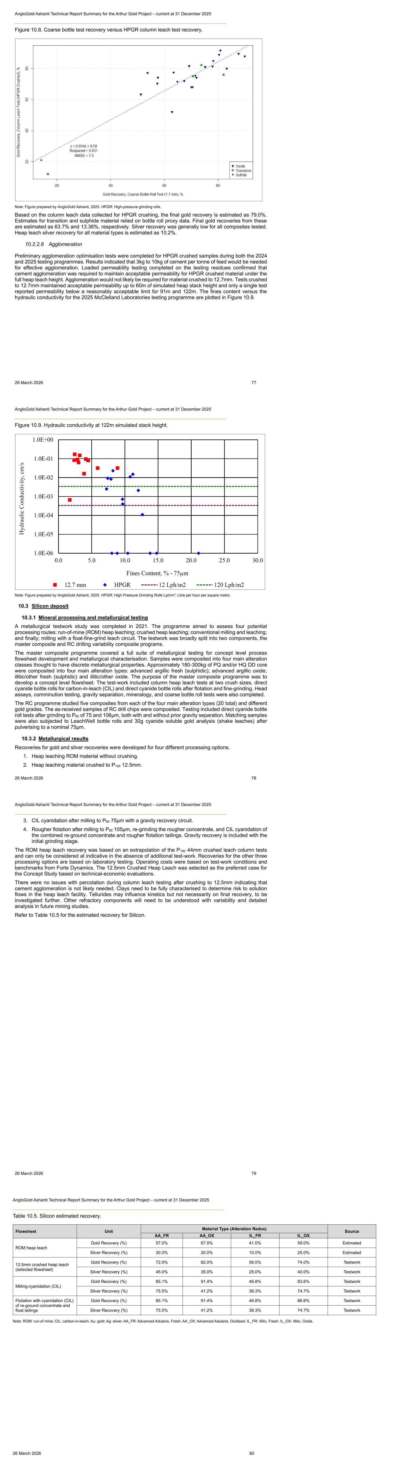 AngloGold Ashanti Technical Report Summary for the Arthur Gold Project – current at 31 December 2025 __________________________________________________________________________________________ 26 March 2026 77 Figure 10.8. Coarse bottle test recovery versus HPGR column leach test recovery. Note: Figure prepared by AngloGold Ashanti, 2025. HPGR: High-pressure grinding rolls. Based on the column leach data collected for HPGR crushing, the final gold recovery is estimated as 79.0%. Estimates for transition and sulphide material relied on bottle roll proxy data. Final gold recoveries from these are estimated as 63.7% and 13.36%, respectively. Silver recovery was generally low for all composites tested. Heap leach silver recovery for all material types is estimated as 10.2%. 10.2.2.6 Agglomeration Preliminary agglomeration optimisation tests were completed for HPGR crushed samples during both the 2024 and 2025 testing programmes. Results indicated that 3kg to 10kg of cement per tonne of feed would be needed for effective agglomeration. Loaded permeability testing completed on the testing residues confirmed that cement agglomeration was required to maintain acceptable permeability for HPGR crushed material under the full heap leach height. Agglomeration would not likely be required for material crushed to 12.7mm. Tests crushed to 12.7mm maintained acceptable permeability up to 60m of simulated heap stack height and only a single test reported permeability below a reasonably acceptable limit for 91m and 122m. The fines content versus the hydraulic conductivity for the 2025 McClelland Laboratories testing programme are plotted in Figure 10.9. AngloGold Ashanti Technical Report Summary for the Arthur Gold Project – current at 31 December 2025 __________________________________________________________________________________________ 26 March 2026 78 Figure 10.9. Hydraulic conductivity at 122m simulated stack height. Note: Figure prepared by AngloGold Ashanti, 2025. HPGR: High Pressure Grinding Rolls Lph/m2: Litre per hour per square metre. 10.3 Silicon deposit 10.3.1 Mineral processing and metallurgical testing A metallurgical testwork study was completed in 2021. The programme aimed to assess four potential processing routes: run-of-mine (ROM) heap leaching; crushed heap leaching; conventional milling and leaching; and finally; milling with a float-fine-grind leach circuit. The testwork was broadly split into two components, the master composite and RC drilling variability composite programs. The master composite programme covered a full suite of metallurgical testing for concept level process flowsheet development and metallurgical characterisation. Samples were composited into four main alteration classes thought to have discrete metallurgical properties. Approximately 180-300kg of PQ and/or HQ DD core were composited into four main alteration types: advanced argillic fresh (sulphidic); advanced argillic oxide; illitic/other fresh (sulphidic) and illitic/other oxide. The purpose of the master composite programme was to develop a concept level flowsheet. The test-work included column heap leach tests at two crush sizes, direct cyanide bottle rolls for carbon-in-leach (CIL) and direct cyanide bottle rolls after flotation and fine-grinding. Head assays, comminution testing, gravity separation, mineralogy, and coarse bottle roll tests were also completed. The RC programme studied five composites from each of the four main alteration types (20 total) and different gold grades. The as-received samples of RC drill chips were composited. Testing included direct cyanide bottle roll tests after grinding to P80 of 75 and 106µm, both with and without prior gravity separation. Matching samples were also subjected to LeachWell bottle rolls and 30g cyanide soluble gold analysis (shake leaches) after pulverising to a nominal 75µm. 10.3.2 Metallurgical results Recoveries for gold and silver recoveries were developed for four different processing options. 1. Heap leaching ROM material without crushing. 2. Heap leaching material crushed to P100 12.5mm. AngloGold Ashanti Technical Report Summary for the Arthur Gold Project – current at 31 December 2025 __________________________________________________________________________________________ 26 March 2026 79 3. CIL cyanidation after milling to P80 75µm with a gravity recovery circuit. 4. Rougher flotation after milling to P80 105µm, re-grinding the rougher concentrate, and CIL cyanidation of the combined re-ground concentrate and rougher flotation tailings. Gravity recovery is included with the initial grinding stage. The ROM heap leach recovery was based on an extrapolation of the P100 44mm crushed leach column tests and can only be considered at indicative in the absence of additional test-work. Recoveries for the other three processing options are based on laboratory testing. Operating costs were based on test-work conditions and benchmarks from Forte Dynamics. The 12.5mm Crushed Heap Leach was selected as the preferred case for the Concept Study based on technical-economic evaluations. There were no issues with percolation during column leach testing after crushing to 12.5mm indicating that cement agglomeration is not likely needed. Clays need to be fully characterised to determine risk to solution flows in the heap leach facility. Tellurides may influence kinetics but not necessarily on final recovery, to be investigated further. Other refractory components will need to be understood with variability and detailed analysis in future mining studies. Refer to Table 10.5 for the estimated recovery for Silicon. AngloGold Ashanti Technical Report Summary for the Arthur Gold Project – current at 31 December 2025 __________________________________________________________________________________________ 26 March 2026 80 Table 10.5. Silicon estimated recovery. Flowsheet Unit Material Type (Alteration Redox) Source AA_FR AA_OX IL_FR IL_OX ROM heap leach Gold 