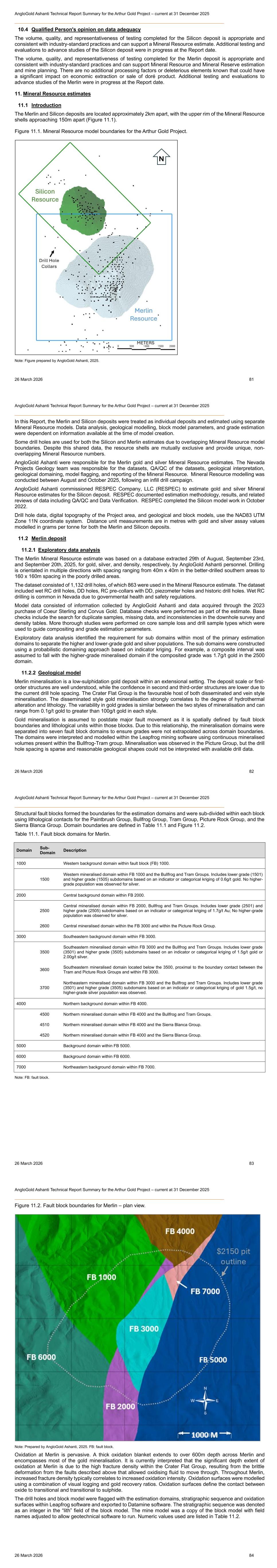 AngloGold Ashanti Technical Report Summary for the Arthur Gold Project – current at 31 December 2025 __________________________________________________________________________________________ 26 March 2026 81 10.4 Qualified Person's opinion on data adequacy The volume, quality, and representativeness of testing completed for the Silicon deposit is appropriate and consistent with industry-standard practices and can support a Mineral Resource estimate. Additional testing and evaluations to advance studies of the Silicon deposit were in progress at the Report date. The volume, quality, and representativeness of testing completed for the Merlin deposit is appropriate and consistent with industry-standard practices and can support Mineral Resource and Mineral Reserve estimation and mine planning. There are no additional processing factors or deleterious elements known that could have a significant impact on economic extraction or sale of doré product. Additional testing and evaluations to advance studies of the Merlin were in progress at the Report date. 11. Mineral Resource estimates 11.1 Introduction The Merlin and Silicon deposits are located approximately 2km apart, with the upper rim of the Mineral Resource shells approaching 150m apart (Figure 11.1). Figure 11.1. Mineral Resource model boundaries for the Arthur Gold Project. Note: Figure prepared by AngloGold Ashanti, 2025. AngloGold Ashanti Technical Report Summary for the Arthur Gold Project – current at 31 December 2025 __________________________________________________________________________________________ 26 March 2026 82 In this Report, the Merlin and Silicon deposits were treated as individual deposits and estimated using separate Mineral Resource models. Data analysis, geological modelling, block model parameters, and grade estimation were dependent on information available at the time of model creation. Some drill holes are used for both the Silicon and Merlin estimates due to overlapping Mineral Resource model boundaries. Despite this shared data, the resource shells are mutually exclusive and provide unique, non- overlapping Mineral Resource numbers. AngloGold Ashanti were responsible for the Merlin gold and silver Mineral Resource estimates. The Nevada Projects Geology team was responsible for the datasets, QA/QC of the datasets, geological interpretation, geological domaining, model flagging, and reporting of the Mineral Resource. Mineral Resource modelling was conducted between August and October 2025, following an infill drill campaign. AngloGold Ashanti commissioned RESPEC Company, LLC (RESPEC) to estimate gold and silver Mineral Resource estimates for the Silicon deposit. RESPEC documented estimation methodology, results, and related reviews of data including QA/QC and Data Verification. RESPEC completed the Silicon model work in October 2022. Drill hole data, digital topography of the Project area, and geological and block models, use the NAD83 UTM Zone 11N coordinate system. Distance unit measurements are in metres with gold and silver assay values modelled in grams per tonne for both the Merlin and Silicon deposits. 11.2 Merlin deposit 11.2.1 Exploratory data analysis The Merlin Mineral Resource estimate was based on a database extracted 29th of August, September 23rd, and September 20th, 2025, for gold, silver, and density, respectively, by AngloGold Ashanti personnel. Drilling is orientated in multiple directions with spacing ranging from 40m x 40m in the better-drilled southern areas to 160 x 160m spacing in the poorly drilled areas. The dataset consisted of 1,132 drill holes, of which 863 were used in the Mineral Resource estimate. The dataset included wet RC drill holes, DD holes, RC pre-collars with DD, piezometer holes and historic drill holes. Wet RC drilling is common in Nevada due to governmental health and safety regulations. Model data consisted of information collected by AngloGold Ashanti and data acquired through the 2023 purchase of Coeur Sterling and Corvus Gold. Database checks were performed as part of the estimate. Base checks include the search for duplicate samples, missing data, and inconsistencies in the downhole survey and density tables. More thorough studies were performed on core sample loss and drill sample types which were used to guide compositing and grade estimation parameters. Exploratory data analysis identified the requirement for sub domains within most of the primary estimation domains to separate the higher and lower-grade gold and silver populations. The sub domains were constructed using a probabilistic domaining approach based on indicator kriging. For example, a composite interval was assumed to fall with the higher-grade mineralised domain if the composited grade was 1.7g/t gold in the 2500 domain. 11.2.2 Geological model Merlin mineralisation is a low-sulphidation gold deposit within an extensional setting. The deposit scale or first- order structures are well understood, while the confidence in second and third-order structures are lower due to the current drill hole spacing. The Crater Flat Group is the favourable host of both disseminated and vein style mineralisation. The disseminated style gold mineralisation strongly correlates to the degree of hydrothermal alteration and lithology. The variability in gold grades is similar between the two styles of mineralisation and can range from 0.1g/t gold to greater than 100g/t gold in each style. Gold mineralisation is assumed to postdate major fault movement as it is spatially defined by fault block boundaries and lithological units within those blocks. Due to this relationship, the mineralisation domains were separated into seven fault block domains to ensure grades were not extrapolated across domain boundaries. The domains were interpreted and modelled within the Leapfrog mining software using continuous mineralised volumes present within the Bullfrog-Tram group. Mineralisation was observed in the Picture Group, but