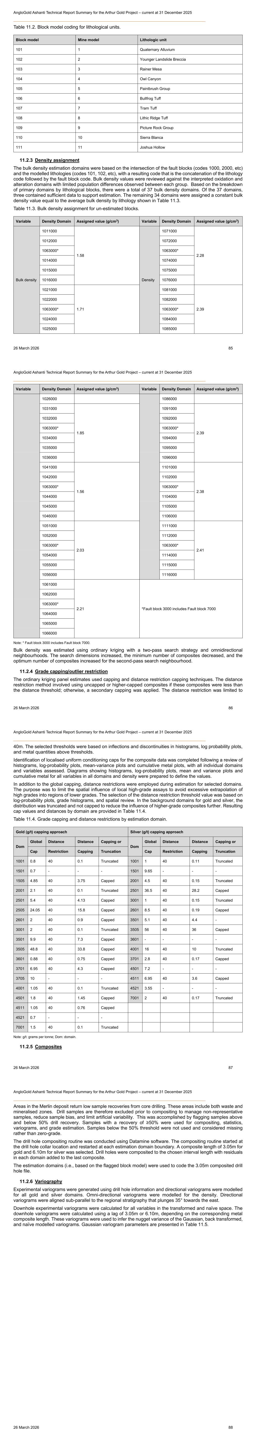 AngloGold Ashanti Technical Report Summary for the Arthur Gold Project – current at 31 December 2025 __________________________________________________________________________________________ 26 March 2026 85 Table 11.2. Block model coding for lithological units. Block model Mine model Lithologic unit 101 1 Quaternary Alluvium 102 2 Younger Landslide Breccia 103 3 Rainer Mesa 104 4 Owl Canyon 105 5 Paintbrush Group 106 6 Bullfrog Tuff 107 7 Tram Tuff 108 8 Lithic Ridge Tuff 109 9 Picture Rock Group 110 10 Sierra Blanca 111 11 Joshua Hollow 11.2.3 Density assignment The bulk density estimation domains were based on the intersection of the fault blocks (codes 1000, 2000, etc) and the modelled lithologies (codes 101, 102, etc), with a resulting code that is the concatenation of the lithology code followed by the fault block code. Bulk density values were reviewed against the interpreted oxidation and alteration domains with limited population differences observed between each group. Based on the breakdown of primary domains by lithological blocks, there were a total of 37 bulk density domains. Of the 37 domains, three contained sufficient data to support estimation. The remaining 34 domains were assigned a constant bulk density value equal to the average bulk density by lithology shown in Table 11.3. Table 11.3. Bulk density assignment for un-estimated blocks. Variable Density Domain Assigned value (g/cm3) Variable Density Domain Assigned value (g/cm3) Bulk density 1011000 1.58 Density 1071000 2.28 1012000 1072000 1063000* 1063000* 1014000 1074000 1015000 1075000 1016000 1076000 1021000 1.71 1081000 2.39 1022000 1082000 1063000* 1063000* 1024000 1084000 1025000 1085000 AngloGold Ashanti Technical Report Summary for the Arthur Gold Project – current at 31 December 2025 __________________________________________________________________________________________ 26 March 2026 86 Variable Density Domain Assigned value (g/cm3) Variable Density Domain Assigned value (g/cm3) 1026000 1086000 1031000 1.85 1091000 2.39 1032000 1092000 1063000* 1063000* 1034000 1094000 1035000 1095000 1036000 1096000 1041000 1.56 1101000 2.38 1042000 1102000 1063000* 1063000* 1044000 1104000 1045000 1105000 1046000 1106000 1051000 2.03 1111000 2.41 1052000 1112000 1063000* 1063000* 1054000 1114000 1055000 1115000 1056000 1116000 1061000 2.21 *Fault block 3000 includes Fault block 7000 1062000 1063000* 1064000 1065000 1066000 Note: * Fault block 3000 includes Fault block 7000. Bulk density was estimated using ordinary kriging with a two-pass search strategy and omnidirectional neighbourhoods. The search dimensions increased, the minimum number of composites decreased, and the optimum number of composites increased for the second-pass search neighbourhood. 11.2.4 Grade capping/outlier restriction The ordinary kriging panel estimates used capping and distance restriction capping techniques. The distance restriction method involved using uncapped or higher-capped composites if these composites were less than the distance threshold; otherwise, a secondary capping was applied. The distance restriction was limited to AngloGold Ashanti Technical Report Summary for the Arthur Gold Project – current at 31 December 2025 __________________________________________________________________________________________ 26 March 2026 87 40m. The selected thresholds were based on inflections and discontinuities in histograms, log probability plots, and metal quantities above thresholds. Identification of localised uniform conditioning caps for the composite data was completed following a review of histograms, log-probability plots, mean-variance plots and cumulative metal plots, with all individual domains and variables assessed. Diagrams showing histograms, log-probability plots, mean and variance plots and cumulative metal for all variables in all domains and density were prepared to define the values. In addition to the global capping, distance restrictions were employed during estimation for selected domains. The purpose was to limit the spatial influence of local high-grade assays to avoid excessive extrapolation of high grades into regions of lower grades. The selection of the distance restriction threshold value was based on log-probability plots, grade histograms, and spatial review. In the background domains for gold and silver, the distribution was truncated and not capped to reduce the influence of higher-grade composites further. Resulting cap values and distances by domain are provided in Table 11.4. Table 11.4. Grade capping and distance restrictions by estimation domain. Gold (g/t) capping approach Silver (g/t) capping approach Dom Global Distance Distance Capping or Dom Global Distance Distance Capping or Cap Restriction Capping Truncation Cap Restriction Capping Truncation 1001 0.8 40 0.1 Truncated 1001 1 40 0.11 Truncated 1501 0.7 - - - 1501 9.65 - - - 1505 4.85 40 3.75 Capped 2001 4.5 40 0.15 Truncated 2001 2.1 40 0.1 Truncated 2501 36.5 40 28.2 Capped 2501 5.4 40 4.13 Capped 3001 1 40 0.15 Truncated 2505 24.05 40 15.8 Capped 2601 8.5 40 0.19 Capped 2601 2 40 0.9 Capped 3501 5.1 40 4.4 - 3001 2 40 0.1 Truncated 3505 56 40 36 Capped 3501 9.9 40 7.3 Capped 3601 - - - - 3505 48.8 40 33.8 Capped 4001 16 40 10 Truncated 3601 0.88 40 0.75 Capped 3701 2.8 40 0.17 Capped 3701 6.95 40 4.3 Capped 4501 7.2 - - - 3705 10 - - - 4511 6.95 40 3.6 Capped 4001 1.05 40 0.1 Truncated 4521 3.55 - - - 4501 1.8 40 1.45 Capped 7001 2 40 0.17 Truncated 4511 1.05 40 0.76 Capped 4521 0.7 - - - 7001 1.5 40 0.1 Truncated Note: g/t: grams per tonne; Dom: domain. 11.2.5 Composites AngloGold Ashanti Technical Report Summary for the Arthur Gold Project – current at 31 December 2025 __________________________________________________________________________________________ 26 March 2026 88 Areas in the Merlin deposit return low sample recoveries from core drilling. These areas include both waste and mineralised zones. Drill samples are therefore exc