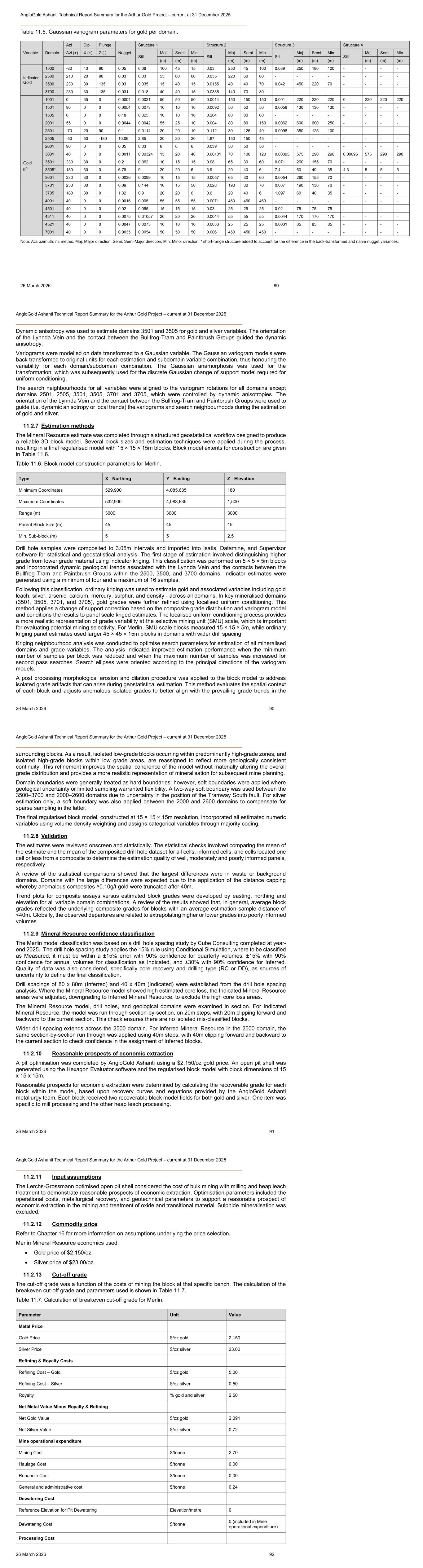 AngloGold Ashanti Technical Report Summary for the Arthur Gold Project – current at 31 December 2025 __________________________________________________________________________________________ 26 March 2026 89 Table 11.5. Gaussian variogram parameters for gold per domain. Variable Domain Azi Dip Plunge Nugget Structure 1 Structure 2 Structure 3 Structure 4 Azi (+) X (+) Z (-) Sill Maj Semi Min Sill Maj Semi Min Sill Maj Semi Min Sill Maj Semi Min (m) (m) (m) (m) (m) (m) (m) (m) (m) (m) (m) (m) Indicator Gold 1500 -80 40 90 0.05 0.08 100 45 15 0.03 250 45 100 0.089 250 180 100 - - - - 2500 210 20 90 0.03 0.03 55 60 60 0.035 220 60 60 - - - - - - - - 3500 230 30 135 0.03 0.035 15 40 15 0.0155 40 40 70 0.042 450 220 70 - - - - 3700 230 30 135 0.031 0.018 40 40 15 0.0335 140 70 30 - - - - - - - - Gold g/t 1001 0 35 0 0.0004 0.0021 50 50 50 0.0014 150 150 150 0.001 220 220 220 0 220 220 220 1501 90 0 0 0.0054 0.0073 10 10 10 0.0092 50 50 50 0.0058 130 130 130 - - - - 1505 0 0 0 0.18 0.325 10 10 10 0.264 80 80 60 - - - - - - - - 2001 55 0 0 0.0044 0.0042 55 25 10 0.004 80 80 150 0.0062 600 600 250 - - - - 2501 -70 20 90 0.1 0.0114 20 20 10 0.112 30 125 40 0.0998 350 125 100 - - - - 2505 -50 50 -180 10.06 2.85 20 20 20 4.87 150 150 45 - - - - - - - - 2601 90 0 0 0.05 0.03 6 6 6 0.039 50 50 50 - - - - - - - - 3001 40 0 0 0.0011 0.00324 15 20 40 0.00101 70 100 120 0.00095 575 290 290 0.00095 575 290 290 3501 230 30 0 0.2 0.062 10 15 15 0.08 65 30 60 0.071 260 155 70 - - - - 3505* 180 30 0 6.79 9 20 20 6 3.9 20 40 6 7.4 60 40 35 4.3 5 5 5 3601 230 30 0 0.0036 0.0099 10 15 15 0.0057 65 30 60 0.0054 260 155 70 - - - - 3701 230 30 0 0.09 0.144 10 15 50 0.028 190 30 70 0.087 190 130 70 - - - - 3705 180 30 0 1.32 0.9 20 20 6 0.6 20 40 6 1.097 60 40 35 - - - - 4001 40 0 0 0.0016 0.005 55 55 55 0.0071 460 460 460 - - - - - - - - 4501 40 0 0 0.02 0.055 15 15 15 0.03 25 25 25 0.02 75 75 75 - - - - 4511 40 0 0 0.0075 0.01057 20 20 20 0.0044 55 55 55 0.0044 170 170 170 - - - - 4521 40 0 0 0.0047 0.0075 10 10 10 0.0033 25 25 25 0.0031 85 85 85 - - - - 7001 40 0 0 0.0035 0.0054 50 50 50 0.006 450 450 450 - - - - - - - - Note: Azi: azimuth; m: metres; Maj: Major direction; Semi: Semi-Major direction; Min: Minor direction; * short-range structure added to account for the difference in the back-transformed and naïve nugget variances. AngloGold Ashanti Technical Report Summary for the Arthur Gold Project – current at 31 December 2025 __________________________________________________________________________________________ 26 March 2026 90 Dynamic anisotropy was used to estimate domains 3501 and 3505 for gold and silver variables. The orientation of the Lynnda Vein and the contact between the Bullfrog-Tram and Paintbrush Groups guided the dynamic anisotropy. Variograms were modelled on data transformed to a Gaussian variable. The Gaussian variogram models were back transformed to original units for each estimation and subdomain variable combination, thus honouring the variability for each domain/subdomain combination. The Gaussian anamorphosis was used for the transformation, which was subsequently used for the discrete Gaussian change of support model required for uniform conditioning. The search neighbourhoods for all variables were aligned to the variogram rotations for all domains except domains 2501, 2505, 3501, 3505, 3701 and 3705, which were controlled by dynamic anisotropies. The orientation of the Lynnda Vein and the contact between the Bullfrog-Tram and Paintbrush Groups were used to guide (i.e. dynamic anisotropy or local trends) the variograms and search neighbourhoods during the estimation of gold and silver. 11.2.7 Estimation methods The Mineral Resource estimate was completed through a structured geostatistical workflow designed to produce a reliable 3D block model. Several block sizes and estimation techniques were applied during the process, resulting in a final regularised model with 15 × 15 × 15m blocks. Block model extents for construction are given in Table 11.6. Table 11.6. Block model construction parameters for Merlin. Type X - Northing Y - Easting Z - Elevation Minimum Coordinates 529,900 4,085,635 180 Maximum Coordinates 532,900 4,088,635 1,500 Range (m) 3000 3000 3000 Parent Block Size (m) 45 45 15 Min. Sub-block (m) 5 5 2.5 Drill hole samples were composited to 3.05m intervals and imported into Isatis, Datamine, and Supervisor software for statistical and geostatistical analysis. The first stage of estimation involved distinguishing higher grade from lower grade material using indicator kriging. This classification was performed on 5 × 5 × 5m blocks and incorporated dynamic geological trends associated with the Lynnda Vein and the contacts between the Bullfrog Tram and Paintbrush Groups within the 2500, 3500, and 3700 domains. Indicator estimates were generated using a minimum of four and a maximum of 16 samples. Following this classification, ordinary kriging was used to estimate gold and associated variables including gold leach, silver, arsenic, calcium, mercury, sulphur, and density - across all domains. In key mineralised domains (3501, 3505, 3701, and 3705), gold grades were further refined using localised uniform conditioning. This method applies a change of support correction based on the composite grade distribution and variogram model and conditions the results to panel scale kriged estimates. The localised uniform conditioning process provides a more realistic representation of grade variability at the selective mining unit (SMU) scale, which is important for evaluating potential mining selectivity. For Merlin, SMU scale blocks measured 15 × 15 × 5m, while ordinary kriging panel estimates used larger 45 × 45 × 15m blocks in domains with wider drill spacing. Kriging neighbourhood analysis was conducted to optimise search parameters for estimation of all mineralised domains and grade variables. The analysis indicated improved estimation performance when the minimum 