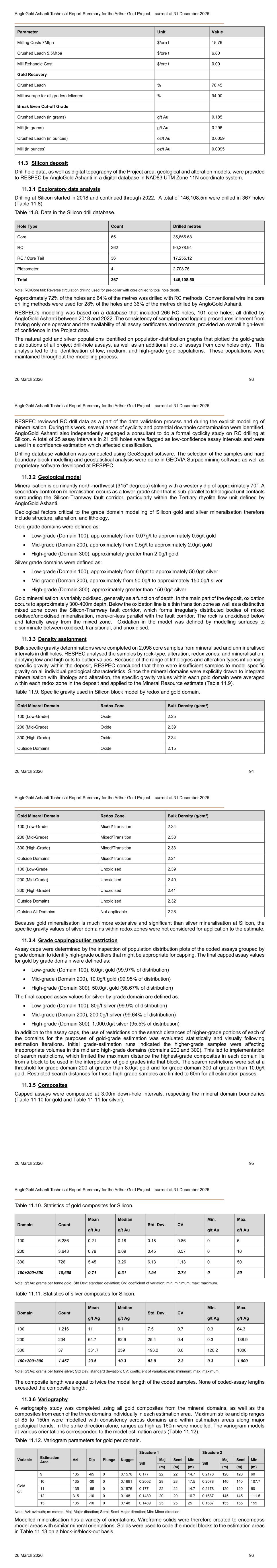 AngloGold Ashanti Technical Report Summary for the Arthur Gold Project – current at 31 December 2025 __________________________________________________________________________________________ 26 March 2026 93 Parameter Unit Value Milling Costs 7Mtpa $/ore t 15.76 Crushed Leach 5.5Mtpa $/ore t 6.80 Mill Rehandle Cost $/ore t 0.00 Gold Recovery Crushed Leach % 78.45 Mill average for all grades delivered % 94.00 Break Even Cut-off Grade Crushed Leach (in grams) g/t Au 0.185 Mill (in grams) g/t Au 0.296 Crushed Leach (in ounces) oz/t Au 0.0059 Mill (in ounces) oz/t Au 0.0095 11.3 Silicon deposit Drill hole data, as well as digital topography of the Project area, geological and alteration models, were provided to RESPEC by AngloGold Ashanti in a digital database in NAD83 UTM Zone 11N coordinate system. 11.3.1 Exploratory data analysis Drilling at Silicon started in 2018 and continued through 2022. A total of 146,108.5m were drilled in 367 holes (Table 11.8). Table 11.8. Data in the Silicon drill database. Hole Type Count Drilled metres Core 65 35,865.68 RC 262 90,278.94 RC / Core Tail 36 17,255.12 Piezometer 4 2,708.76 Total 367 146,108.50 Note: RC/Core tail: Reverse circulation drilling used for pre-collar with core drilled to total hole depth. Approximately 72% of the holes and 64% of the metres was drilled with RC methods. Conventional wireline core drilling methods were used for 28% of the holes and 36% of the metres drilled by AngloGold Ashanti. RESPEC’s modelling was based on a database that included 266 RC holes, 101 core holes, all drilled by AngloGold Ashanti between 2018 and 2022. The consistency of sampling and logging procedures inherent from having only one operator and the availability of all assay certificates and records, provided an overall high-level of confidence in the Project data. The natural gold and silver populations identified on population-distribution graphs that plotted the gold-grade distributions of all project drill-hole assays, as well as an additional plot of assays from core holes only. This analysis led to the identification of low, medium, and high-grade gold populations. These populations were maintained throughout the modelling process. AngloGold Ashanti Technical Report Summary for the Arthur Gold Project – current at 31 December 2025 __________________________________________________________________________________________ 26 March 2026 94 RESPEC reviewed RC drill data as a part of the data validation process and during the explicit modelling of mineralisation. During this work, several areas of cyclicity and potential downhole contamination were identified. AngloGold Ashanti also independently engaged a consultant to do a formal cyclicity study on RC drilling at Silicon. A total of 25 assay intervals in 21 drill holes were flagged as low-confidence assay intervals and were used in a confidence estimation which affected classification. Drilling database validation was conducted using GeoSequel software. The selection of the samples and hard boundary block modelling and geostatistical analysis were done in GEOVIA Surpac mining software as well as proprietary software developed at RESPEC. 11.3.2 Geological model Mineralisation is dominantly north-northwest (315° degrees) striking with a westerly dip of approximately 70°. A secondary control on mineralisation occurs as a lower-grade shell that is sub-parallel to lithological unit contacts surrounding the Silicon-Tramway fault corridor, particularly within the Tertiary rhyolite flow unit defined by AngloGold Ashanti. Geological factors critical to the grade domain modelling of Silicon gold and silver mineralisation therefore include structure, alteration, and lithology. Gold grade domains were defined as: • Low-grade (Domain 100), approximately from 0.07g/t to approximately 0.5g/t gold • Mid-grade (Domain 200), approximately from 0.5g/t to approximately 2.0g/t gold • High-grade (Domain 300), approximately greater than 2.0g/t gold Silver grade domains were defined as: • Low-grade (Domain 100), approximately from 6.0g/t to approximately 50.0g/t silver • Mid-grade (Domain 200), approximately from 50.0g/t to approximately 150.0g/t silver • High-grade (Domain 300), approximately greater than 150.0g/t silver Gold mineralisation is variably oxidised, generally as a function of depth. In the main part of the deposit, oxidation occurs to approximately 300-400m depth. Below the oxidation line is a thin transition zone as well as a distinctive mixed zone down the Silicon-Tramway fault corridor, which forms irregularly distributed bodies of mixed oxidised/unoxidised mineralisation, more-or-less parallel with the fault corridor. The rock is unoxidised below and laterally away from the mixed zone. Oxidation in the model was defined by modelling surfaces to discriminate between oxidised, transitional, and unoxidised. 11.3.3 Density assignment Bulk specific gravity determinations were completed on 2,098 core samples from mineralised and unmineralised intervals in drill holes. RESPEC analysed the samples by rock-type, alteration, redox zones, and mineralisation, applying low and high cuts to outlier values. Because of the range of lithologies and alteration types influencing specific gravity within the deposit, RESPEC concluded that there were insufficient samples to model specific gravity on all individual geological characteristics. Since the mineral domains were explicitly drawn to integrate mineralisation with lithology and alteration, the specific gravity values within each gold domain were averaged within each redox zone in the deposit and applied to the Mineral Resource estimate (Table 11.9). Table 11.9. Specific gravity used in Silicon block model by redox and gold domain. Gold Mineral Domain Redox Zone Bulk Density (g/cm3) 100 (Low-Grade) Oxide 2.25 200 (Mid-Grade) Oxide 2.39 300 (High-Grade) Oxide 2.34 Outside Domains Oxide 2.15 AngloGold Ashanti Technical Report Summary for the Arthur Gold Pr