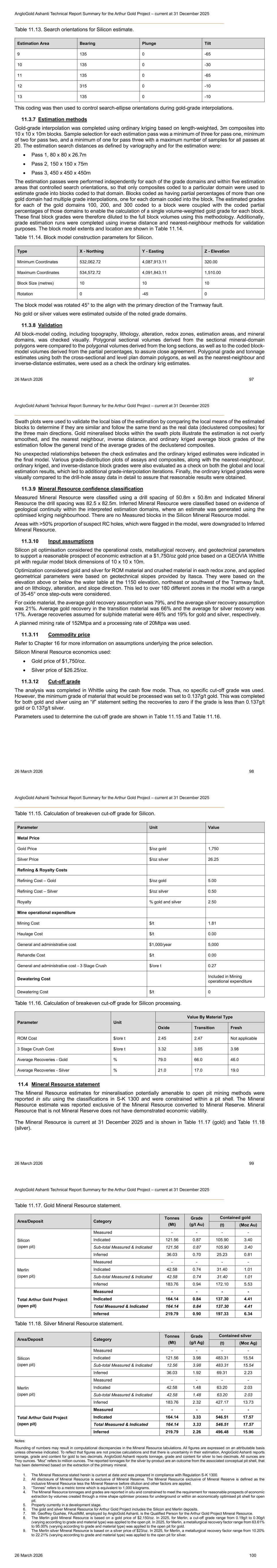 AngloGold Ashanti Technical Report Summary for the Arthur Gold Project – current at 31 December 2025 __________________________________________________________________________________________ 26 March 2026 97 Table 11.13. Search orientations for Silicon estimate. Estimation Area Bearing Plunge Tilt 9 135 0 -65 10 135 0 -30 11 135 0 -65 12 315 0 -10 13 135 0 -10 This coding was then used to control search-ellipse orientations during gold-grade interpolations. 11.3.7 Estimation methods Gold-grade interpolation was completed using ordinary kriging based on length-weighted, 3m composites into 10 x 10 x 10m blocks. Sample selection for each estimation pass was a minimum of three for pass one, minimum of two for pass two, and a minimum of one for pass three with a maximum number of samples for all passes at 20. The estimation search distances as defined by variography and for the estimation were: • Pass 1, 80 x 80 x 26.7m • Pass 2, 150 x 150 x 75m • Pass 3, 450 x 450 x 450m The estimation passes were performed independently for each of the grade domains and within five estimation areas that controlled search orientations, so that only composites coded to a particular domain were used to estimate grade into blocks coded to that domain. Blocks coded as having partial percentages of more than one gold domain had multiple grade interpolations, one for each domain coded into the block. The estimated grades for each of the gold domains 100, 200, and 300 coded to a block were coupled with the coded partial percentages of those domains to enable the calculation of a single volume-weighted gold grade for each block. These final block grades were therefore diluted to the full block volumes using this methodology. Additionally, grade estimation runs were completed using inverse distance and nearest-neighbour methods for validation purposes. The block model extents and location are shown in Table 11.14. Table 11.14. Block model construction parameters for Silicon. Type X - Northing Y - Easting Z - Elevation Minimum Coordinates 532,062.72 4,087,913.11 320.00 Maximum Coordinates 534,572.72 4,091,843.11 1,510.00 Block Size (metres) 10 10 10 Rotation 0 -45 0 The block model was rotated 45° to the align with the primary direction of the Tramway fault. No gold or silver values were estimated outside of the noted grade domains. 11.3.8 Validation All block-model coding, including topography, lithology, alteration, redox zones, estimation areas, and mineral domains, was checked visually. Polygonal sectional volumes derived from the sectional mineral-domain polygons were compared to the polygonal volumes derived from the long sections, as well as to the coded block- model volumes derived from the partial percentages, to assure close agreement. Polygonal grade and tonnage estimates using both the cross-sectional and level plan domain polygons, as well as the nearest-neighbour and inverse-distance estimates, were used as a check the ordinary krig estimates. AngloGold Ashanti Technical Report Summary for the Arthur Gold Project – current at 31 December 2025 __________________________________________________________________________________________ 26 March 2026 98 Swath plots were used to validate the local bias of the estimation by comparing the local means of the estimated blocks to determine if they are similar and follow the same trend as the real data (declustered composites) for the three main directions. Gold mineralised blocks within the swath plots illustrate the estimation is not overly smoothed, and the nearest neighbour, inverse distance, and ordinary kriged average block grades of the estimation follow the general trend of the average grades of the declustered composites. No unexpected relationships between the check estimates and the ordinary kriged estimates were indicated in the final model. Various grade-distribution plots of assays and composites, along with the nearest-neighbour, ordinary kriged, and inverse-distance block grades were also evaluated as a check on both the global and local estimation results, which led to additional grade-interpolation iterations. Finally, the ordinary kriged grades were visually compared to the drill-hole assay data in detail to assure that reasonable results were obtained. 11.3.9 Mineral Resource confidence classification Measured Mineral Resource were classified using a drill spacing of 50.8m x 50.8m and Indicated Mineral Resource the drill spacing was 82.5 x 82.5m. Inferred Mineral Resource were classified based on evidence of geological continuity within the interpreted estimation domains, where an estimate was generated using the optimised kriging neighbourhood. There are no Measured blocks in the Silicon Mineral Resource model. Areas with >50% proportion of suspect RC holes, which were flagged in the model, were downgraded to Inferred Mineral Resource. 11.3.10 Input assumptions Silicon pit optimisation considered the operational costs, metallurgical recovery, and geotechnical parameters to support a reasonable prospect of economic extraction at a $1,750/oz gold price based on a GEOVIA Whittle pit with regular model block dimensions of 10 x 10 x 10m. Optimization considered gold and silver for ROM material and crushed material in each redox zone, and applied geometrical parameters were based on geotechnical slopes provided by Itasca. They were based on the elevation above or below the water table at the 1150 elevation, northeast or southwest of the Tramway fault, and on lithology, alteration, and slope direction. This led to over 180 different zones in the model with a range of 35-45° once step-outs were considered. For oxide material, the average gold recovery assumption was 79%, and the average silver recovery assumption was 21%. Average gold recovery in the transition material was 66% and the average for silver recovery was 17%. Average recoveries assumed for sulphide material were 46% and 19% for gold and silver, respectively. A planned mining ra